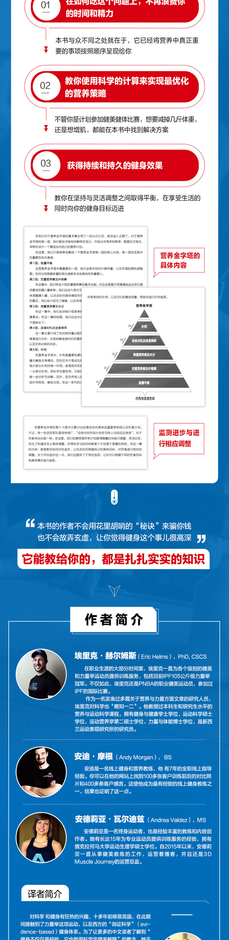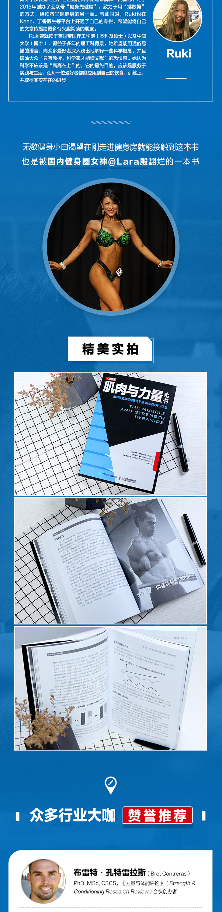 埃里克·赫尔姆斯(Eric Helms),PhD, CSCS 在职业生涯的大部分时间里,埃里克一直为各个级别的健美和力量举运动员提供训练服务,包括目前IPF105公斤级力量举冠 军。不仅如此,埃里克还是PNBA的职业健美运动员,参加过IPF的国际比赛。 作为一名发表过多篇关于营养与力量方面文章的研究人员,埃里克对科学也“略知一二”。他教授过本科生和研究生水平的营养与运动科学课程,拥有健身与健康学士学位、运动科学硕士学位、运动营养学第 二硕士学位、力量与体能博士学位,是新西兰运 动表现研究所的研究员。 安迪·摩根 (Andy Morgan), BS 安迪是一名线上健身和营养教练,他有7年的全职线上指导经验。你可以在他的网站上找到100多张客户训练前后的对比照片和400多条客户感言。这使他成为zui有经验的线上健身教练之一,结果也证明了这一点。 安德莉亚·瓦尔迪兹(Andrea Valdez),MS 安德莉亚是一名终身运动者,也是经验丰富的教练和内容创作者。她有长达15年为专业运动员提供训练服务的经验,拥有俄克拉何马大学运动生理学硕士学位。自2015年以来,安德莉亚一直从事健美教练的工作, 运营着播客, 并且还是3D Muscle Journey的运营总监。 译者简介 Ruki 对科学和健身有狂热的兴趣,十多年前移居英国,在此期间接触到了力量举这项运动,以及西方的“询证科学”(evidence-based)健身体系。为了让更多的中文读者了解到“健身不仅仅是经验,它也能用科学定理来解释”的概念,她于2015年创办了公众号“健身先健脑”,致力于用“摆数据”的方式,给读者呈现健身的另一面。与此同时,Ruki也在Keep、丁香医生等平台上开通了自己的专栏,希望能将自己的文章传播给更多有兴趣阅读的朋友。 Ruki曾就读于英国帝国理工学院(本科及硕士)以及牛津大学(博士),得益于多年的理工科背景,她希望能用通俗易懂的语言,向众多爱好者深入浅出地解释一些科学概念,并且破除大众“只有教授、科学家才能读文献”的恐惧感。她认为科学不应该是“高高在上”的,它的zui终目的,应该是服务于实践与生活,让每一位爱好者都能应用到自己的饮食、训练上,并取得实实在在的进步。