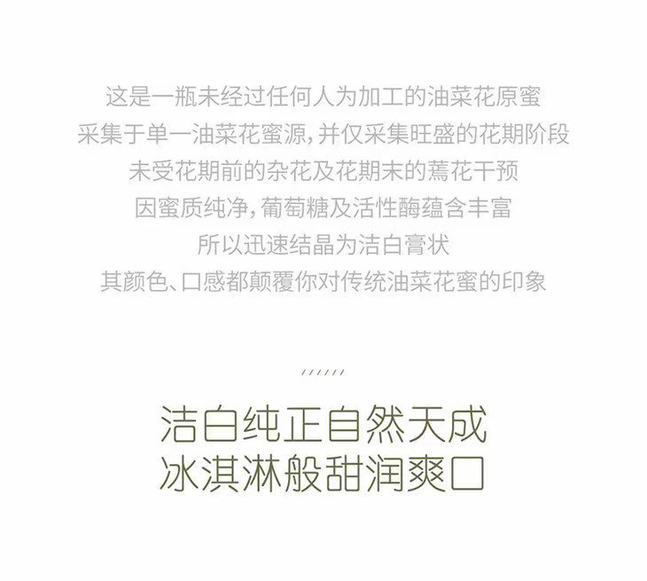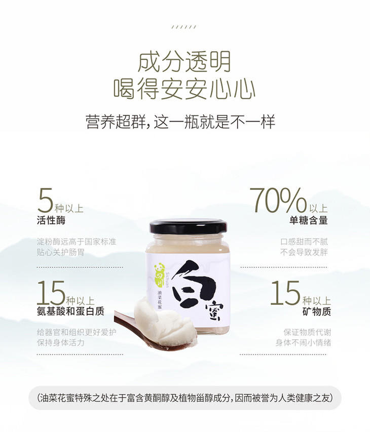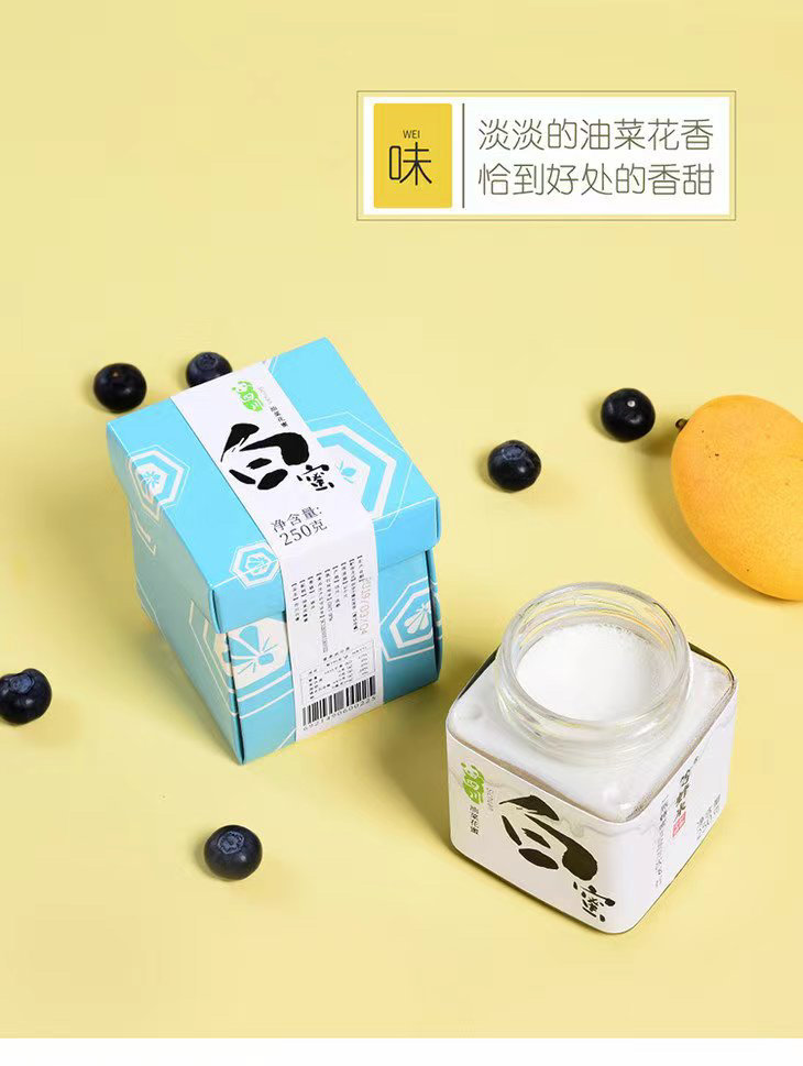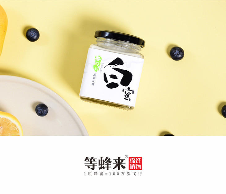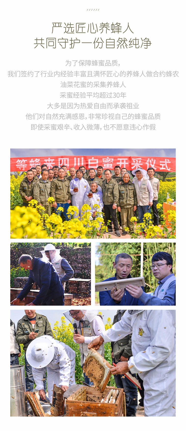 等蜂来的白蜜,采集于四川金堂的油菜花海,而纯净的白蜜因为蕴含丰富的葡萄糖及活性物质,会在成熟后短时间内结晶为雪白膏状,这也是其得名“白蜜”的原因。金堂素有“天府花园水城”别称,水资源优渥,空气、水质常年清新,不受任何工业、农业(药)污染,油菜花种植覆盖率超过90%,在此采集而得的油菜花蜜蜜质就很纯净。养蜂来有专业的养蜂人及品质检测官,养蜂人大多来自家中世代以养蜂为业的金堂人,而检测官则负责从采蜜前检测蜜源地的水质、土壤、空气状况确保安全达标,在采酿过程中,监测蜂蜜的成熟情况,保证每一滴蜂蜜都完全成熟才能开始采收。