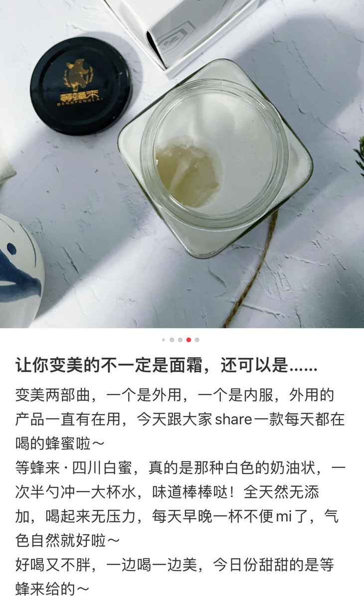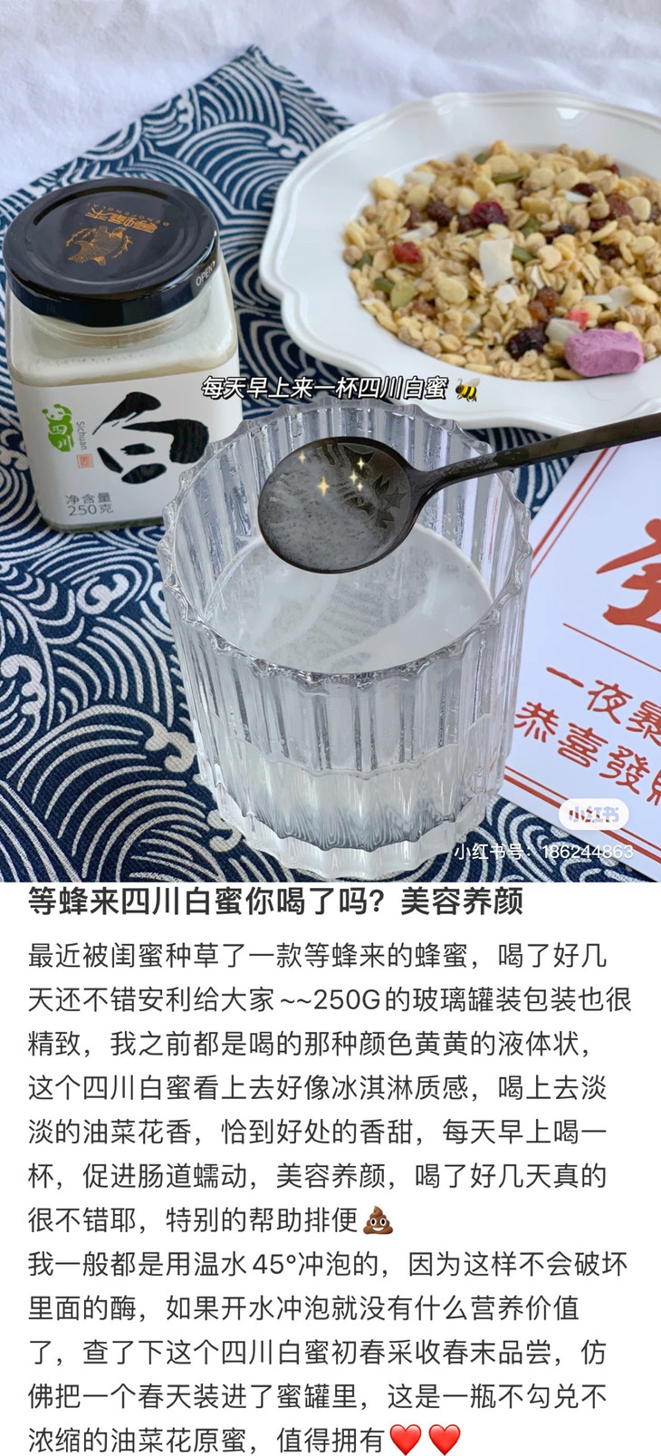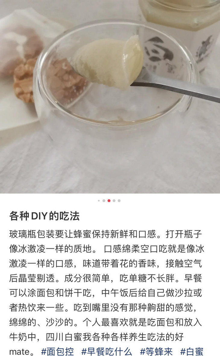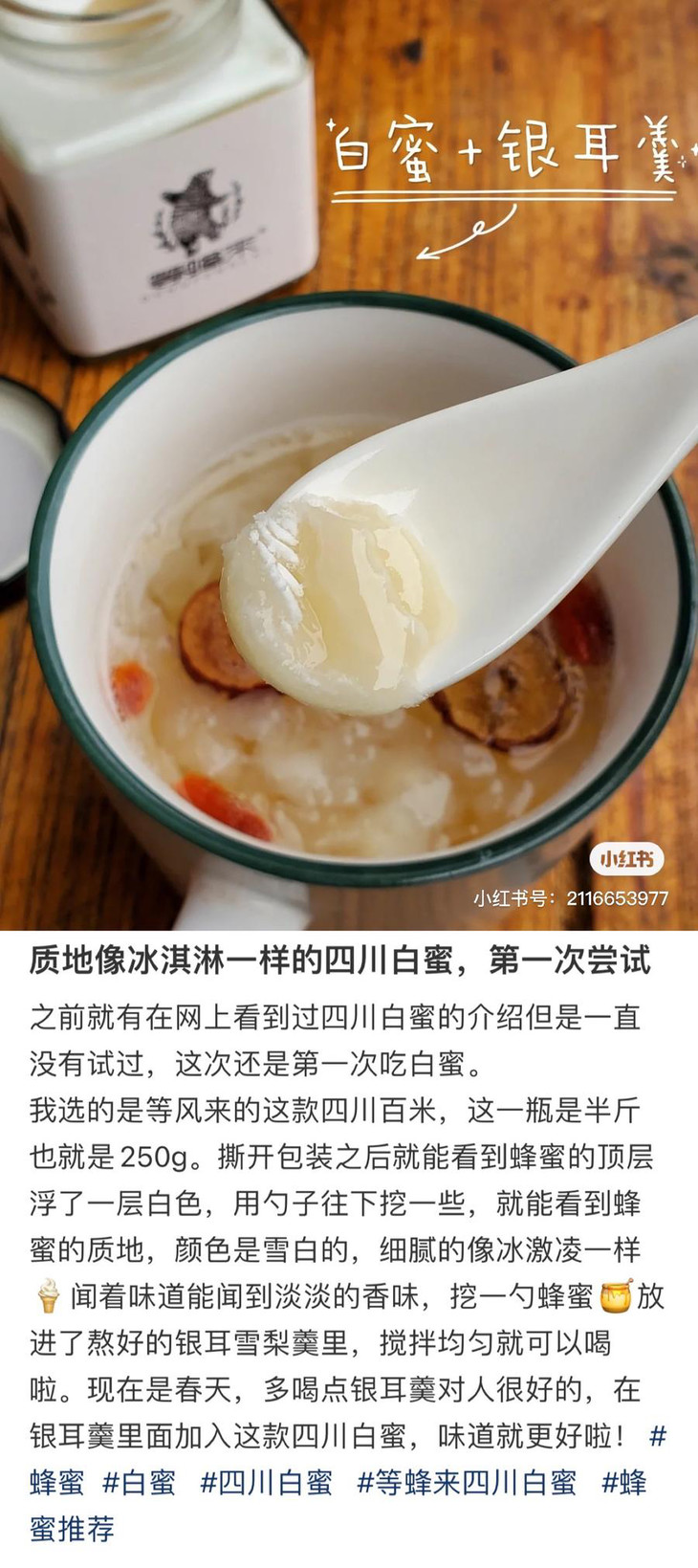 因为我爸也曾是养蜂人,所以对蜂蜜的好坏,也是略知一二。没有任何人为干预的四川白蜜,自然结晶为白色,纯净甘甜,雪白细腻,因为不含蔗糖,入口像吃慕斯一样,丝滑清甜,配上柠檬,喝水量up!我自己主要是用来调玫瑰精油蜜,每天1-2滴,搅匀,加温水,晨起空腹一杯,好处多多!