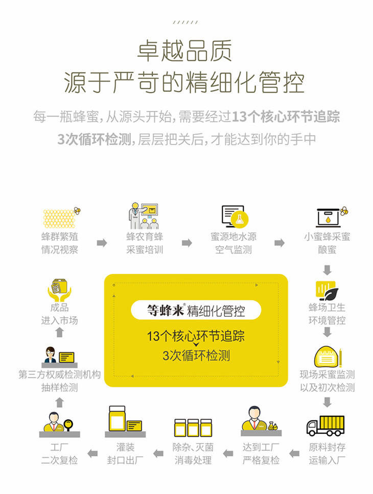 每一瓶蜂蜜,从源头开始,需要经过13个核心环节追踪,3次循环检测,以确保每一滴蜂蜜,从花蕊到舌尖,都保留其自然气息,没有任何人工干预,因此等蜂来蜂蜜蔗糖含量检测为零。除此外,等蜂来还创立了无浓缩设备的工厂,保证每一滴蜜都未经过高温浓缩,其工厂在2018年获得严苛的HACCP(国际食品安全)认证,这份报告是国际认可的保障食品安全zui有效的管理体系。