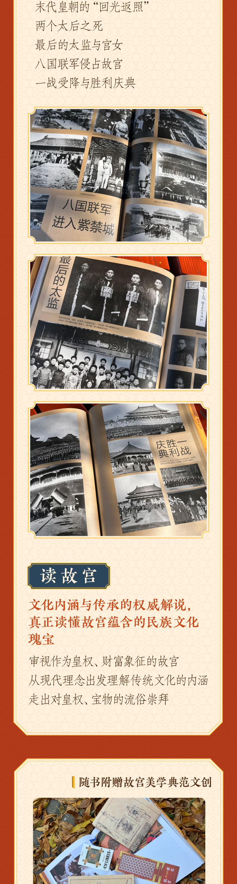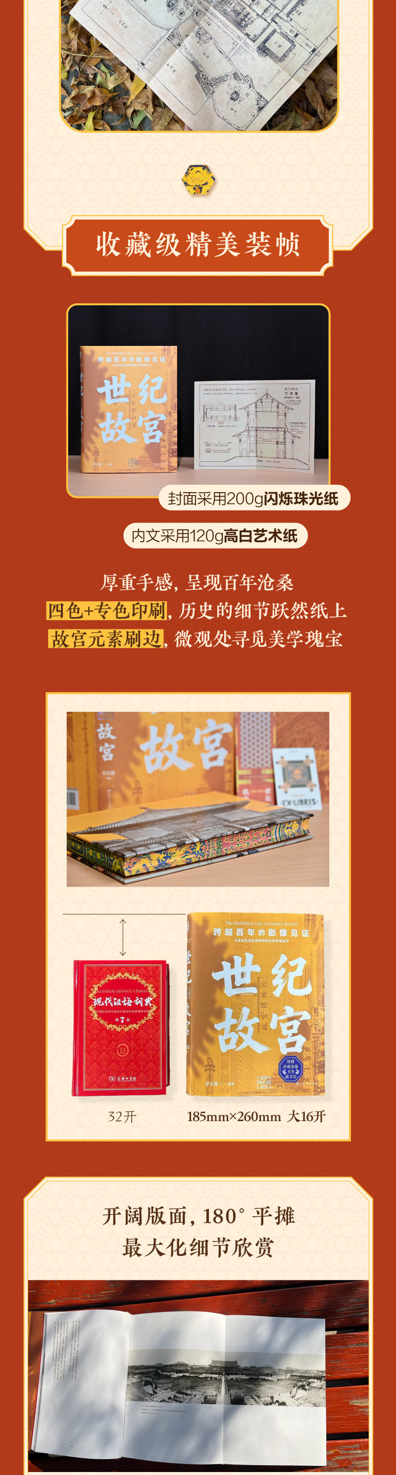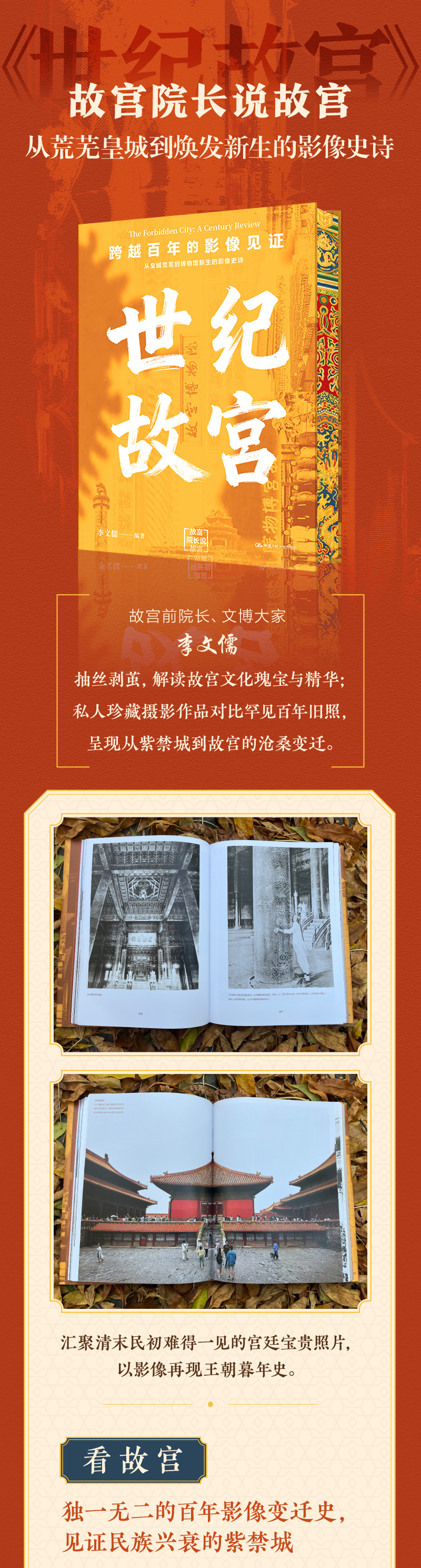 本书梳理了自清末传入现代摄像设备百年来的故宫影像史,精选100余幅百年前中外各国人士的旧时故宫老照片,与现今同机位拍摄的新时代故宫图片形成对比,呈现并深入解读其百年传承和变迁,在对比的艺术审美中突出故宫的厚重的底蕴和磅礴大气的美学气息。作者以学者视角精心选取故宫主体建筑20世纪初的旧照及21世纪的新影像,辅以多个微观视角的百年故宫人、事、物图像对比,揭示紫禁城作为文明枢纽的跨世纪意义。全书共分为故宫影像史、故宫百年变迁史、皇宫帝制的衰败终结与故空博物院的新生兴盛三部分,三大部分依次展开,呈现一幅壮阔画卷,带领读者重返百年前的故宫,深入明清宫殿遗迹、故宫修缮现场,再现动荡岁月中的文明守护、文物南迁路上的血泪足迹和梁思成手稿中跳动的建筑灵魂,演绎出紫禁城文明的现代觉醒。