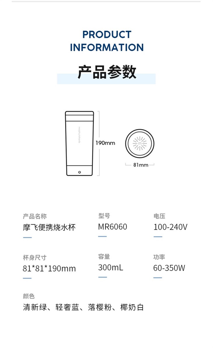 摩飞电器电热烧水壶MR6060便携式烧水杯 四色可选