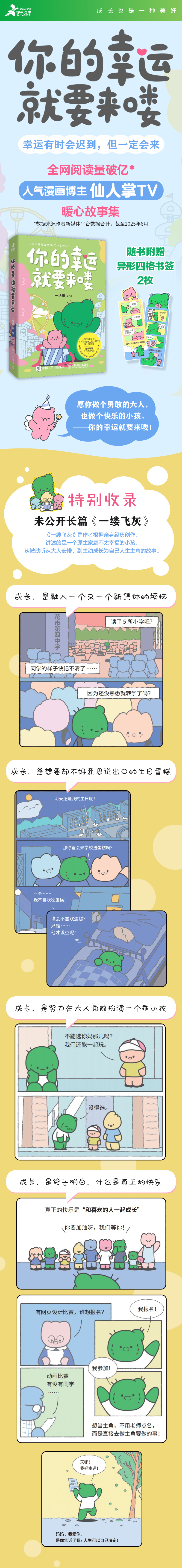 本书是人气漫画博主仙人掌TV的漫画作品集,共一个长篇、九个短篇。长篇《一缕飞灰》讲述了一个原生家庭不太幸福的小孩,从被动听从大人安排,到主动成长为自己人生主角的故事。它融入了作者部分的人生经历,“真实得常常让我一边创作一边掉眼泪。” 书的后半部是九个独立的短故事,有趣味幻想,如“快乐≠更好”“问题苹果”“‘鸭力’,订计划*败定律”等,把深刻的人生哲理巧妙地融入有趣的故事中,在新兴漫画家群体中独树一帜,令人玩味。书中还有看似平淡却温馨的日常,如“你的幸运*要来喽”“熟悉,是*近的距离”“真心旧物店”等,暖心、有爱、满满的正能量。 当你感觉不顺的时候,记得告诉自己:“幸运只是迟到了,但它一定会来。” 愿你做个勇敢的大人,也做个快乐的小孩。——你的幸运*要来喽!