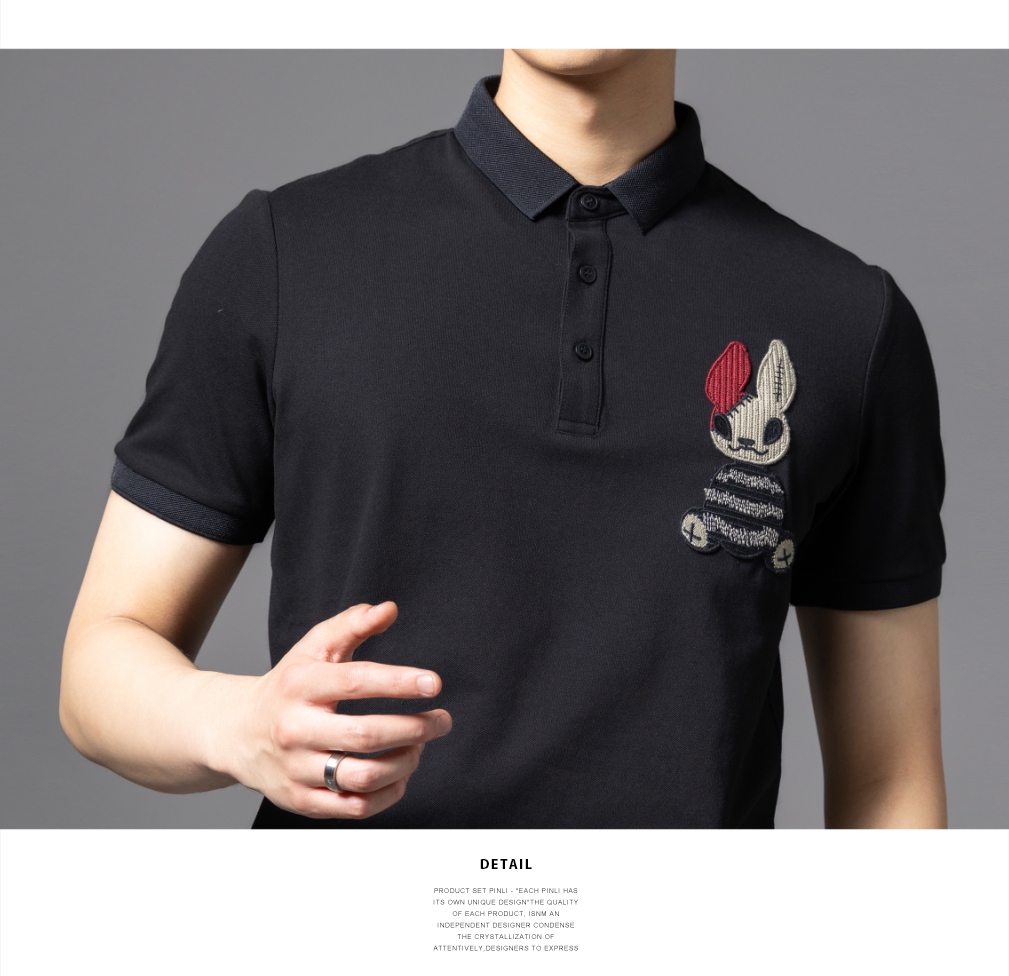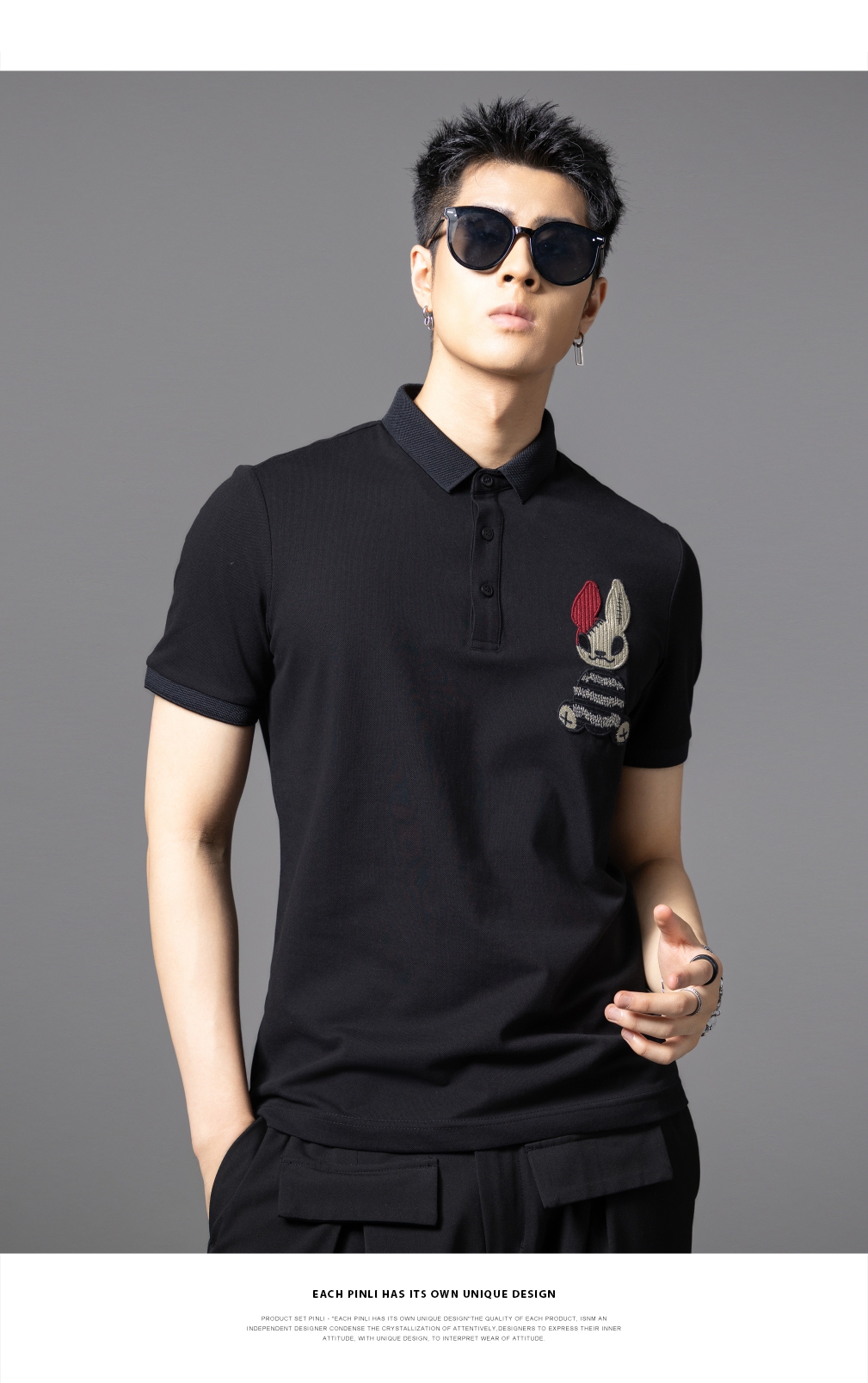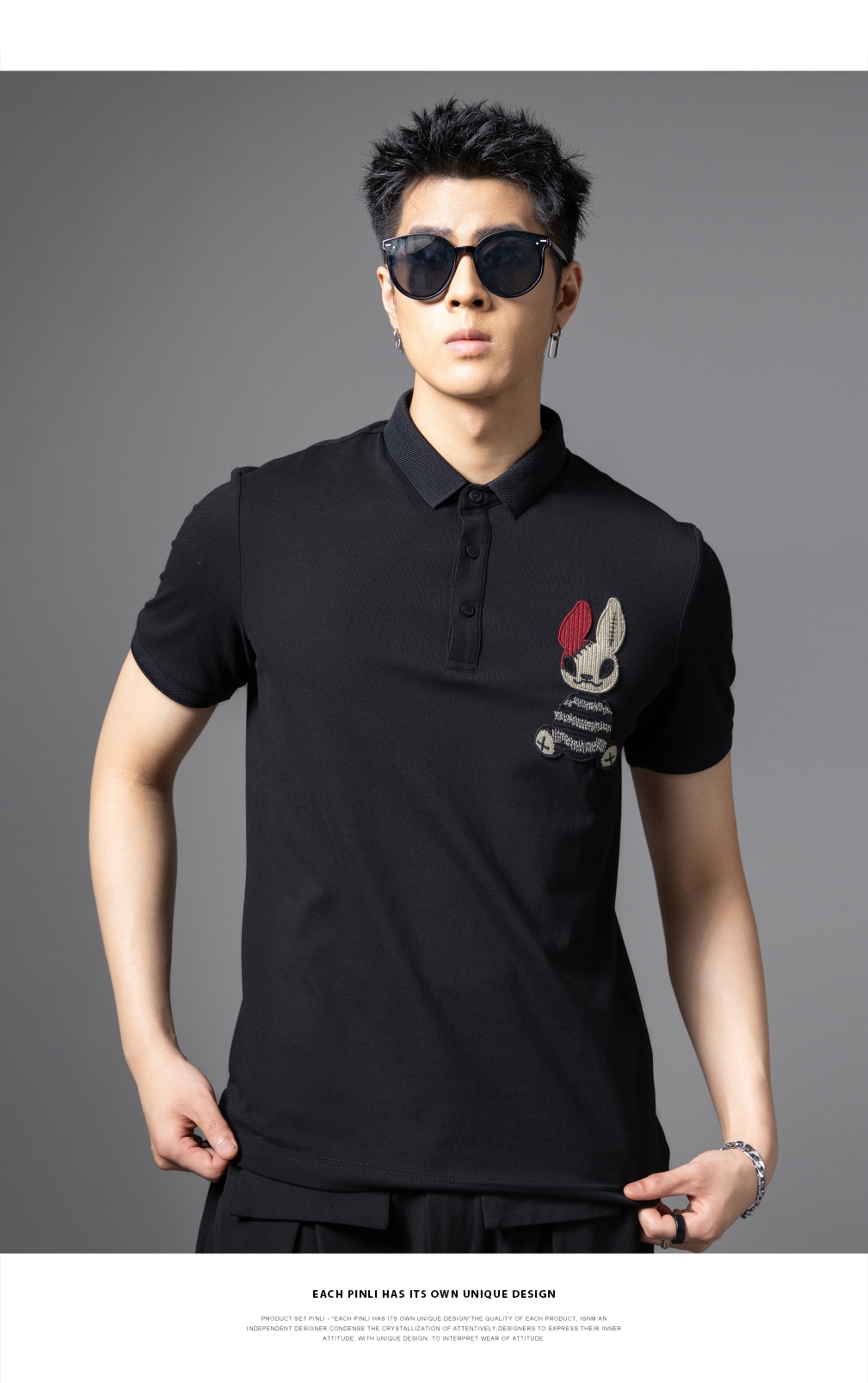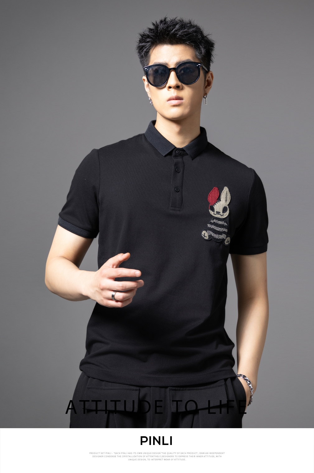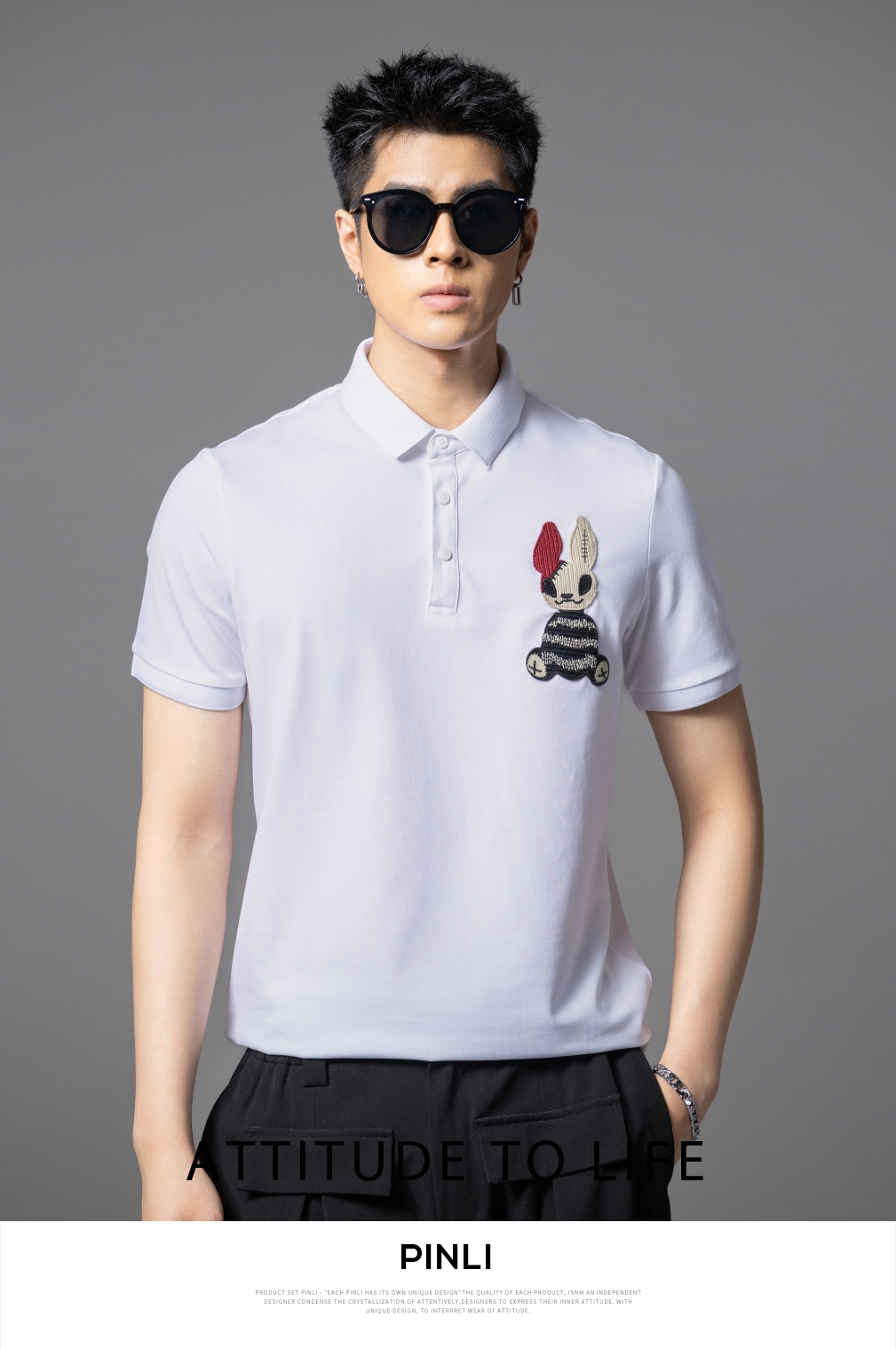 PINLI品立2025夏季夏季新款修身翻领兔子贴布绣短袖POLO衫男体恤BG252112095