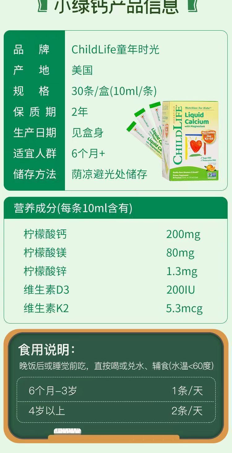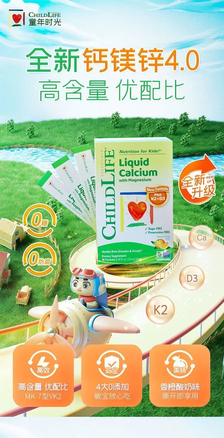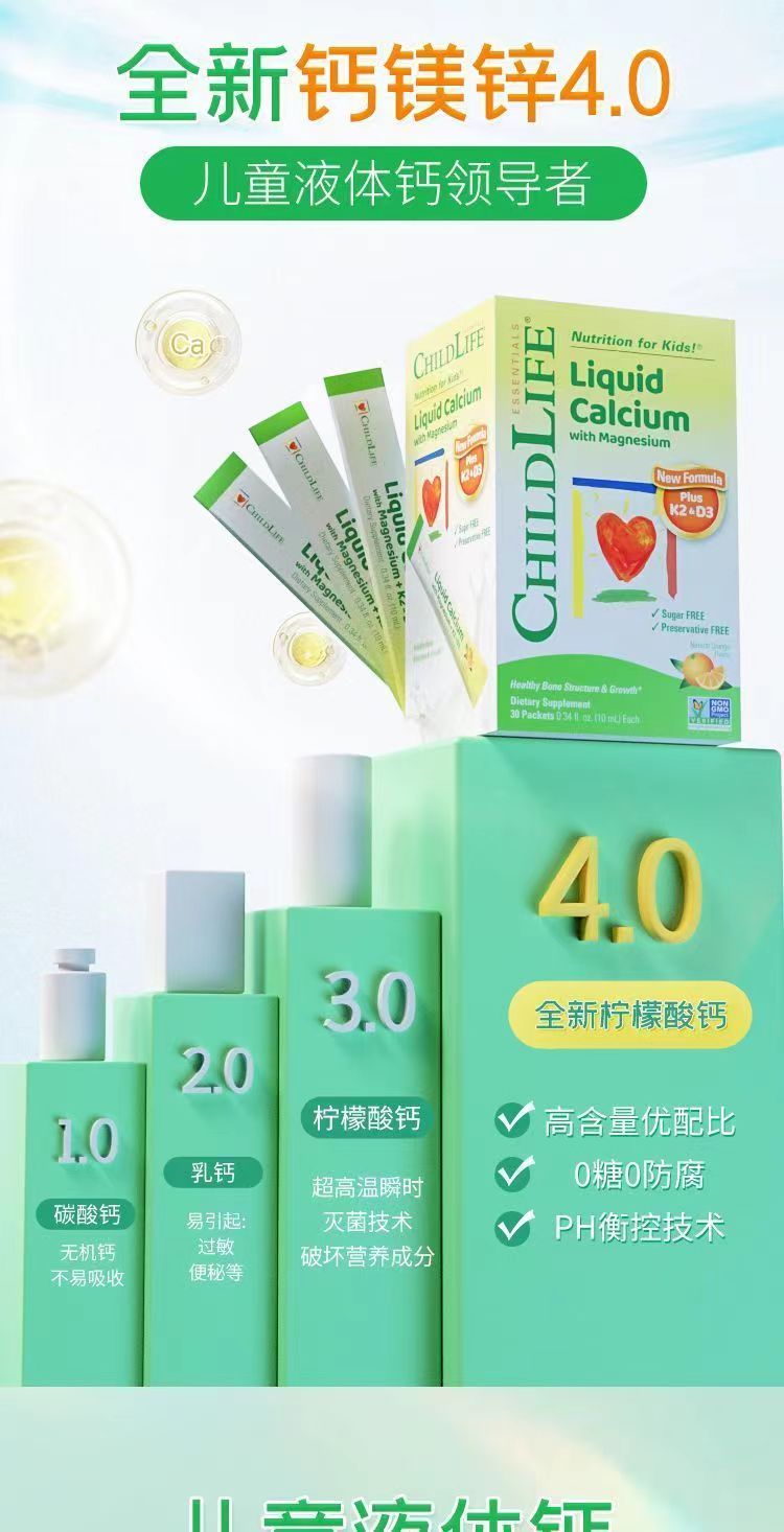 【保税仓】美国Childlife童年时光全新钙镁锌4.0含K2含D3儿童补钙0防腐低敏小绿钙高钙30*10ml/盒 包装微瑕不售后【防伪码+中文说明书】