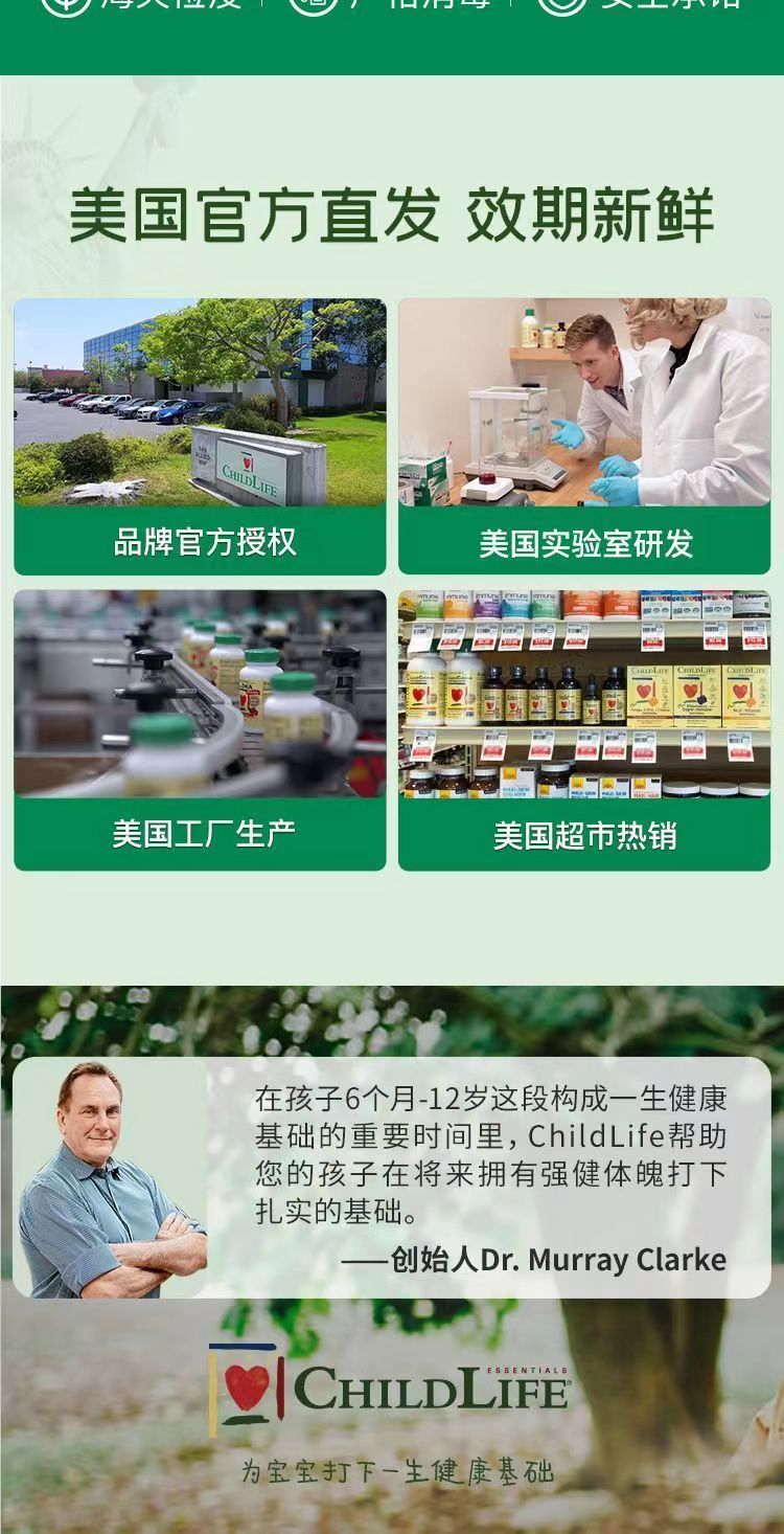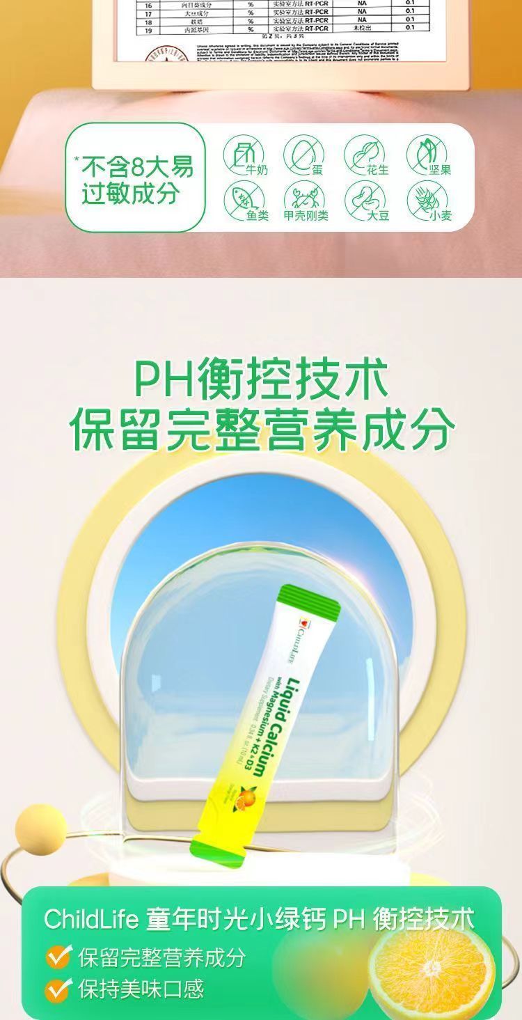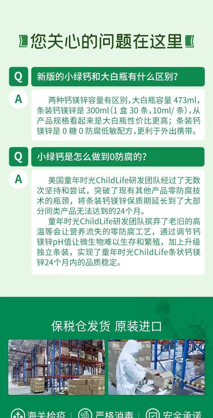 【保税仓】美国Childlife童年时光全新钙镁锌4.0含K2含D3儿童补钙0防腐低敏小绿钙高钙30*10ml/盒 包装微瑕不售后【防伪码+中文说明书】