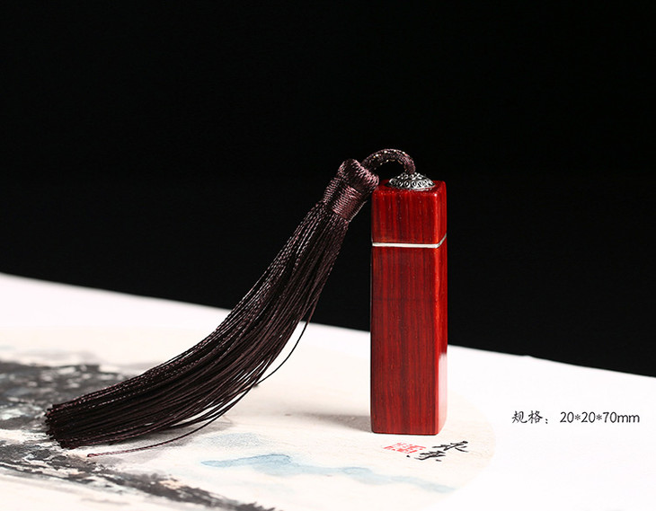 镶银流苏印章:本款宝贝精选紫檀基础料质雕刻而成,颜色红润细腻,手感舒适细腻,荧光感强,性价比高!宝贝镶银的特征让印章更加增添贵族气息,漂亮的流苏为印章增添很多雅致的意蕴。印章是中国古代文人雅士必备的文房用品之一,优质的材质、独特的雕刻内容体现了主人的高雅情怀和独特品味。本款宝贝采用的是古代文人最常用的印章款式,可以随身携带,也可以置放于桌头案间,绝对值得你的拥有!