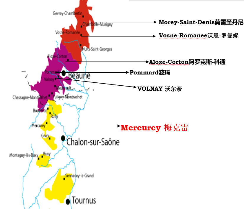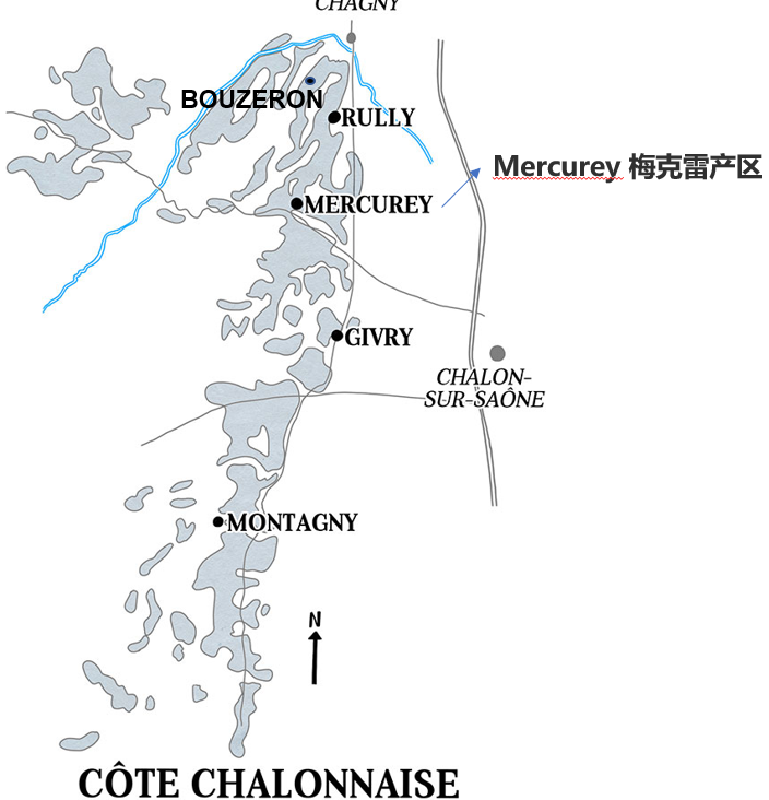 梅克雷Mercurey是夏隆内丘Cote Chalonnaise的一个村庄,产区成立于1923年,是夏隆内丘产量最高的村庄,有着近1/4面积的一级园葡萄,产区以黑皮诺Pinot Noir酿造的红葡萄酒为主,颜色相对较深,酒体风格相对饱满。