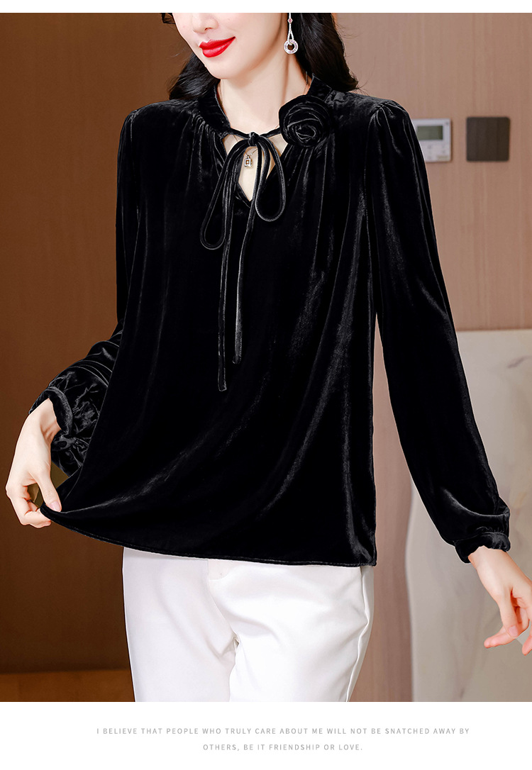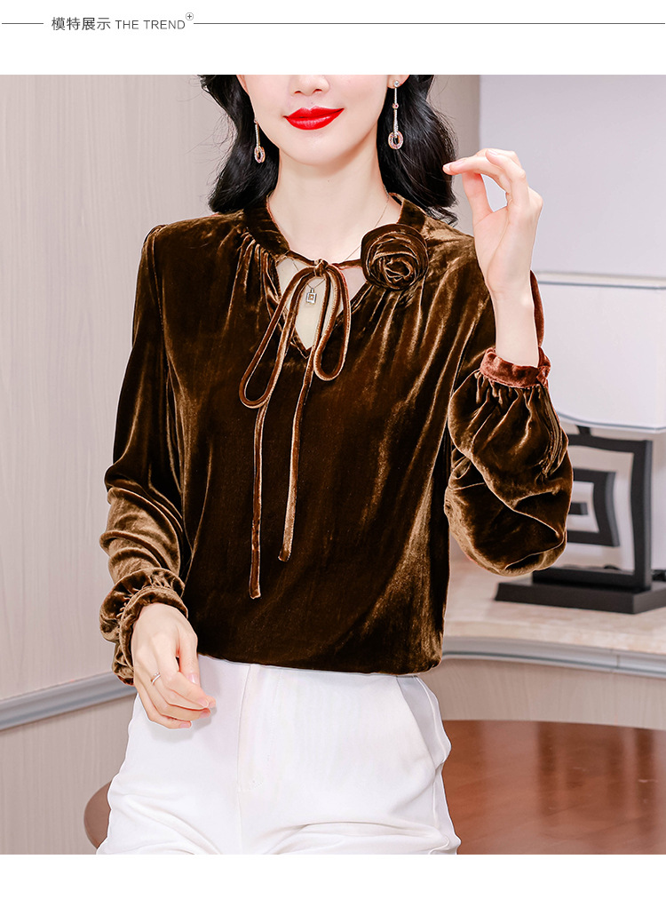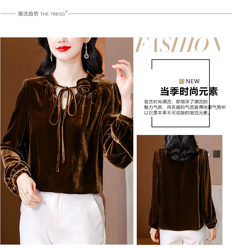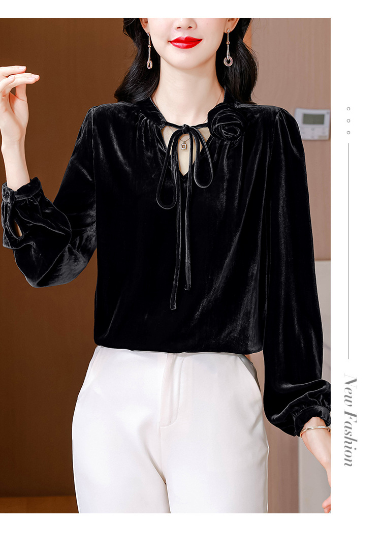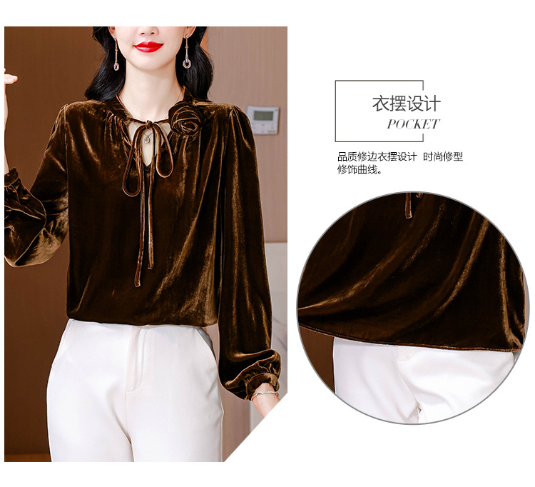 KQLA83N3303法式暗黑风丝绒系带衬衫女2025秋季新款长袖镂空花朵装饰显瘦上衣