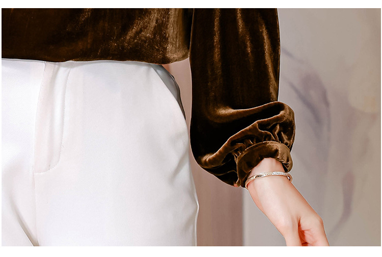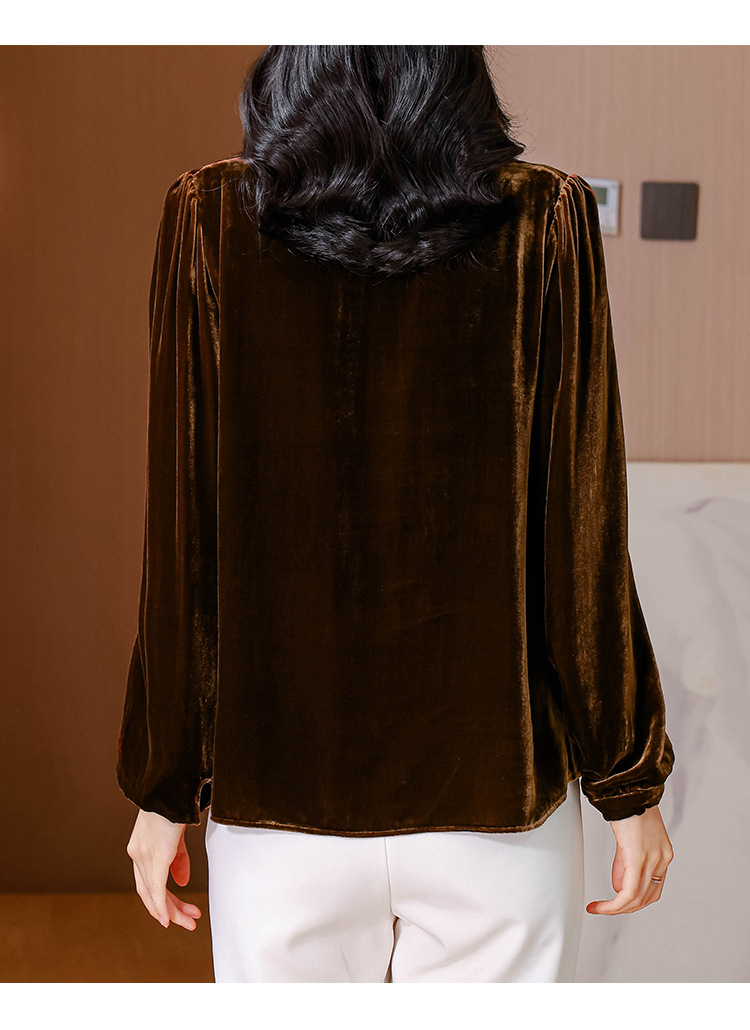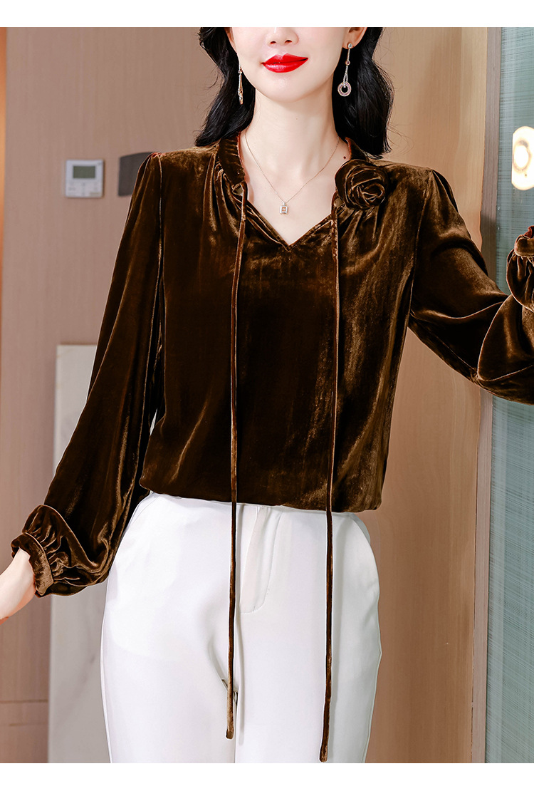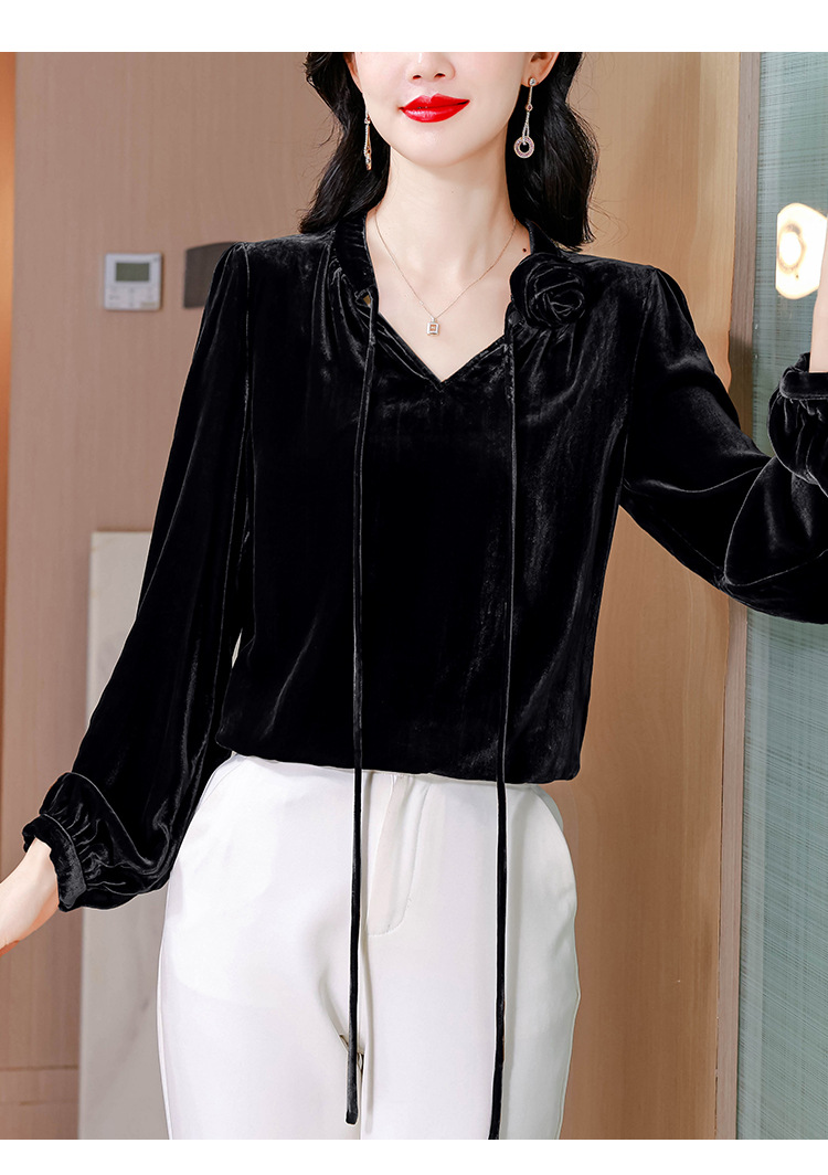 KQLA83N3303法式暗黑风丝绒系带衬衫女2025秋季新款长袖镂空花朵装饰显瘦上衣