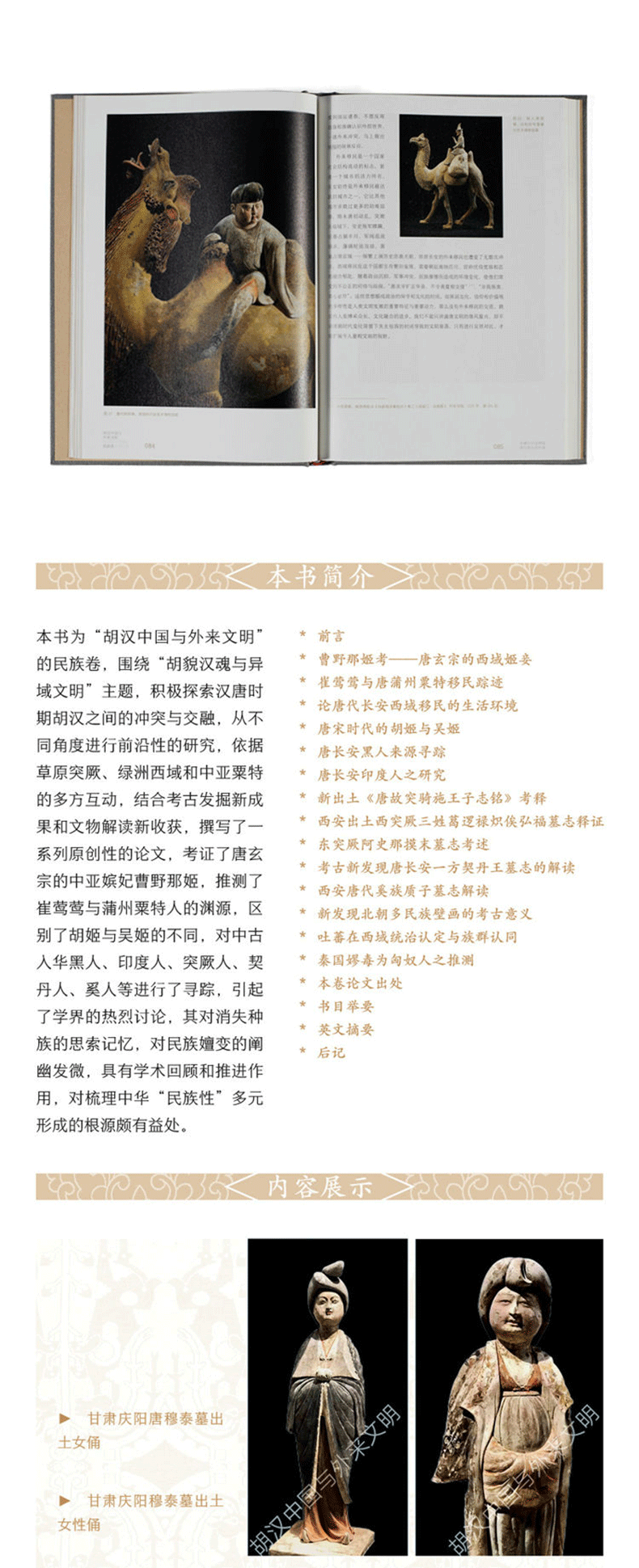 全书总书名为《胡汉中国与外来文明》,分为五卷,即《交流卷:绵亘万里长》《民族卷:胡马度阴山》《艺术卷:拂菻花乱彩》《宗教卷:番僧入华来》《胡俑卷:绿眼紫髯胡》。在书中,作者纵论胡汉文化如何在汉唐时期进行深入交流互动,具体考察了入华胡人的生活状况,探讨外来文明对中原建筑、书法、绘画、雕塑以及生活习俗等方面的影响,挖掘祆教、摩尼教、景教等在中原地区的传播。作者长期工作于考古文博的一线,亲身接触大量新出土但尚未刊布的考古文物及文献成果,在此基础上,作者撰写多篇文章并配以重要的图片,这些研究文章对于推动历史学、考古学的研究,对于建立中国学者与国际学术界的交流有着极其重要的意义。同时,作者关注的地域空间大多与汉唐以来丝路沿线的族群、政权相关联,对于这些地区的历史、文化、宗教、艺术的基础性研究,对于扎实推进“一带一路”构想有着积极作用。