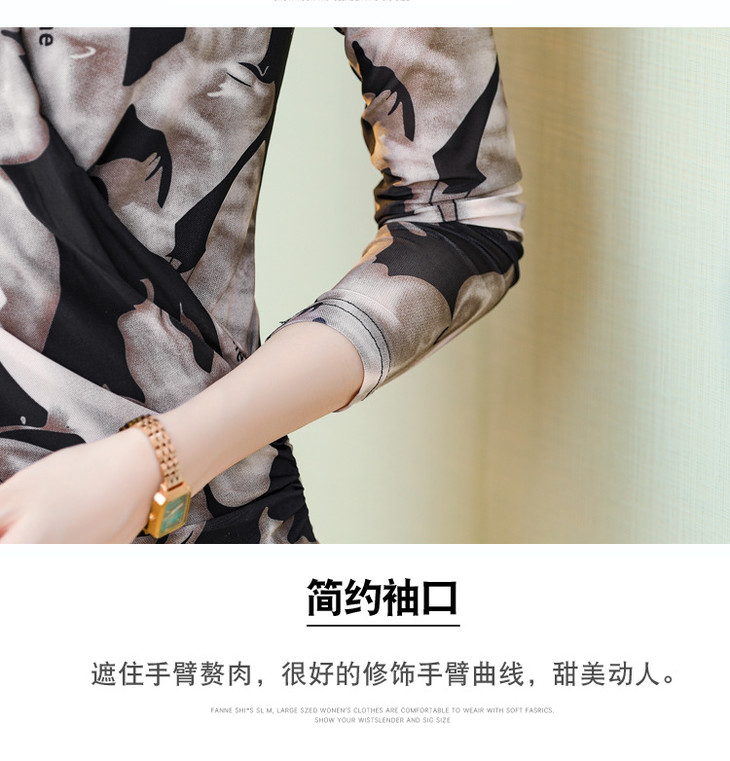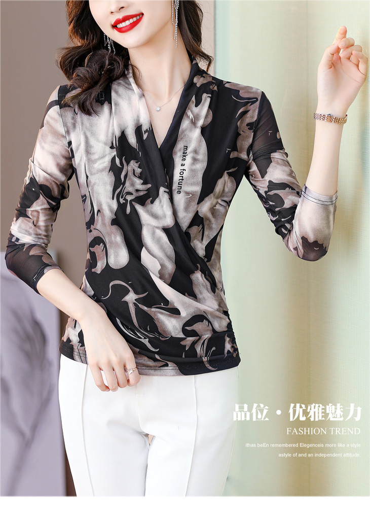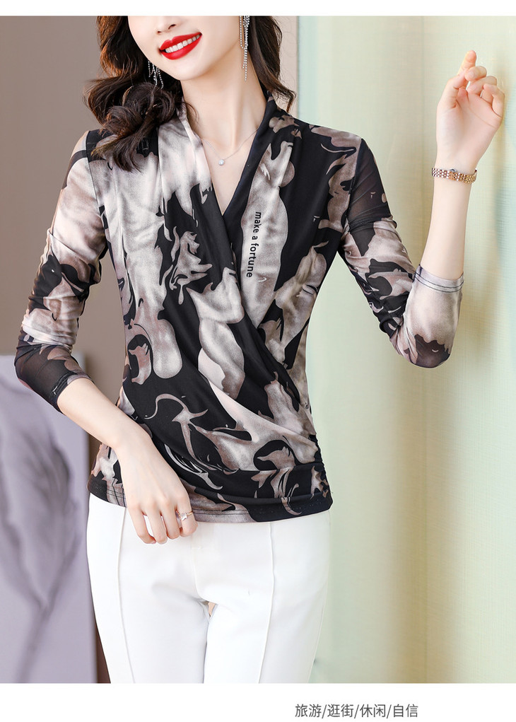 KQL 428H2363印花V领网纱打底衫显瘦遮肚T恤