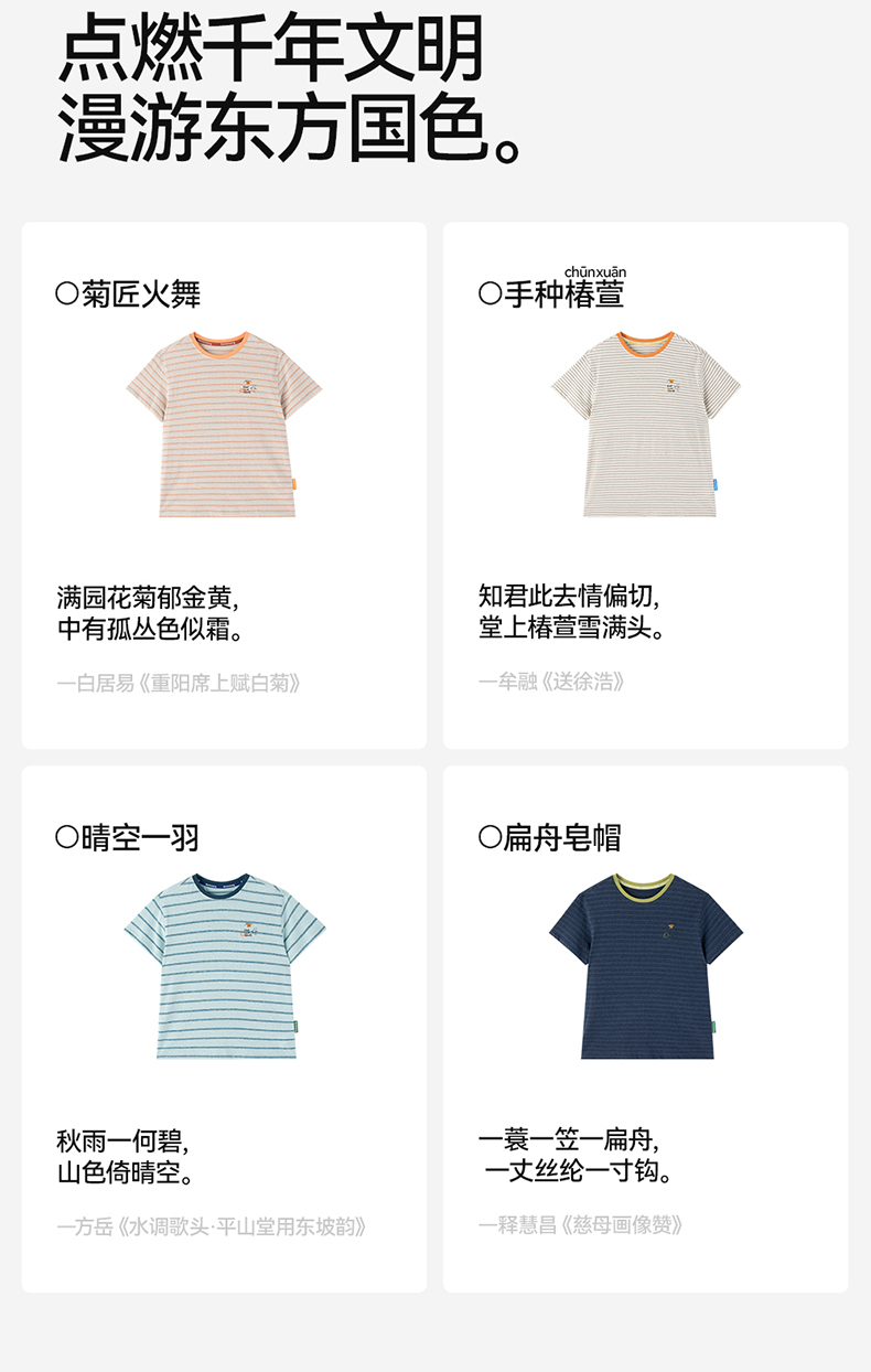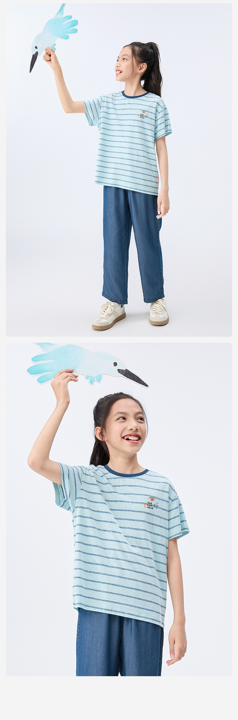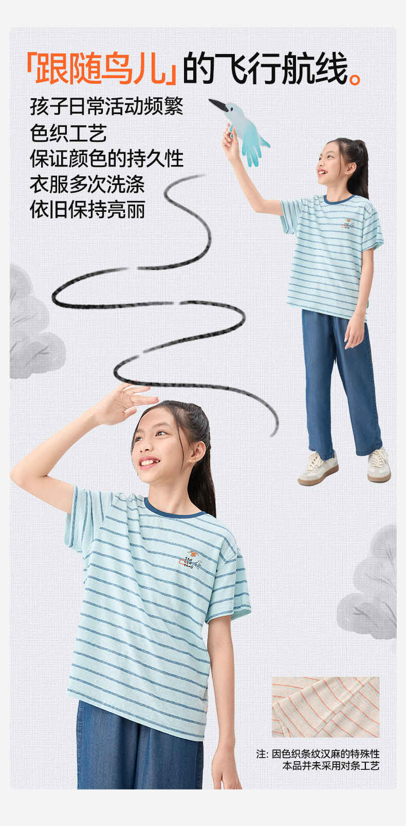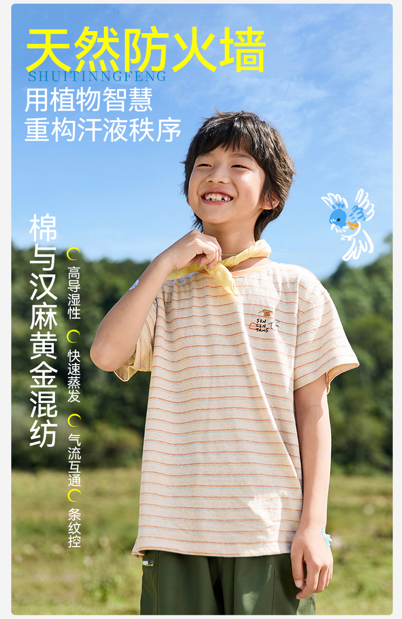 【水亭风观鸟短袖T恤】森林棠25夏款清凉透气棉麻亲子款条纹T恤40322517