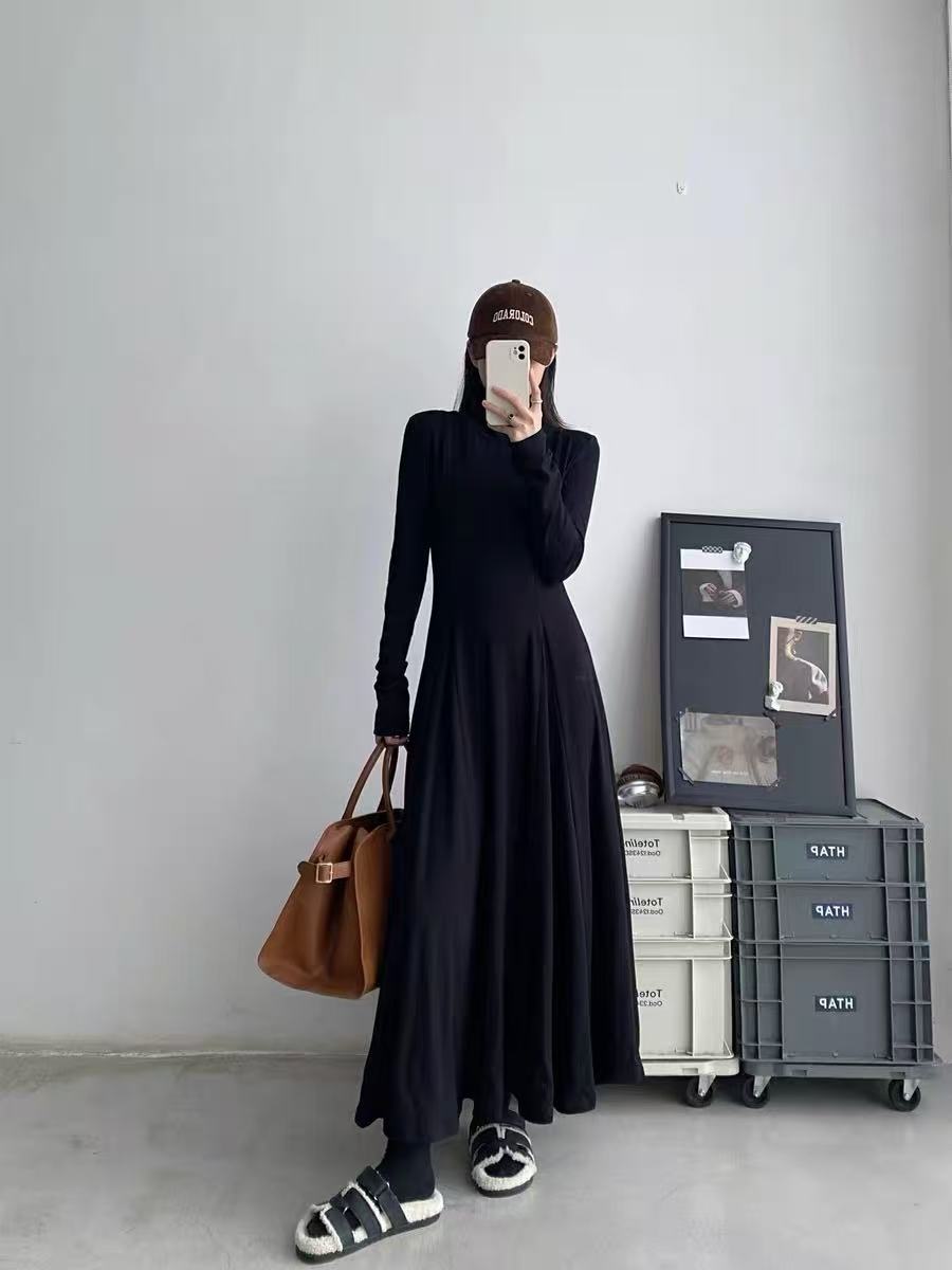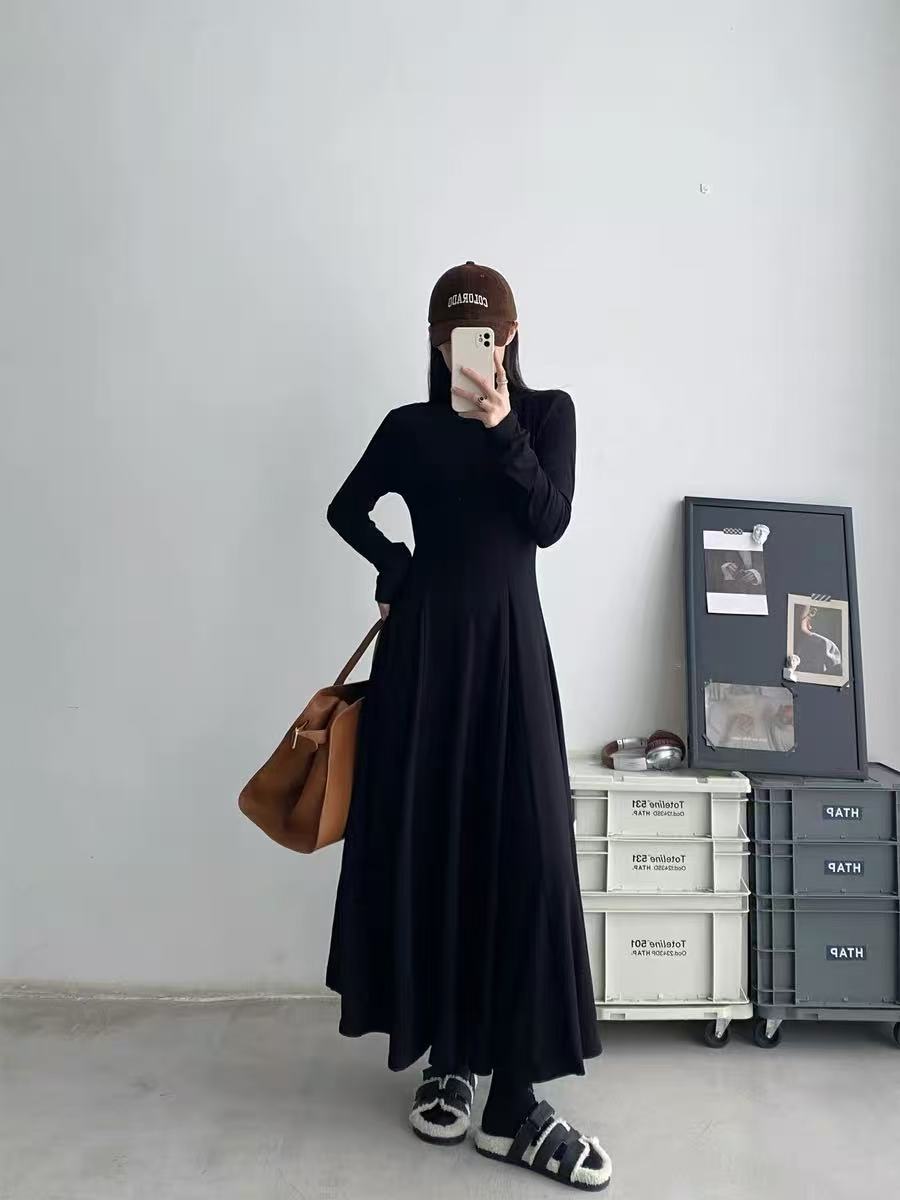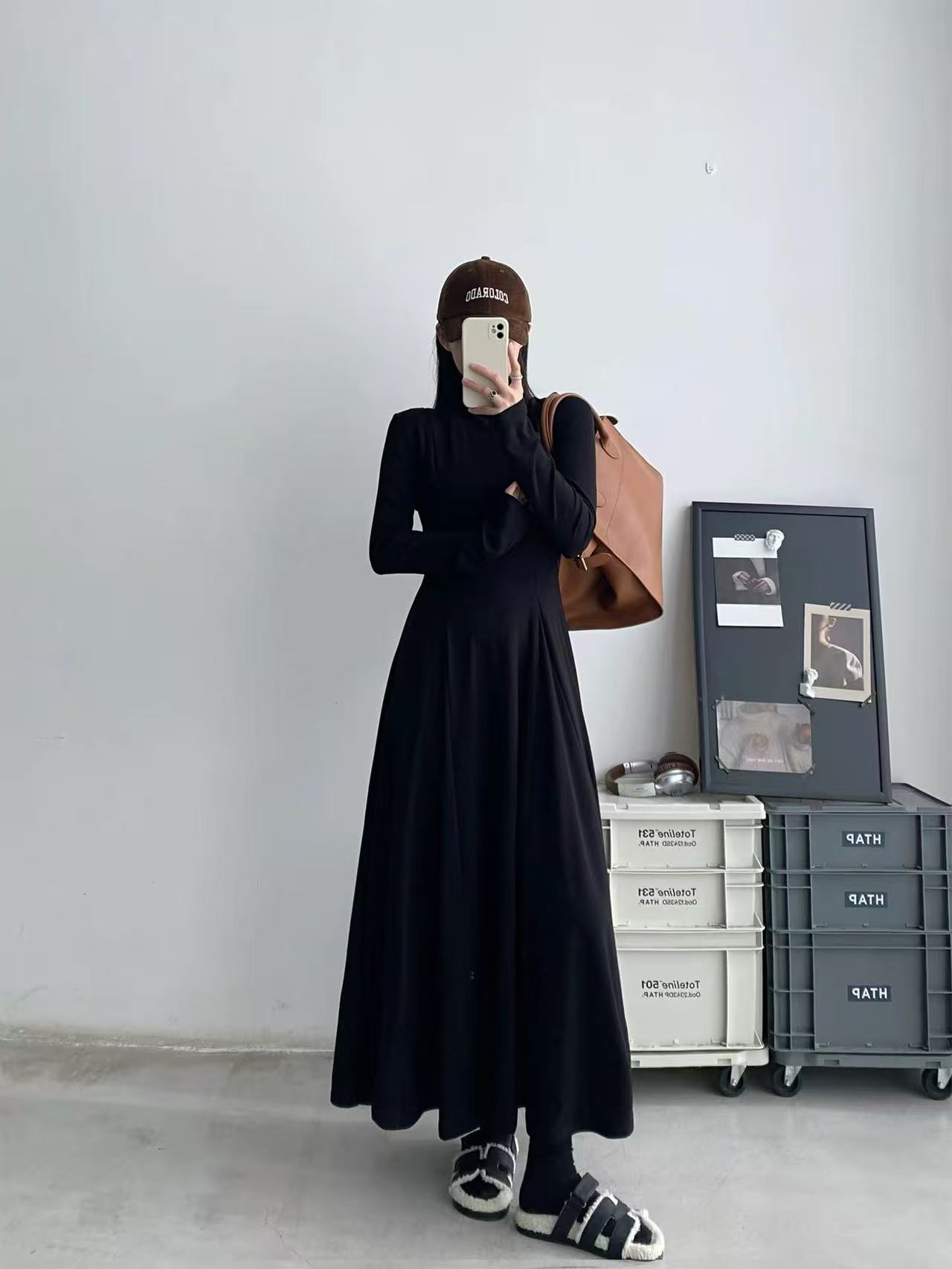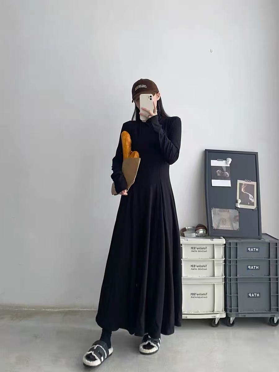【孤品捡漏】(面料超舒服)G144黑色94.9%粘纤莫代尔大裙摆半高领连衣裙-喜出