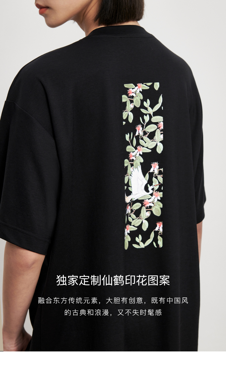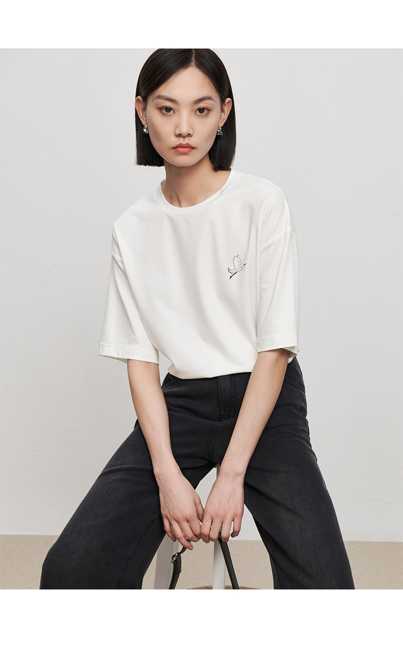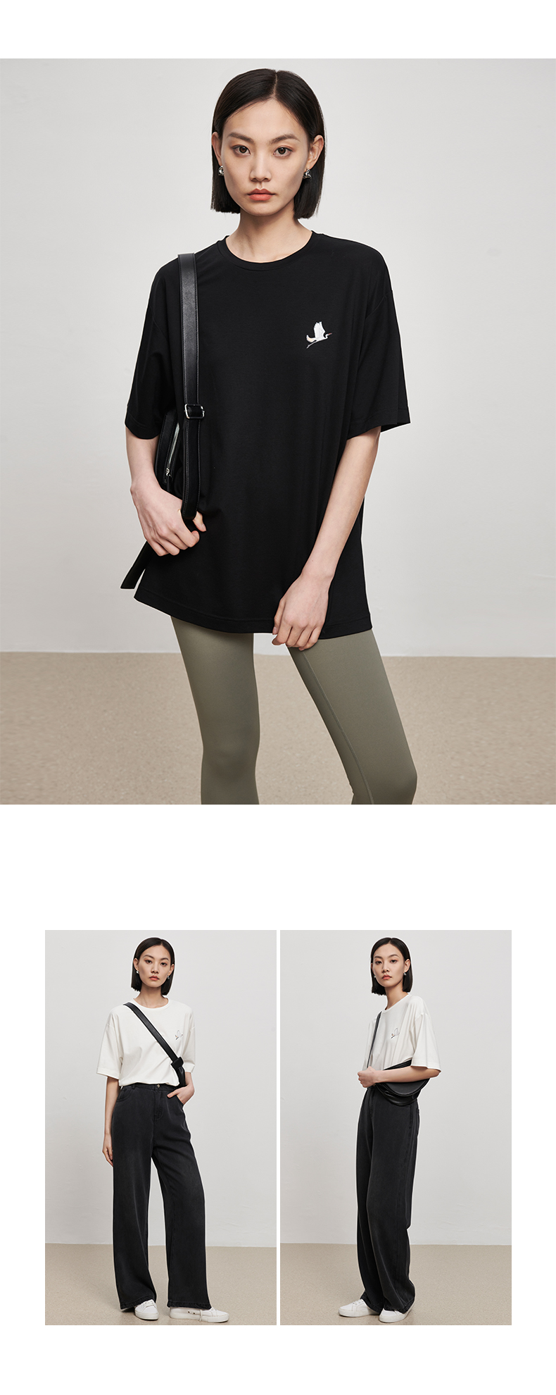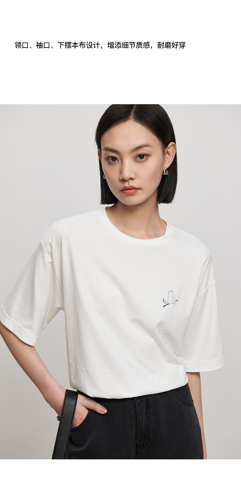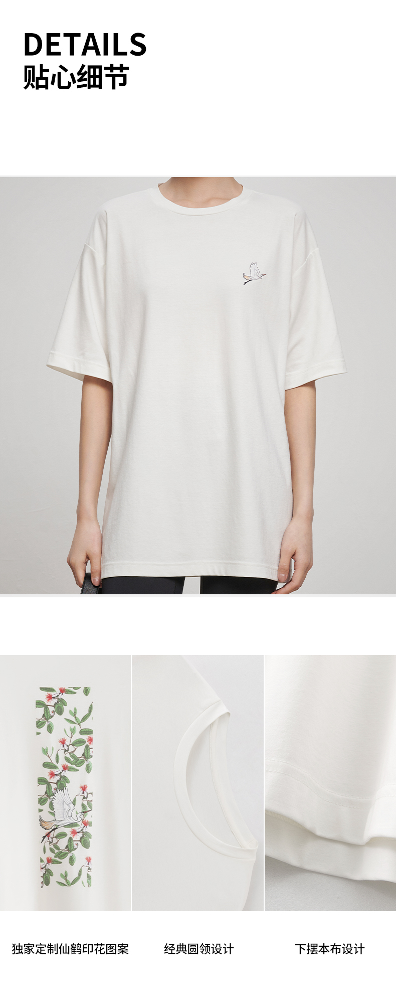 IN AND ON53309夏新款落肩短袖宽松T恤女简约休闲桑蚕丝仙鹤印花上衣女