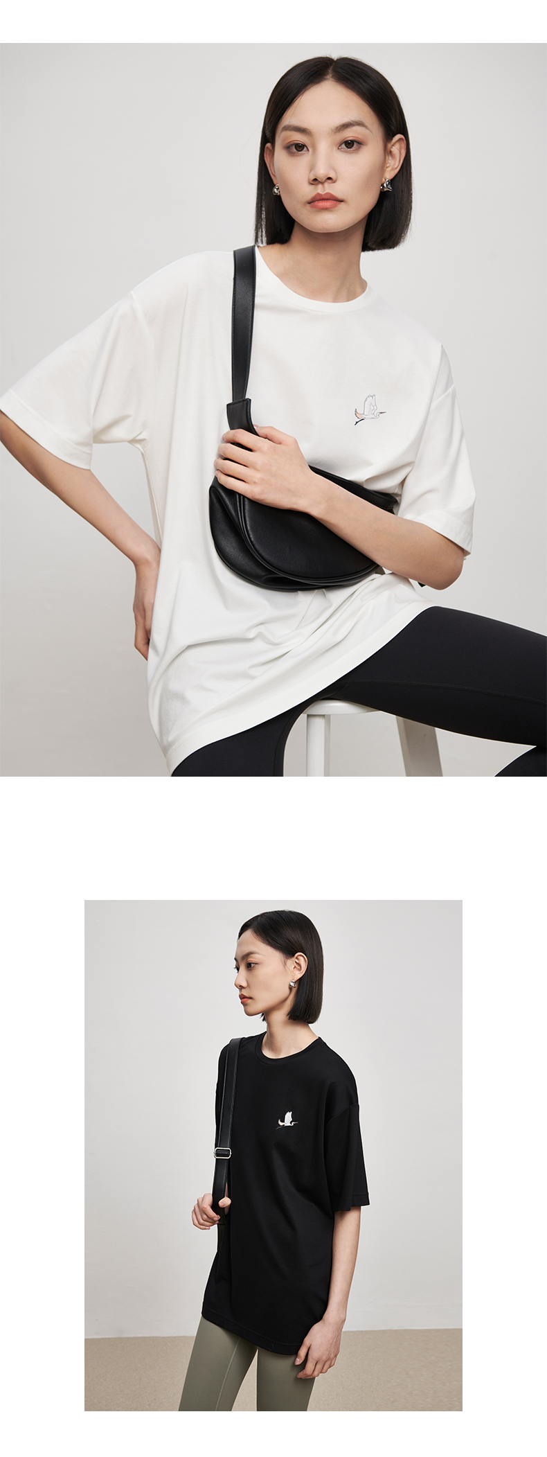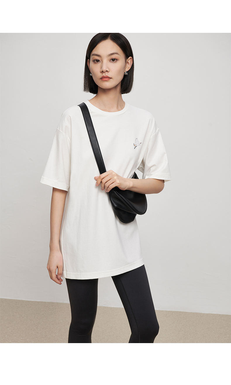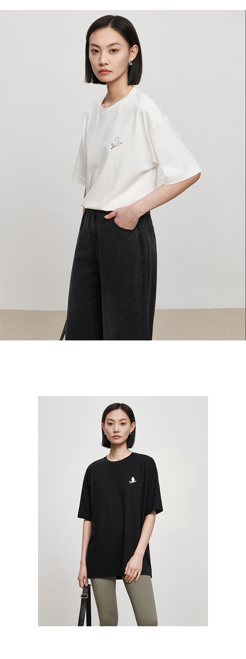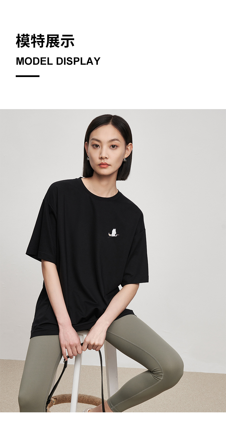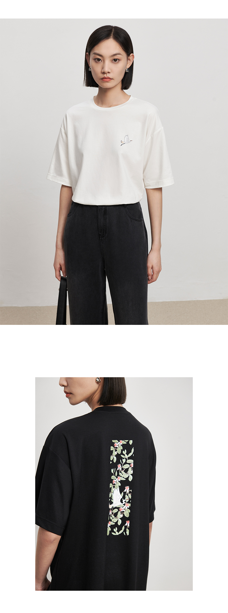 IN AND ON53309夏新款落肩短袖宽松T恤女简约休闲桑蚕丝仙鹤印花上衣女