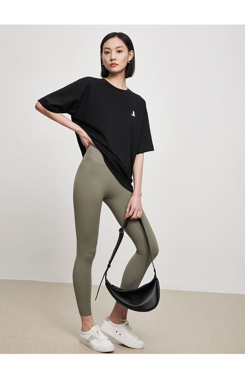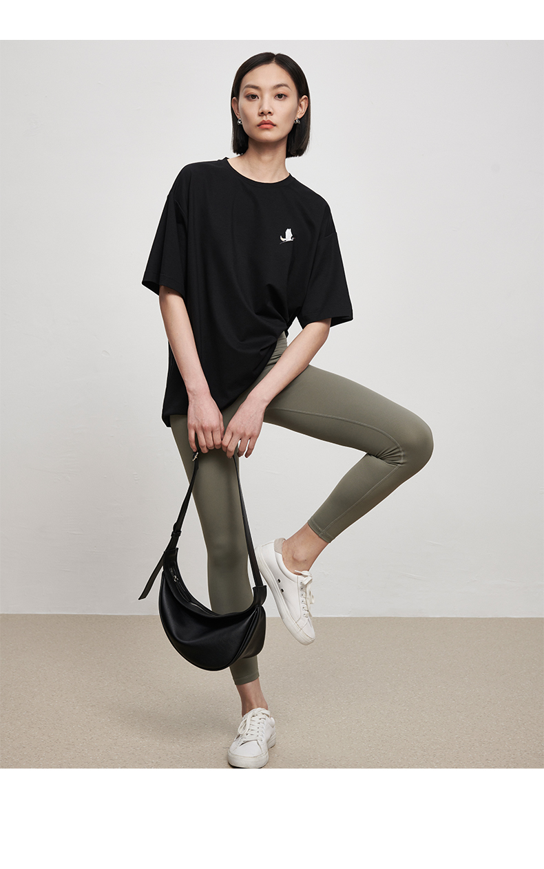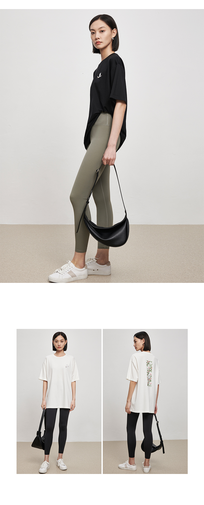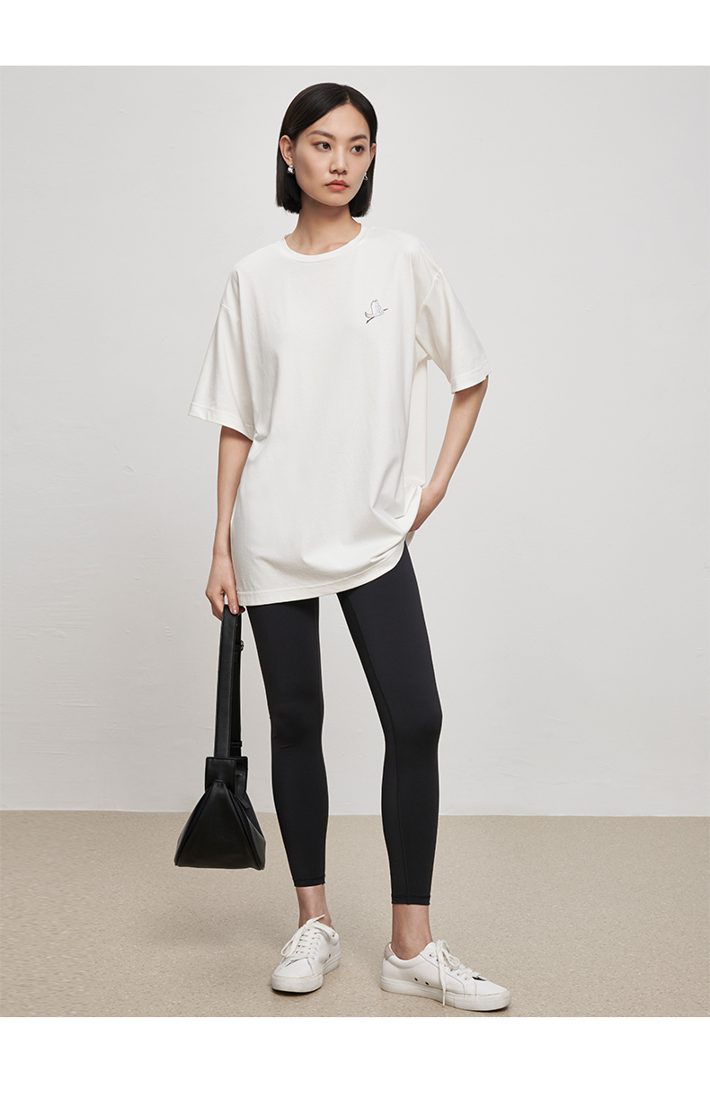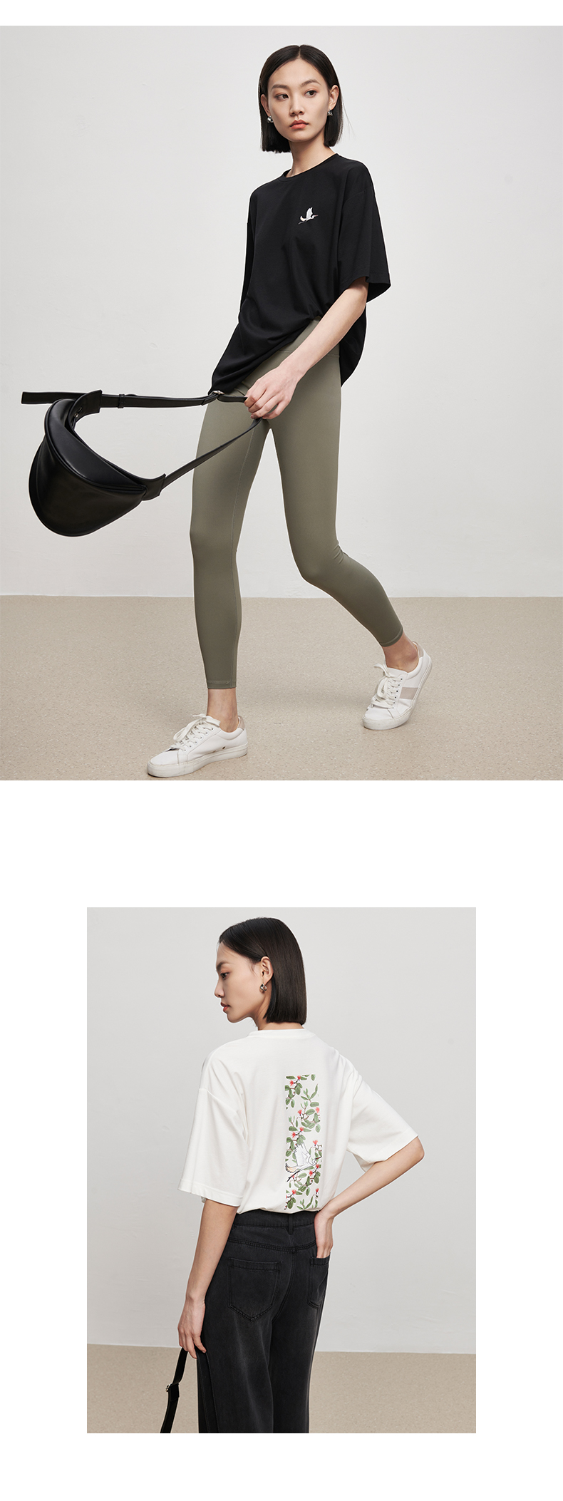 IN AND ON53309夏新款落肩短袖宽松T恤女简约休闲桑蚕丝仙鹤印花上衣女
