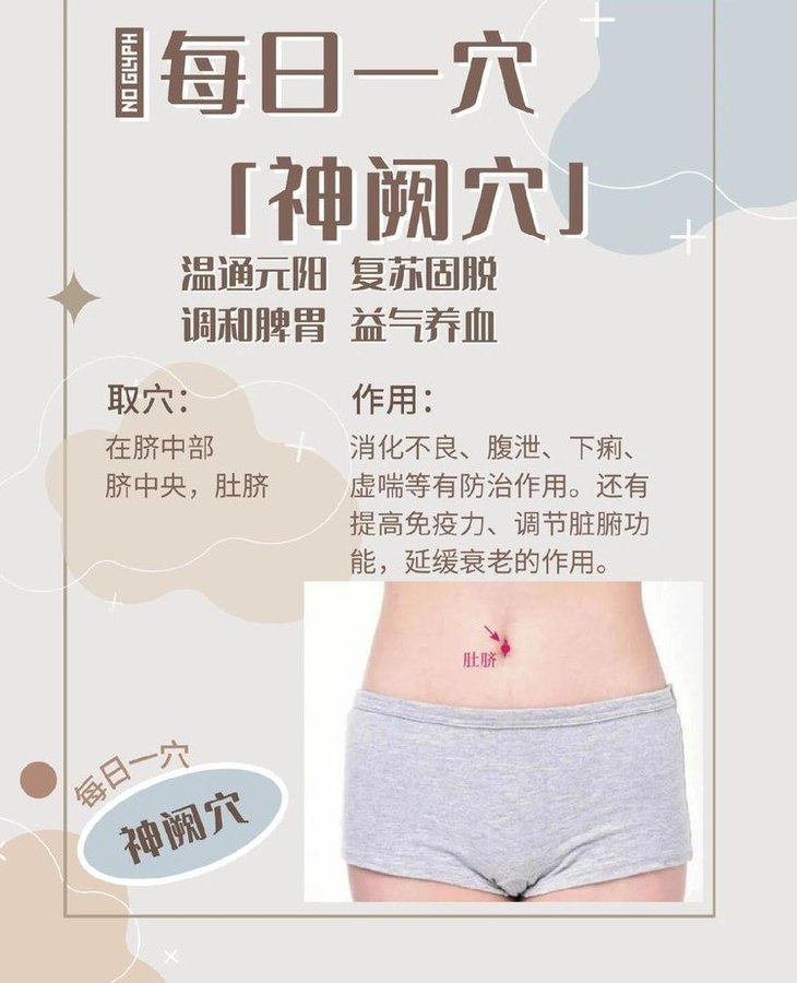 肚脐,中医称之为神阙穴。脐居正中,如门之阙,神通先天。《经穴名的考察》指出,“神”乃心灵生命力,“阙”是君主居城之门,可见,神阙穴是生命力居住的地方。