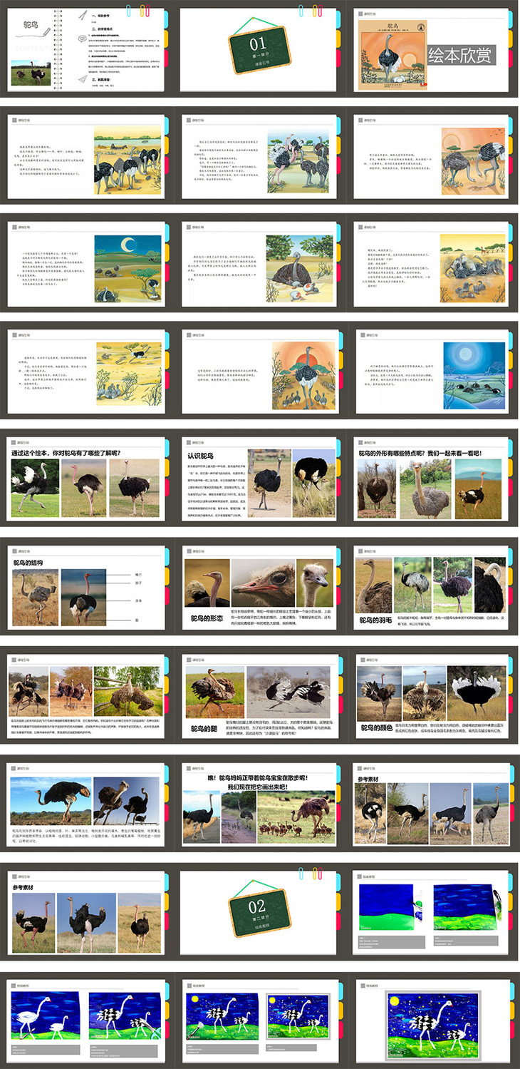 参考鸵鸟的素材图片 ,仔细观察鸵鸟的造型,了解它的外形结构和色彩变化,运用水粉勾勒出它的整体形态,再以剪贴的方式表现出鸵鸟的羽毛,突出鸵鸟的画面效果,提高了画面的趣味性,同时调动了学生的积极性。