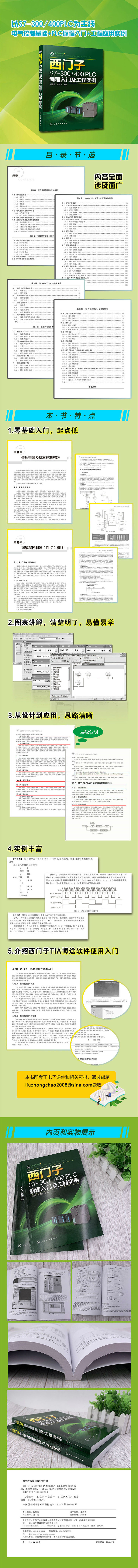 西门子S7-300/400 PLC是国内应用最广、市场占有率非常高的PLC,很多工程技术人员都觉得S7-300/400 PLC不容易自学,入门比较困难。本书以德国西门子公司S7-300/400 PLC为主,从工程应用的角度出发,突出应用性和实践性,用通俗易懂的语言和大量的实验案例以及真实的工程实例使学习和实践能融会贯通。通过实例编程技术的介绍,提供给读者易于学习掌握的平台和清晰的编程思路。全书共分为10章,比较系统全面地介绍了西门子S7-300/400 PLC的相关知识。第1章介绍了低压电器及基本控制线路,可供没有电气控制基础的相关读者进行选学;第2章主要介绍可编程控制器的发展、定义和工作原理;第3章介绍S7-300/400 PLC的硬件体系和模块特性;第4章主要介绍了经典SIMATIC STEP 7及最新集成开发环境TIA博途软件的使用;第5章重点讲解了S7-300/400 PLC的编程语言与指令系统;第6章介绍了编程方法,重点是结构化编程;第7章介绍了数据块和组织块的使用方法;第8章介绍了模拟量控制的处理及闭环控制;第9章介绍了通用组态软件和西门子PLC的通信设计方法;第10章结合工程实例给出了PLC控制系统的设计原则、内容和步骤。