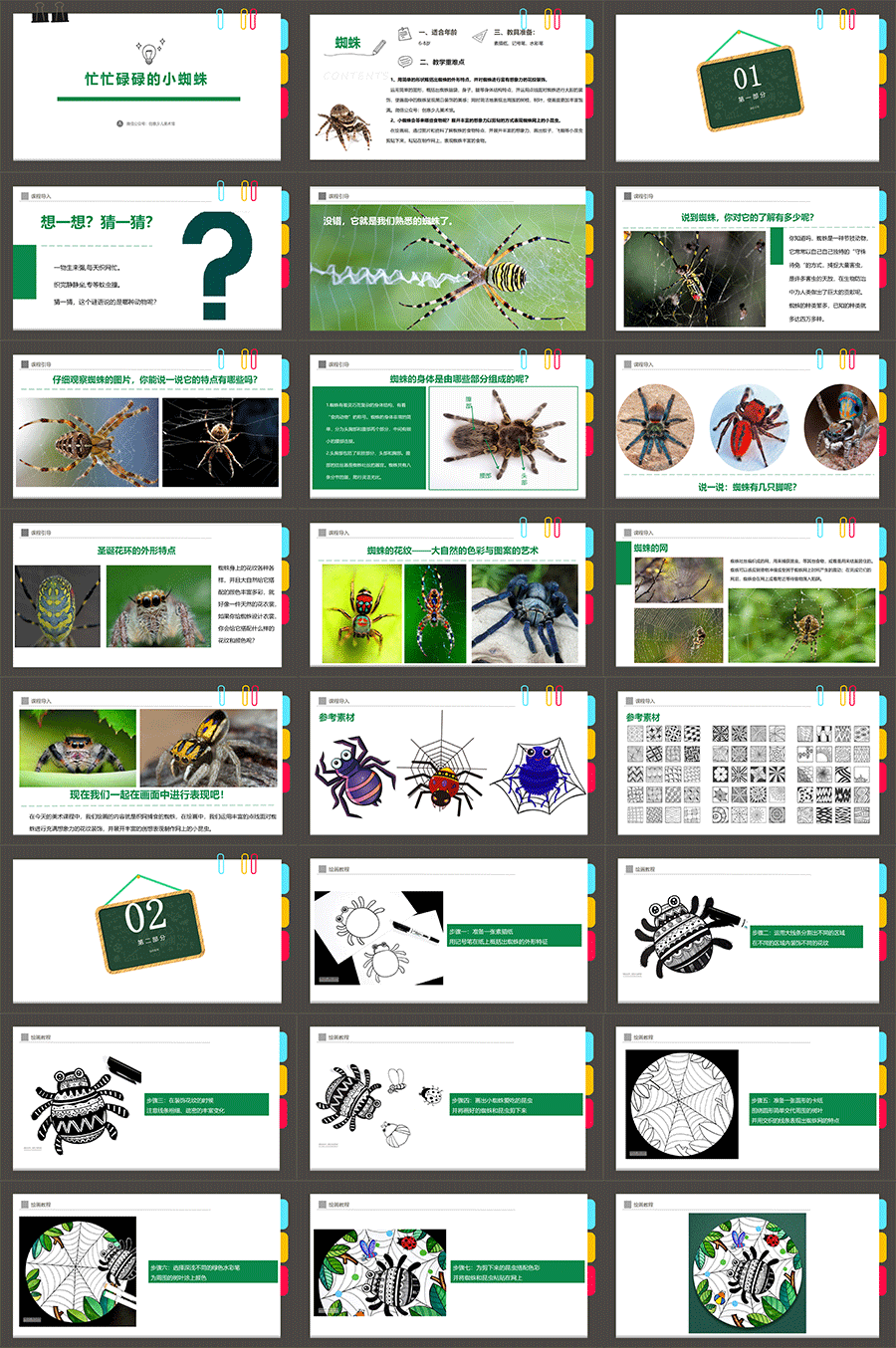 在绘画前,通过图片和资料了解蜘蛛的食物特点,并展开丰富的想象力,画出蚊子、飞蛾等小昆虫剪贴下来,粘贴在制作网上,表现蜘蛛丰富的食物。