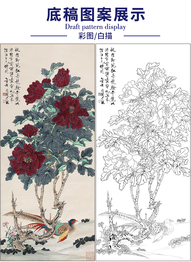 于非闇花鸟工笔画白描底稿《牡丹锦鸡》临摹勾线高清打印稿HS11