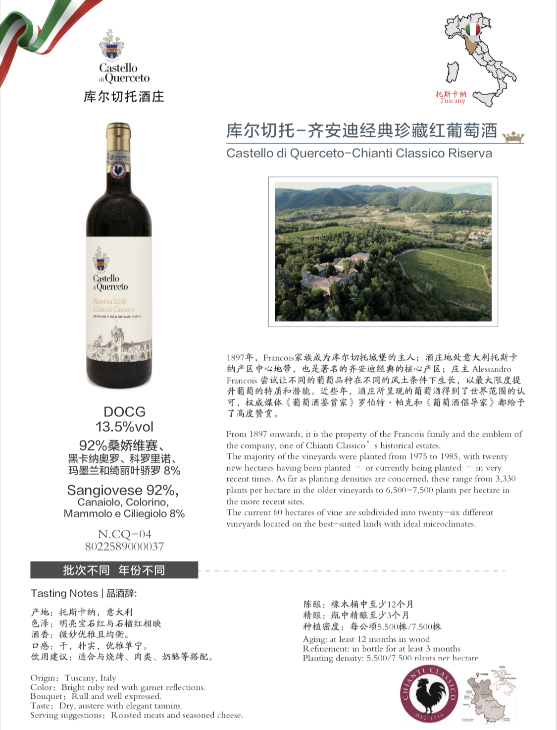 【经典产区】意大利 库尔切托 齐安迪经典珍藏干红葡萄酒