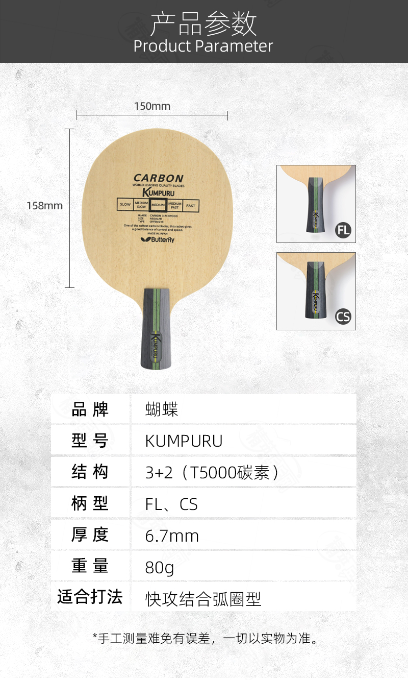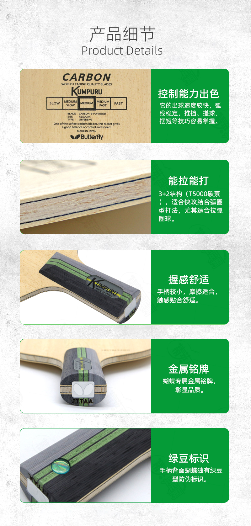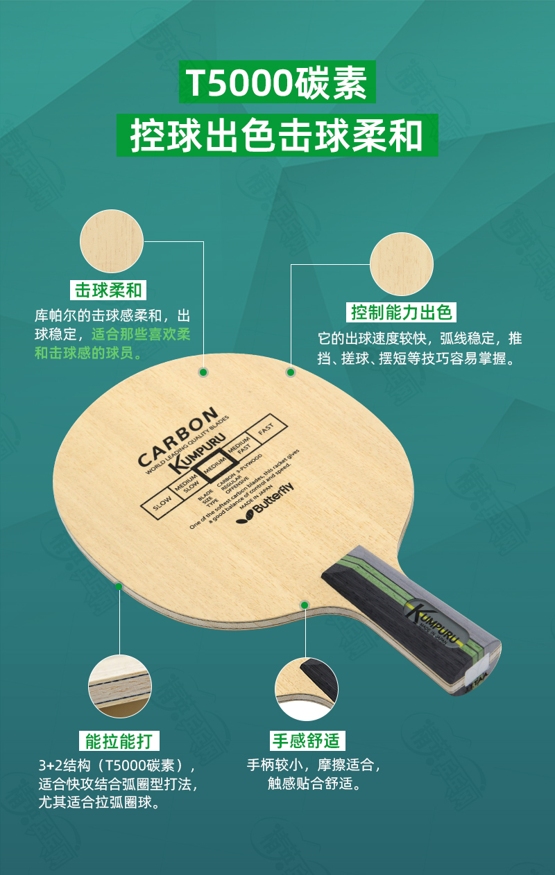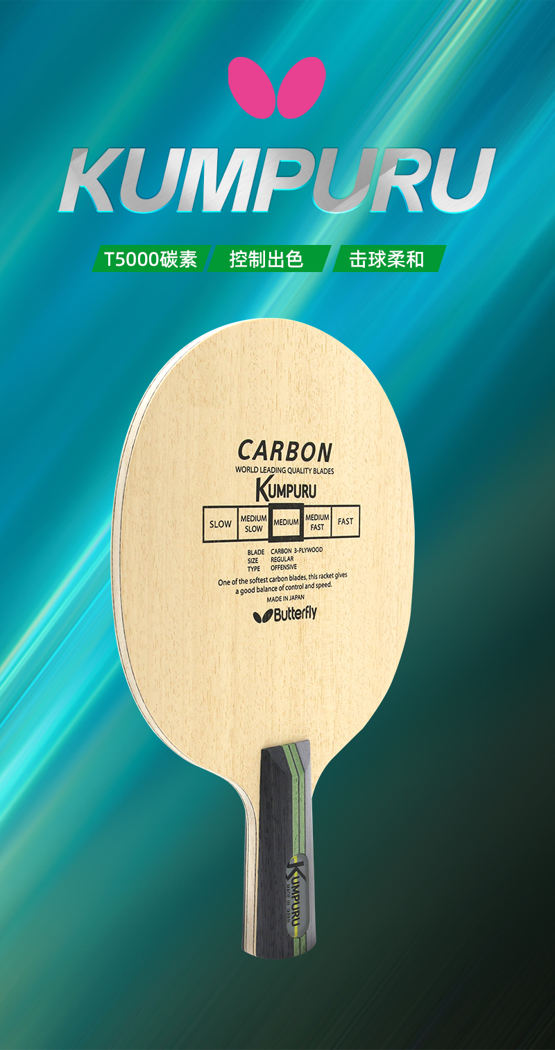 板的结构为3木2碳,属于柔中带刚性能均衡的弧圈板。面材较厚较软。手感柔和,吃球良好,小力量出球较稳有利控制。碳层直接代替了力材使板身厚度大大降低,甜区增大,板身的减薄使重量减轻,发力时板身形变加大,延长了持球时间,但没有OC那种振手感。大芯采用了拼接工艺,使弹性值更均匀。拍肩稍宽重心平衡,有利于摆速,和正反手的转换。同样是收腰柄,但收的幅度没有那么夸张,拇指和食指握拍部位做的稍粗使拍柄握起来很舒服。