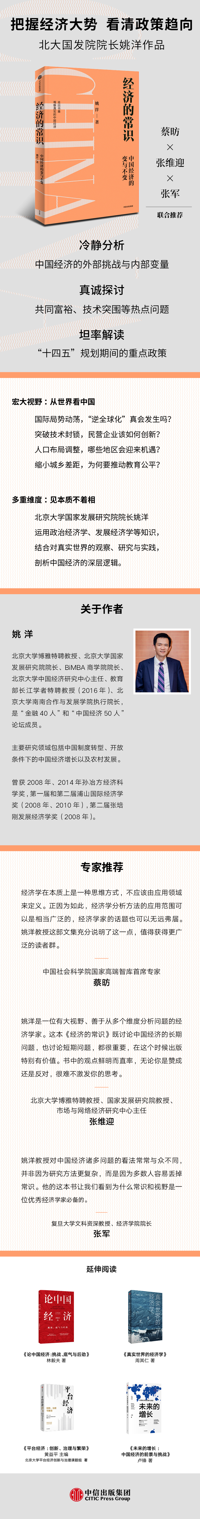姚洋是一位有大视野、善于从多个维度分析问题的经济学家。这本《经济的常识》既讨论中国经济的长期问题,也讨论短期问题,都很重要,在这个时候出版特别有价值。书中的观点鲜明而直率,无论你是赞成还是反对,很难不激发你的思考。