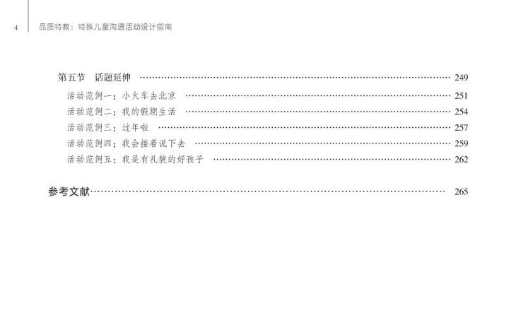 为特殊儿童更好的适应社会,教育者应根据特殊儿童的沟通特点,为他们设计有效且简洁的方式,增进其沟通效度。近年来,广州市教育研究院特殊教育科组织骨干教师,在特殊儿童沟通与语言疗育方面开展了系统、深入、持久的研究与实践。全书含绪论和初级、中级、高级三个阶段,沟通活动设计等四个章节。本书在活动设计环节,都按照课型、学情分析、活动对象基本情况、活动目标、材料准备、活动过程、注意事项、延伸活动等几个部分设计,务求科学、规范、详尽,为一线教师的教学提供可直接借鉴的参考素材。