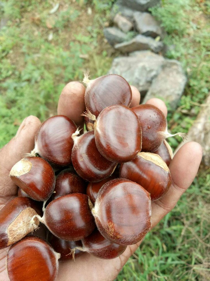 板栗园子采用自然农法生产,每年农历7月底人工除草覆盖,无任何投入品,不使用肥料,主要依赖降雨灌溉,合作农户的板栗树也已经三年以上进行生态种植。板栗自然成熟后掉落地上,人工拾捡、挑拣。