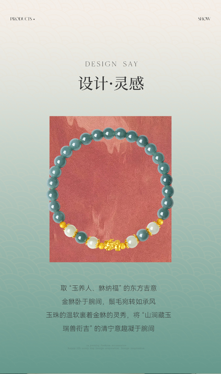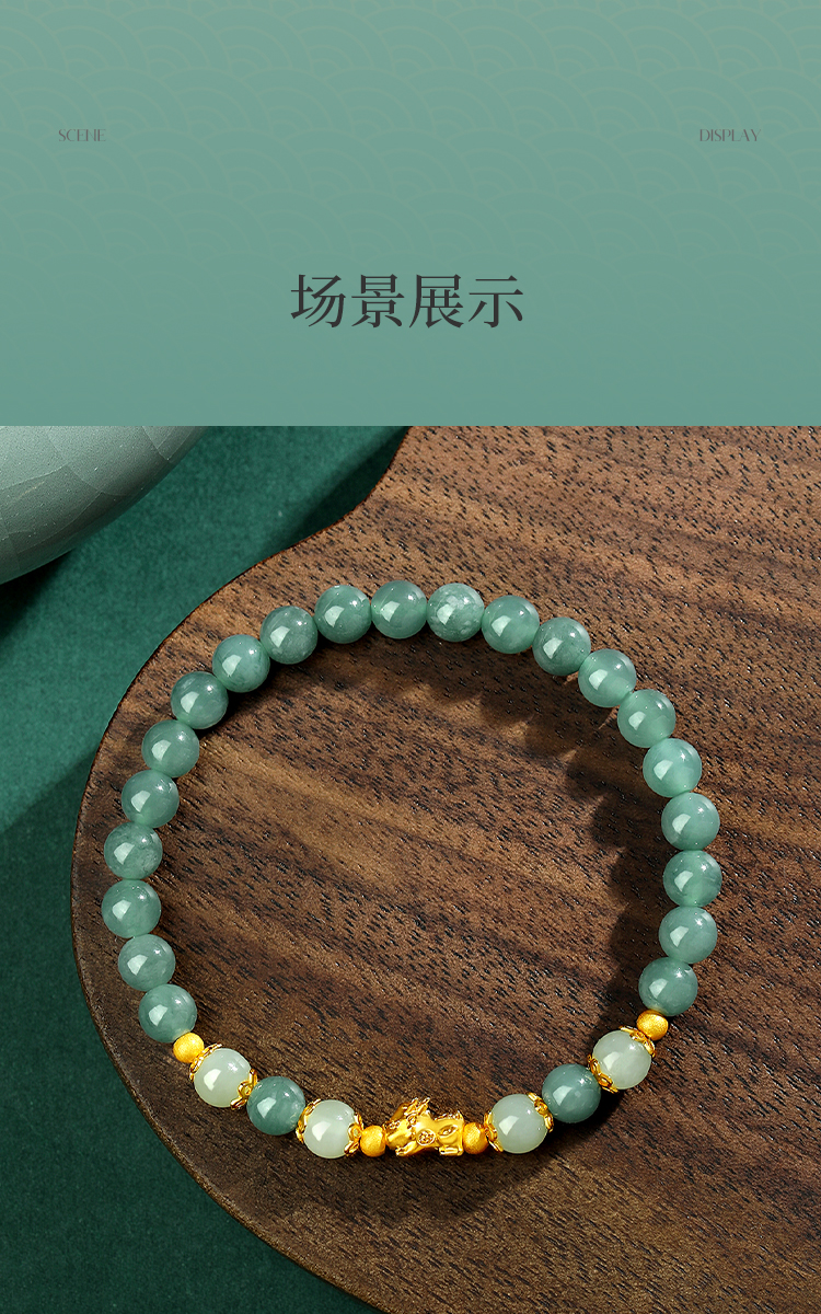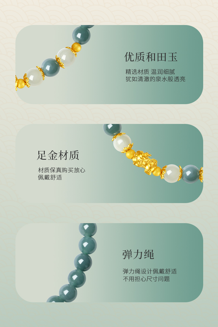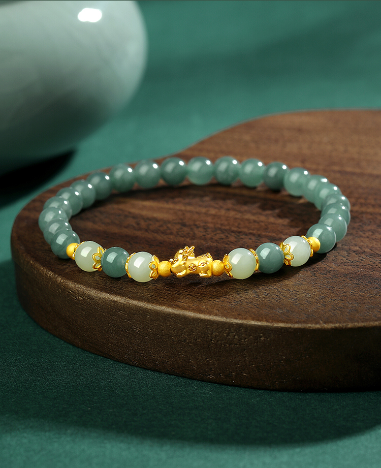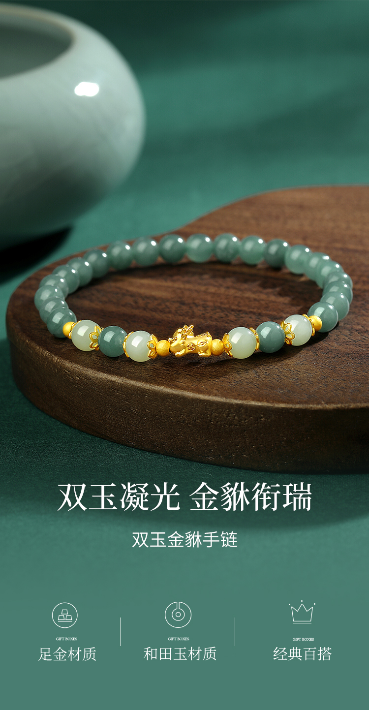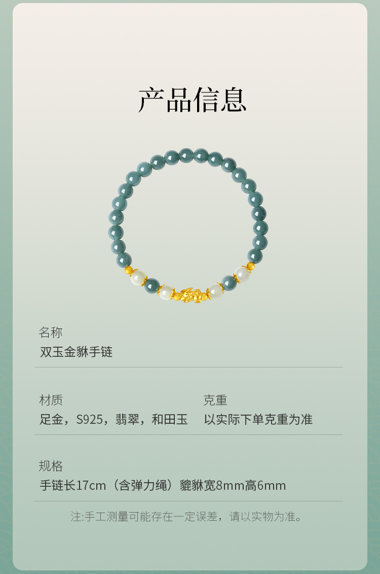 Winy 足金招财貔貅双玉手链 925银+油青翡翠 + 和田玉手串 送女友送妈妈节日礼物
