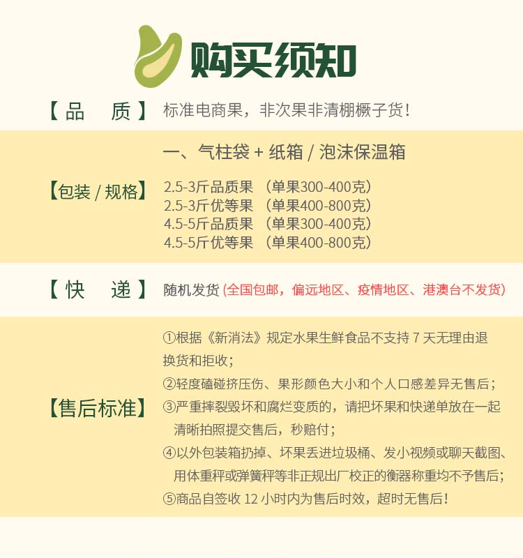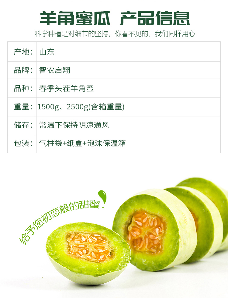 | 【品名】羊角蜜甜瓜 【规格】 净重3斤装(2-5个) 净重4.5斤装(4-7个) 【发货包装】普箱+气柱袋+网套 【产地/发货地】山东潍坊 【发货快递】中通 【发货区域】新疆、西藏、海南、港澳台不发货。 【补邮费地区】青海、内蒙、甘肃、宁夏+2元,北京、上海+1元 【发货时效】48小时,周末节假日顺延 【温馨提示】羊角蜜稍微放1~2天会更甜,但口感会变软,如果喜欢脆爽口感,收到建议立即食用,或者放冰箱保鲜! |