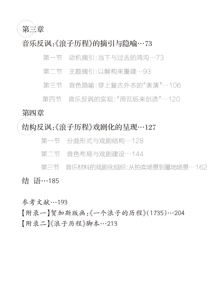 本书所要阐明的是“反讽诗学”下的《浪子历程》,其音乐材料如何配合脚本呈现出歌剧化的戏剧音乐形态,而音乐材料在承载戏剧的同时,又怎样产生独立于戏剧音乐以外的话语,两股“不相为谋”的线索如何在一部歌剧中共存和交汇,即全面地、系统地、多维地、立体地剖析这部歌剧的组织形式。在此基础之上对新古典主义的核心技法和创作观念进行解读和评判,同时,将《浪子历程》置于二十世纪歌剧发展的大背景中,观察其双向写作的方式如何作用于歌剧形态的变迁,进而论述歌剧形态变迁的原因及历史影响。