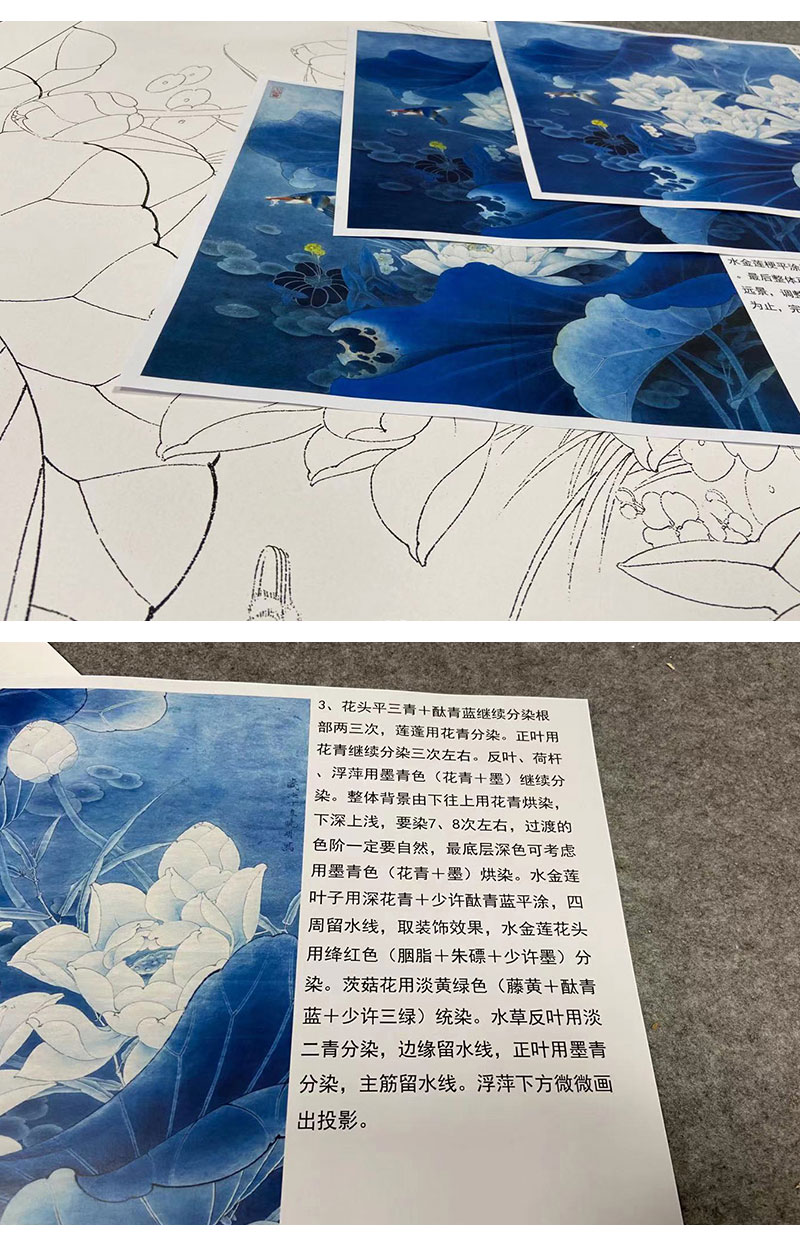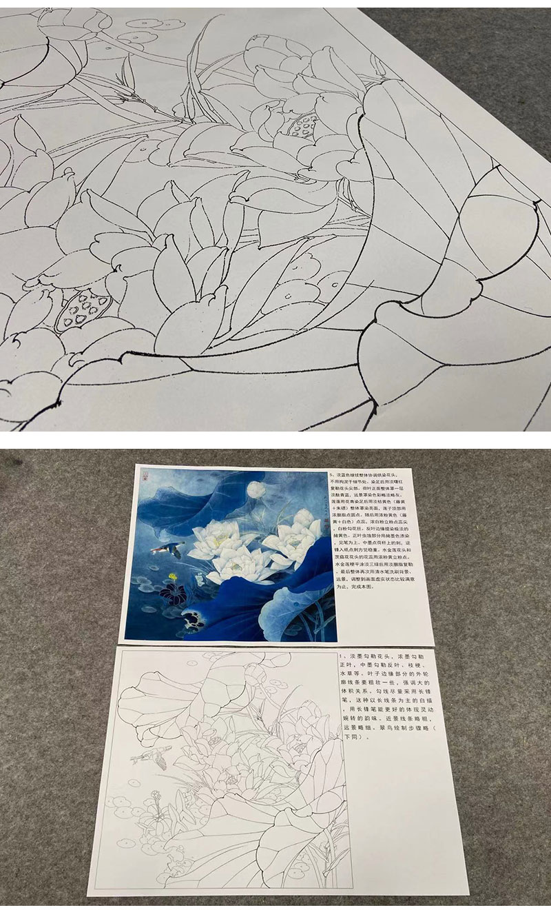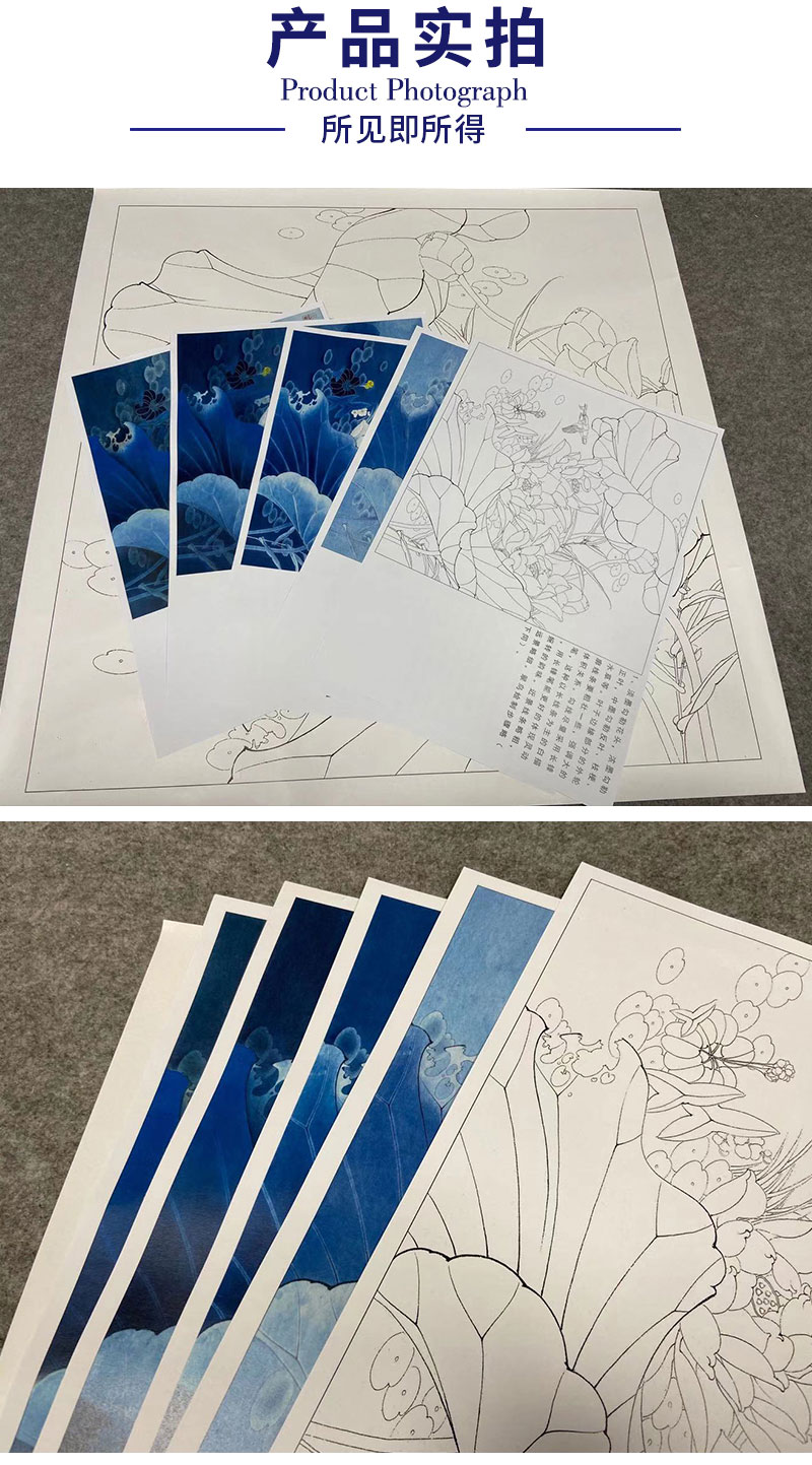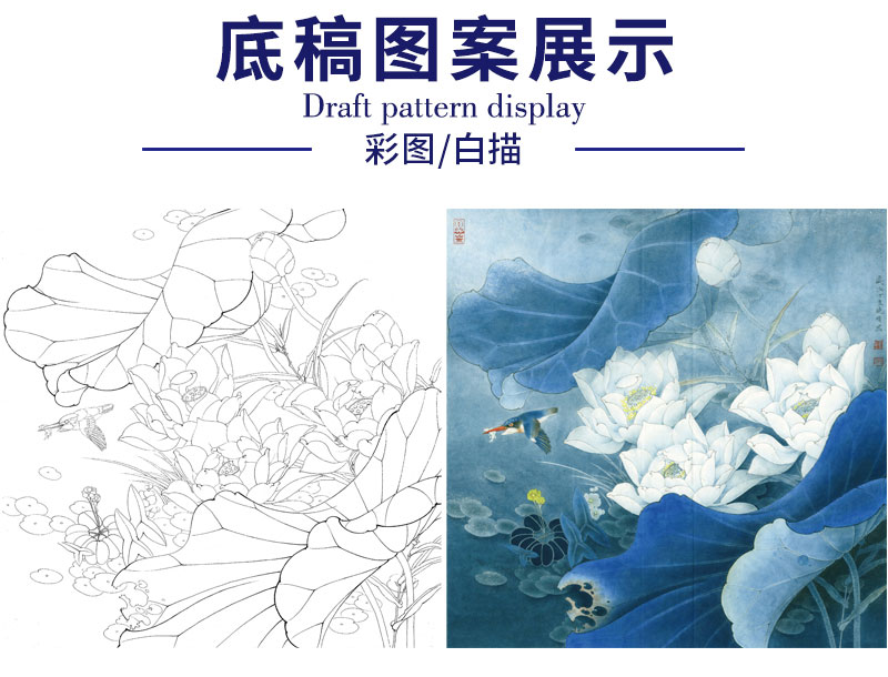 【有步骤、大彩图】李晓明工笔画白描底稿斗方小品《白荷蓝翠图》荷花翠鸟初学者临摹花鸟线稿KE03