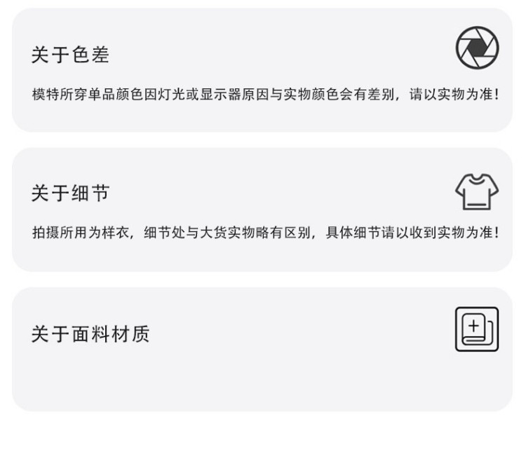 ②针织/服装类务必及时签收,及时验货,确认货物无误后再拆除吊牌,切勿水洗,水洗不再售后。