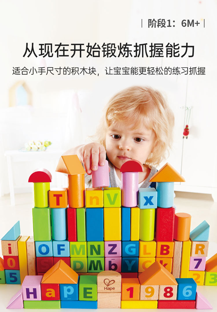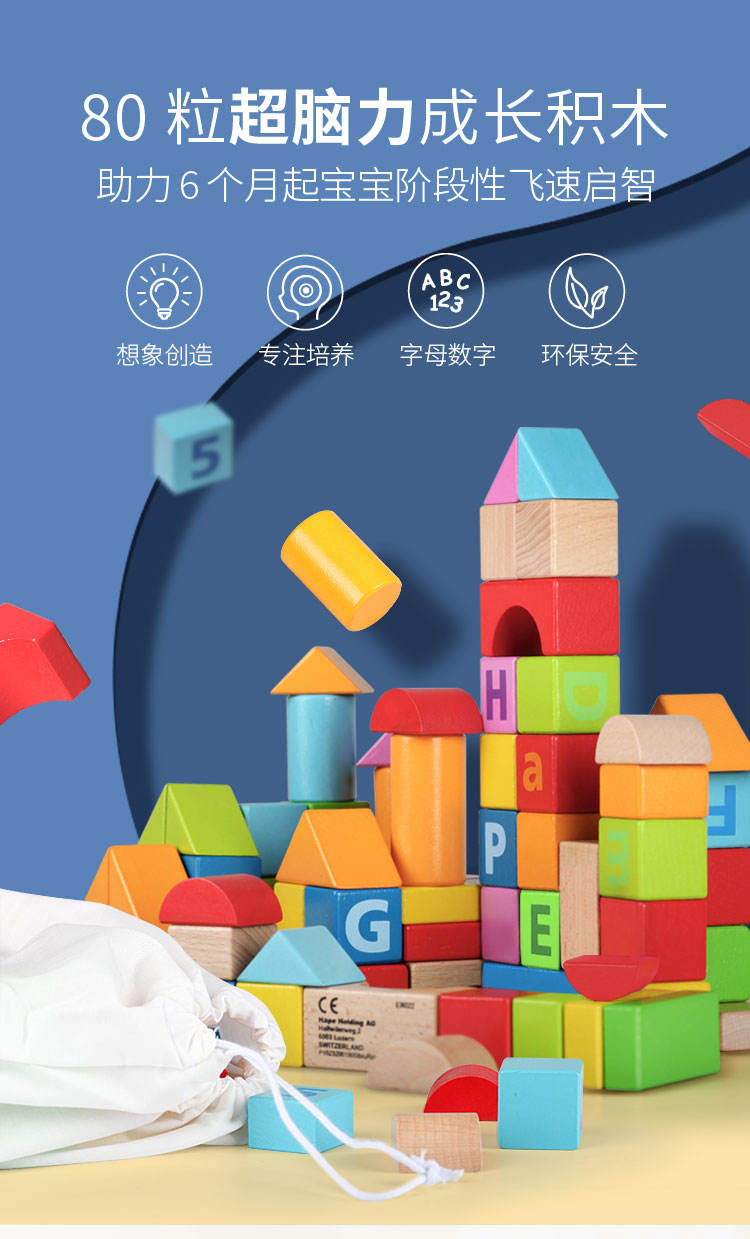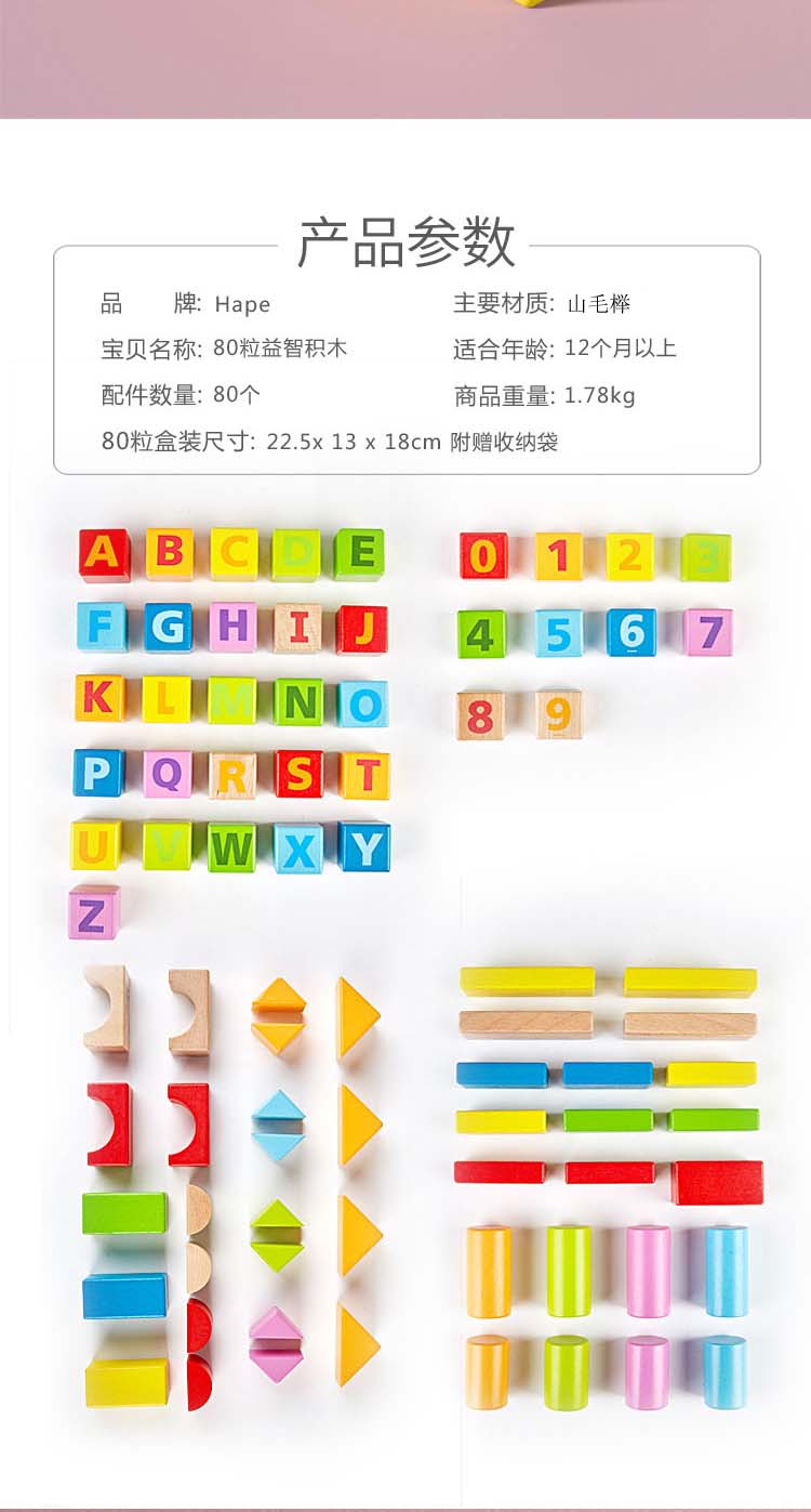 Hape木质积木 大颗粒盒装木头宝宝拼装玩具1-3岁男女小孩儿童礼物 80粒盒装积木E8022
