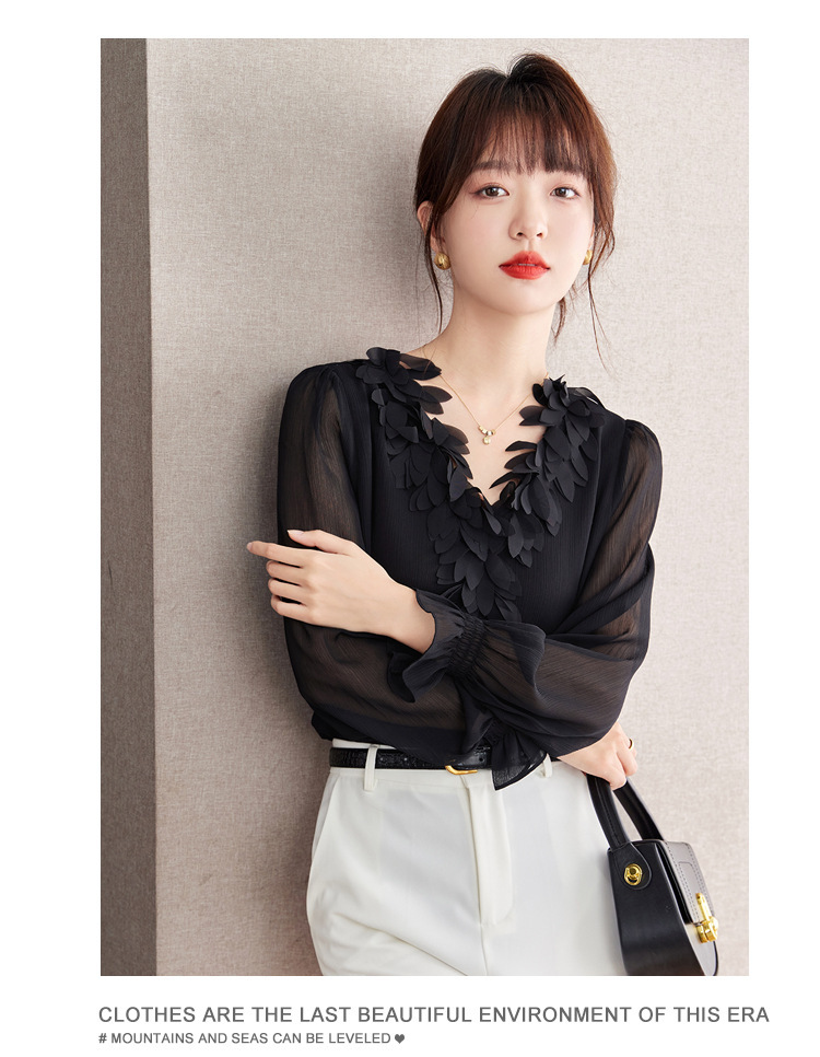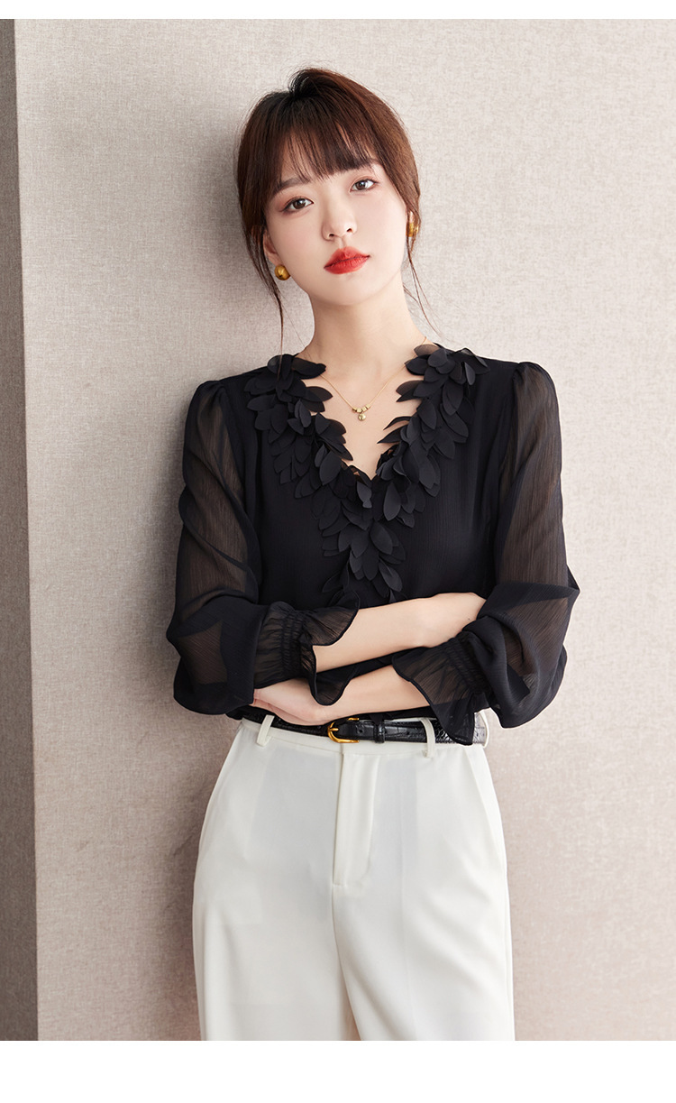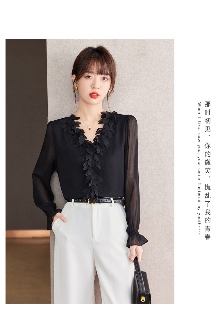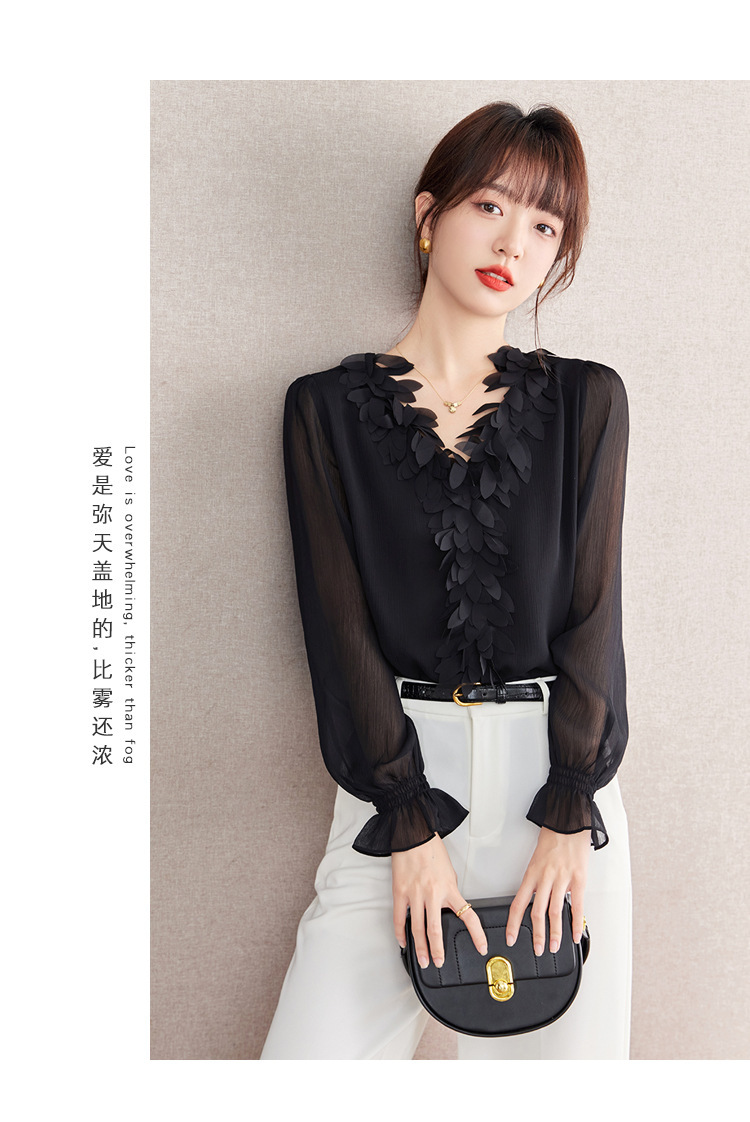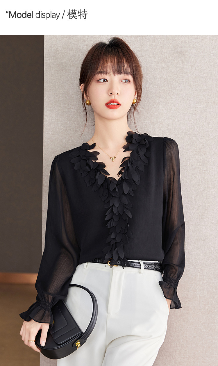 重工花瓣V领浪漫法式上衣,通勤气质雪纺衫KQL-604TA2837
