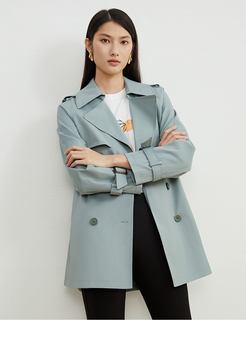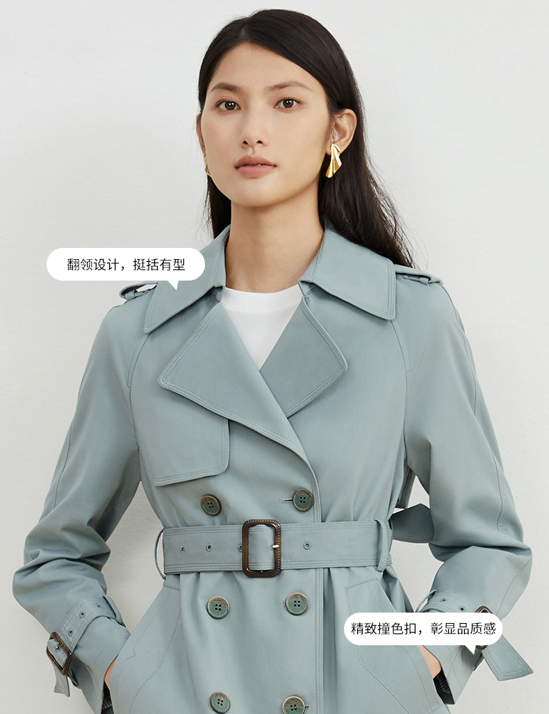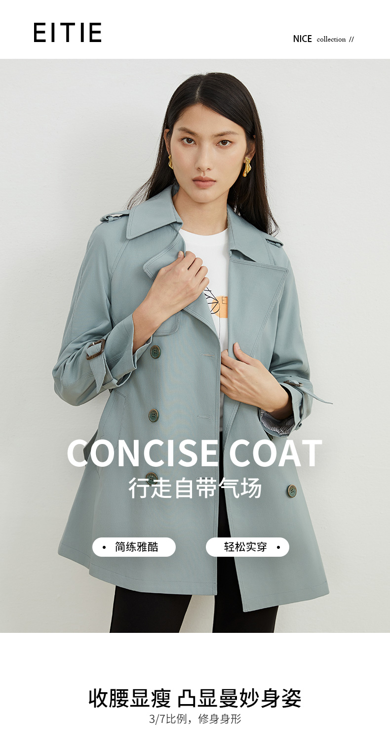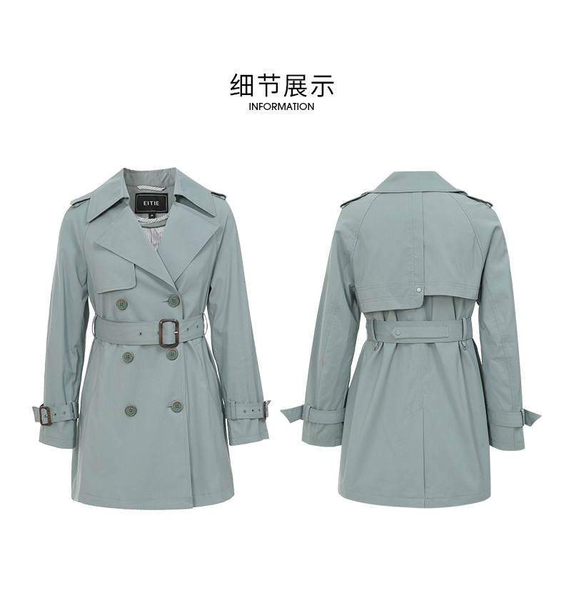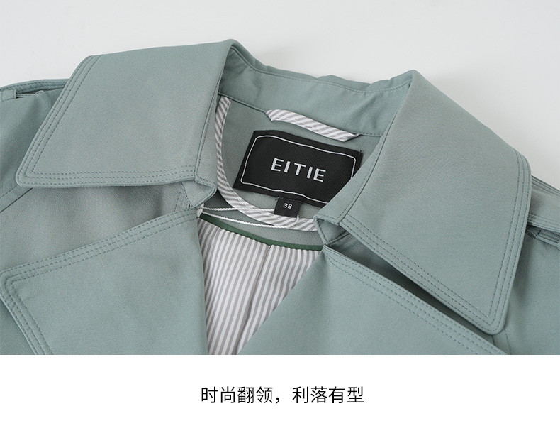 EITIE爱特爱秋季新款经典双排扣显瘦通勤蓝色a字收腰风衣外套C2204006