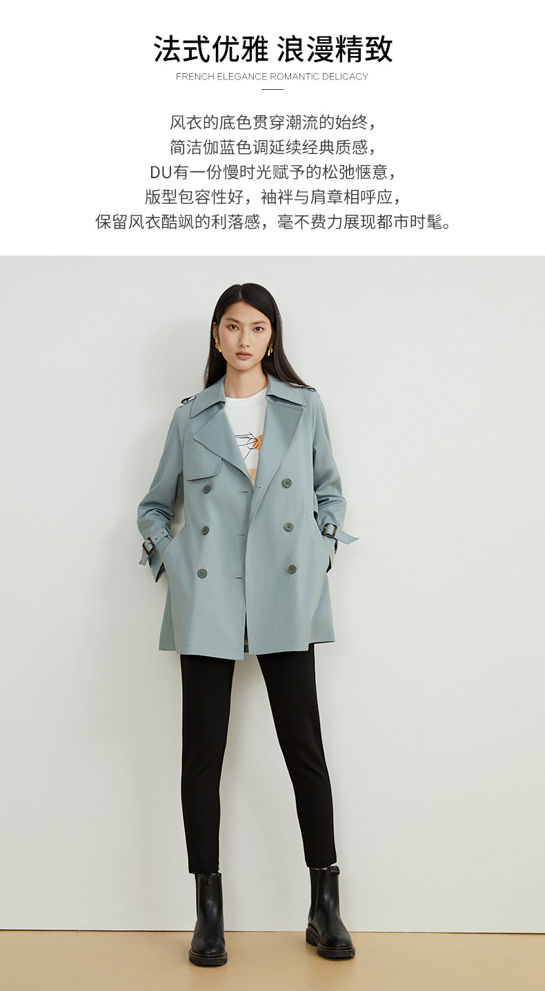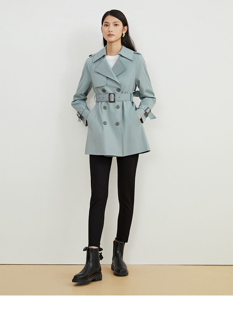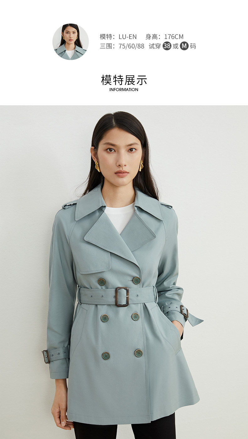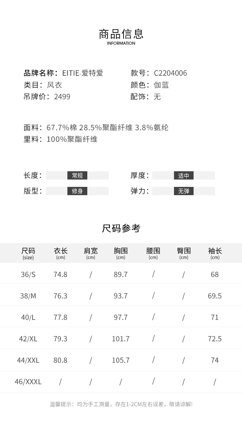 EITIE爱特爱秋季新款经典双排扣显瘦通勤蓝色a字收腰风衣外套C2204006