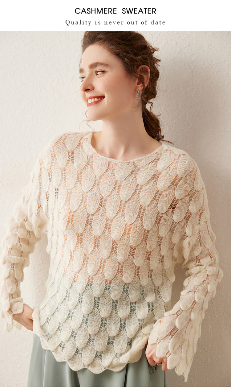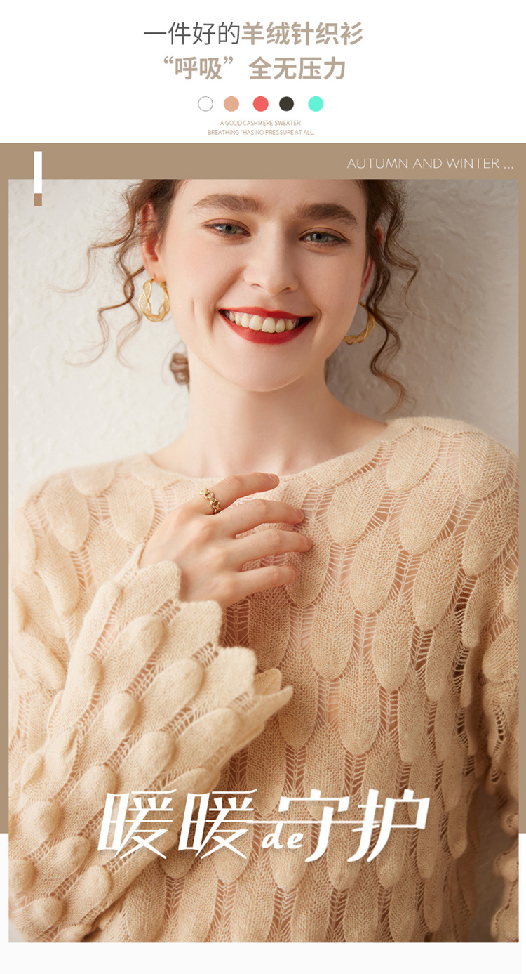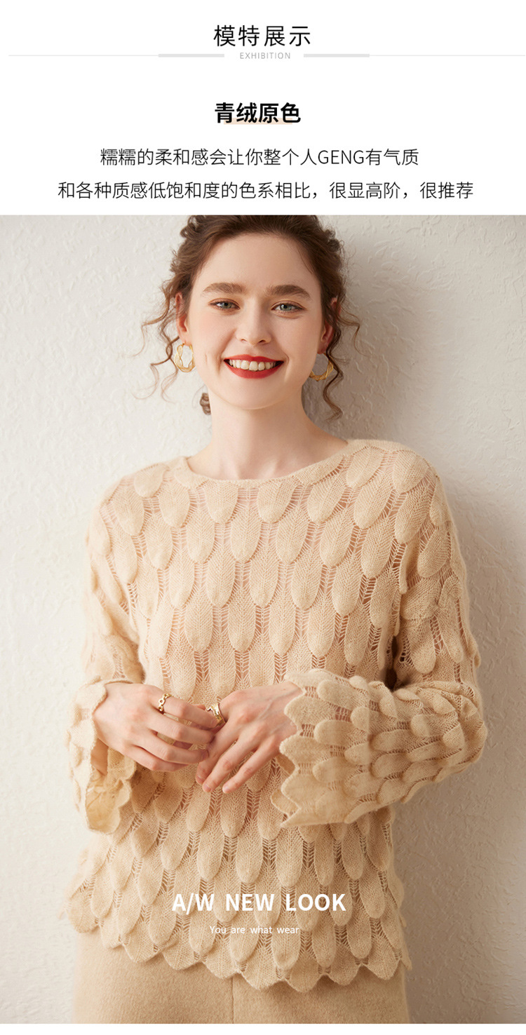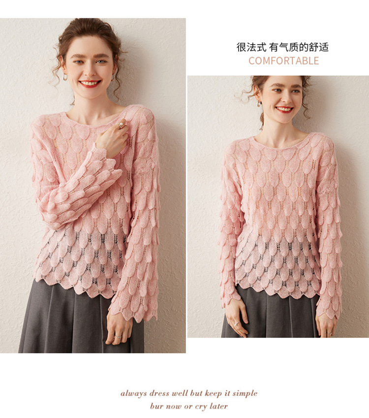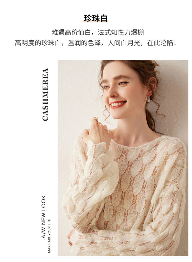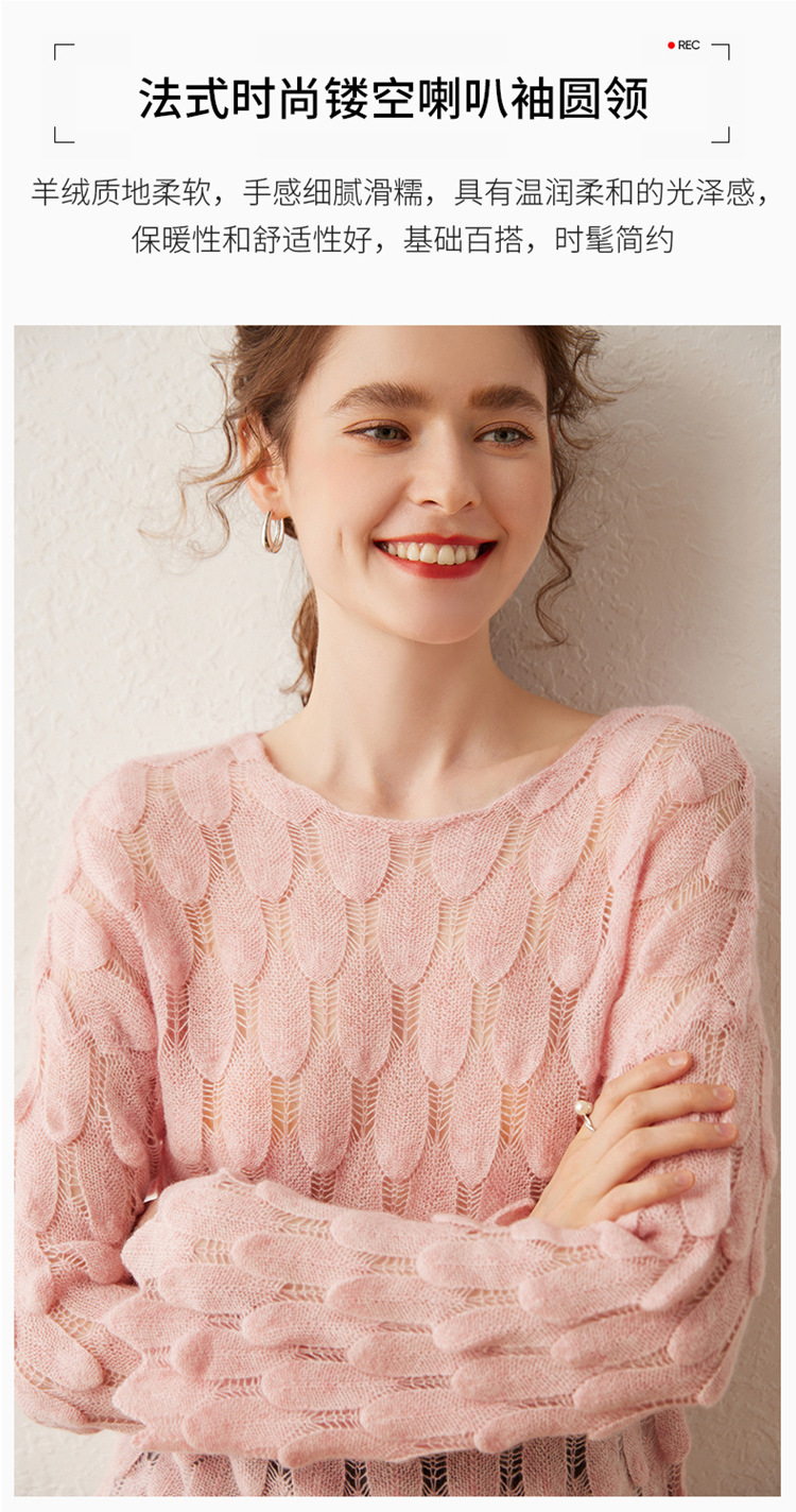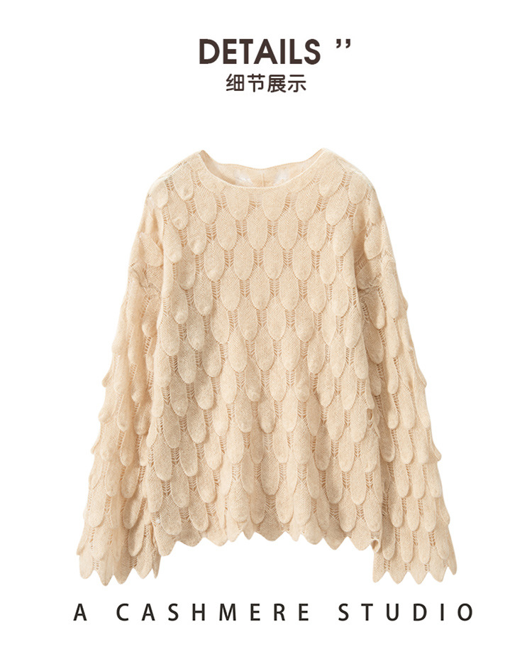 雀说山羊绒罩衫圆领长袖镂空羽毛针织衫上衣新款薄款套头休闲新款毛衣AL8745