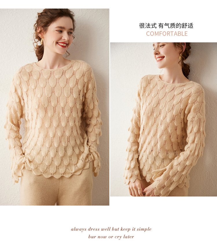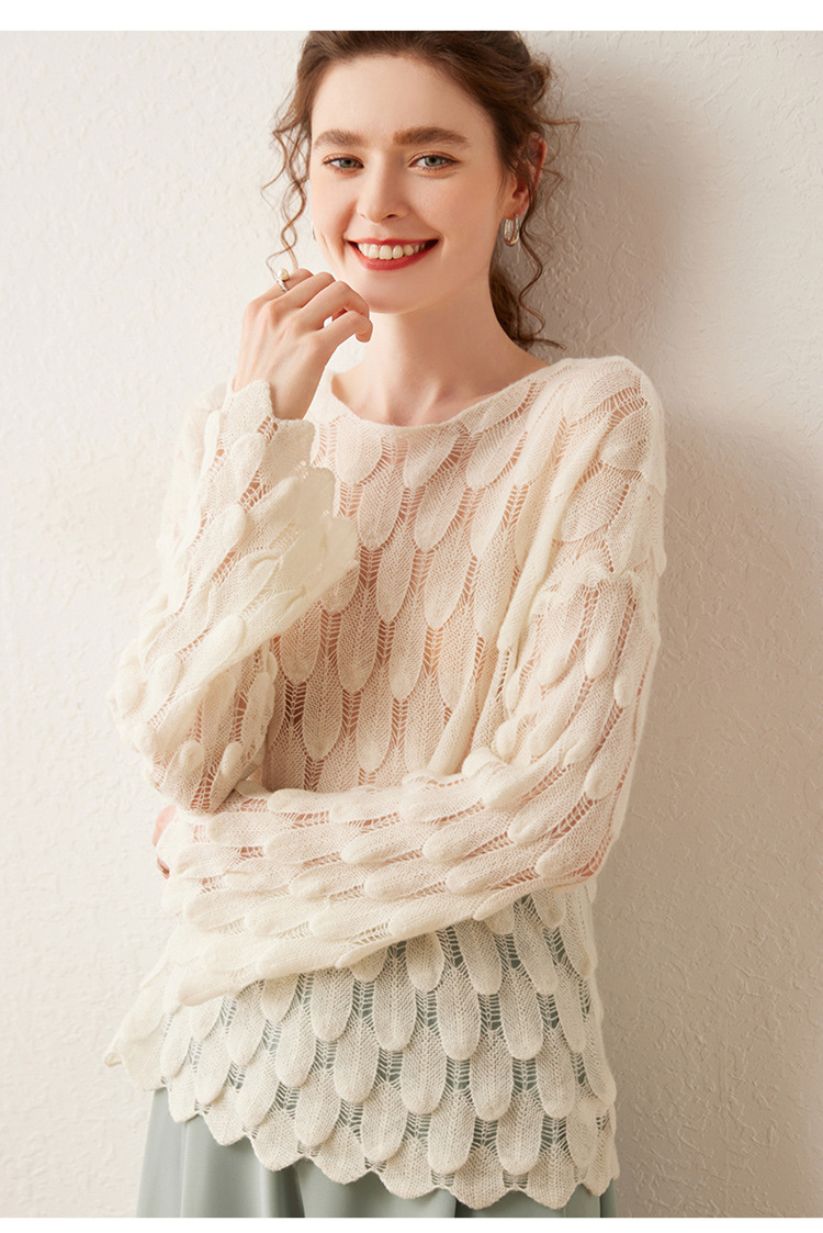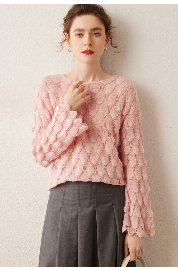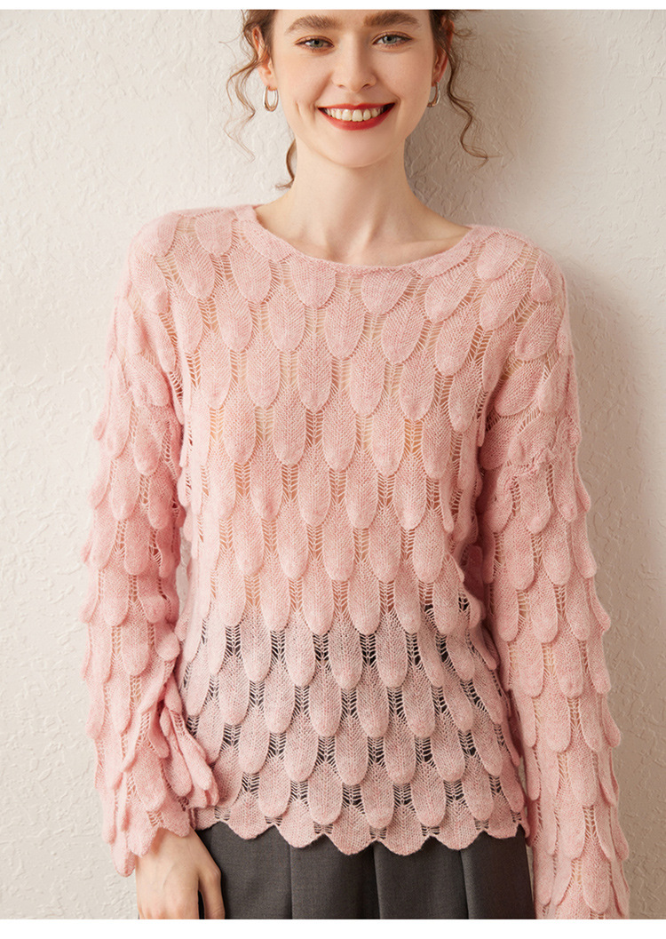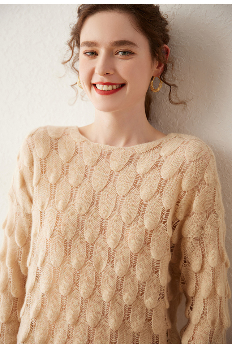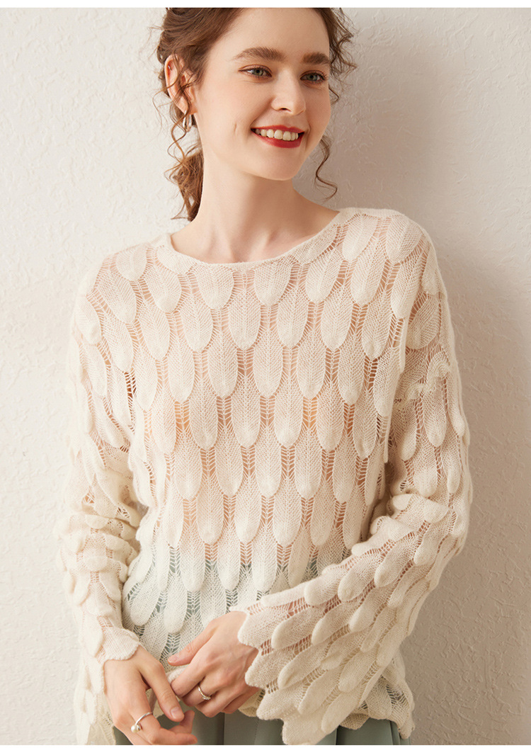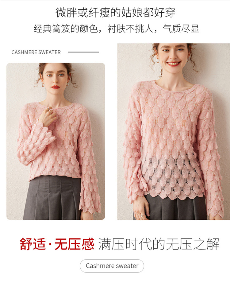 雀说山羊绒罩衫圆领长袖镂空羽毛针织衫上衣新款薄款套头休闲新款毛衣AL8745
