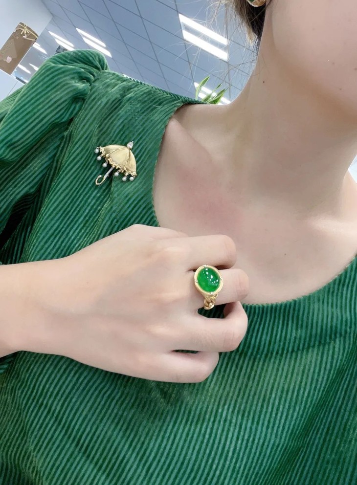 谢谢两位名字里有青的姐妹,给了我们这么长的时间来等待雨滴雨伞作品的调试和诞生。从创意到成品,足足用了大半年的时间。中间对于肌理和褶皱的不满意让我一改再改,到推翻重做。后来又有时光沙漏群友们的集思广益,把雨伞“拆分”了素金的工艺部分,素金珍珠钻石的小雨伞,有种华盖般的宝气,又突破了对翡翠原料的限制。