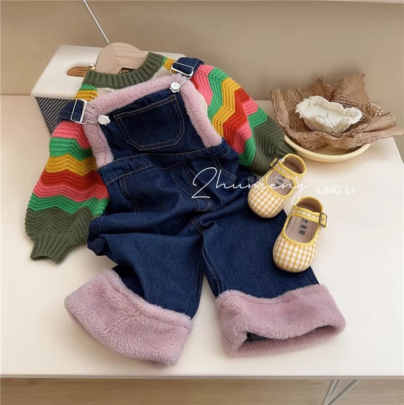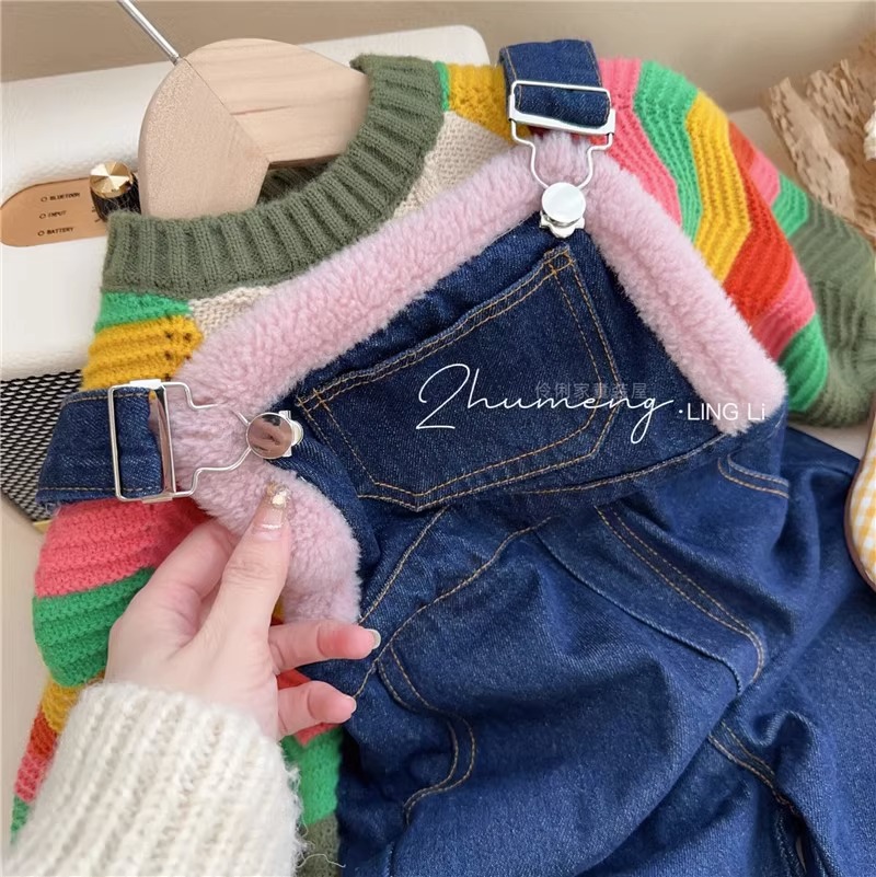 【俏皮活泼套装!时尚潮流】朵丫春季新款女童撞色波浪灯笼袖,毛衣羊羔毛牛仔背带裤,舒适包裹