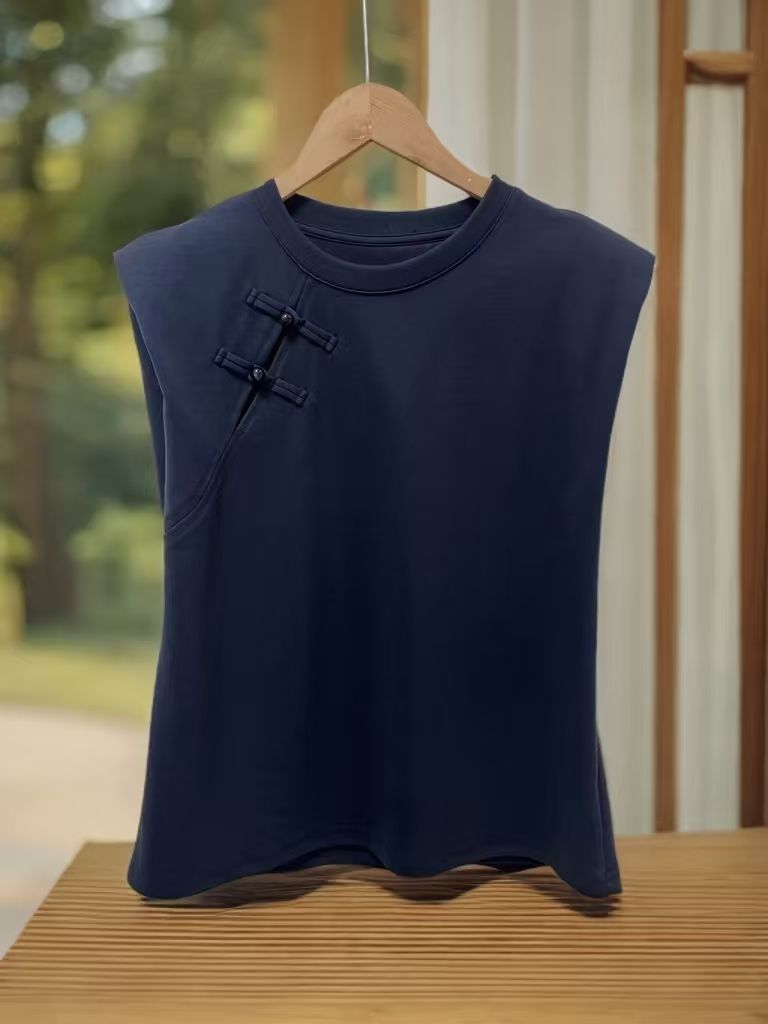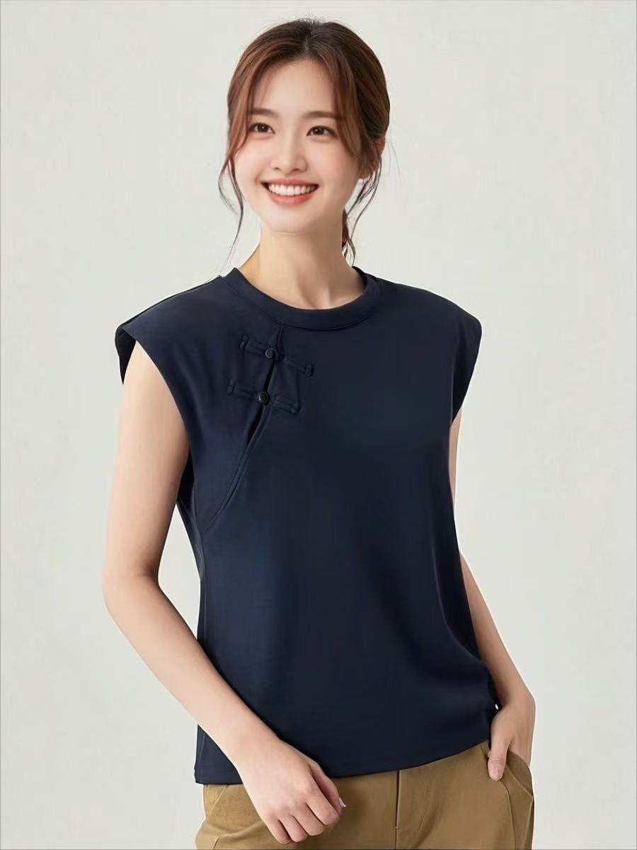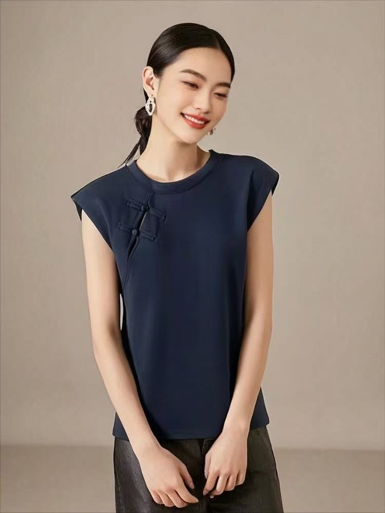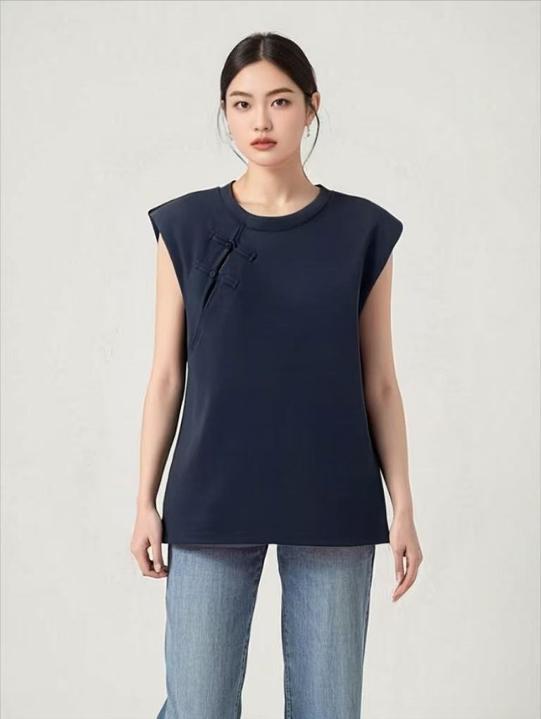 【新品特卖】藏青国风盘扣无袖垫肩短袖T恤-喜出