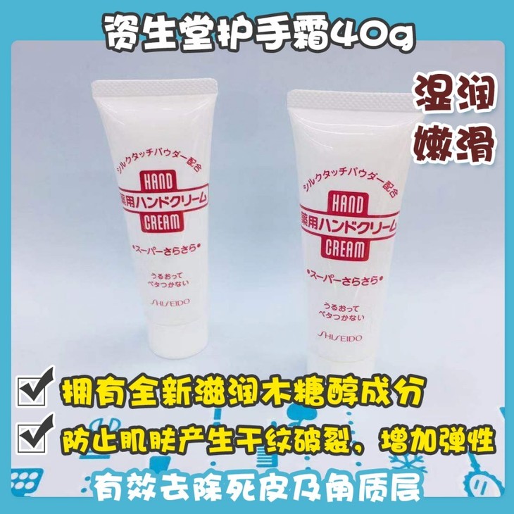 资生堂护手霜40g#白👍拥有一双娇嫩柔滑的玉手🙌,是每一位女性的梦想哦👼。这款白色采用不粘腻的水质配方💧,持久保持肌肤爽滑质感🌬,所以不会油腻,是较为清爽滴🍃~拥有全新滋润木糖醇成分,保湿功能很优秀💦!还可以有效❌防止肌肤产生干纹破裂,增加弹性〽,有效去除死皮及角质层,使你的玉手长久保持湿润嫩滑,富有弹性之光泽✨!秋冬来临之际🍁,护手霜必须囤起来呀~