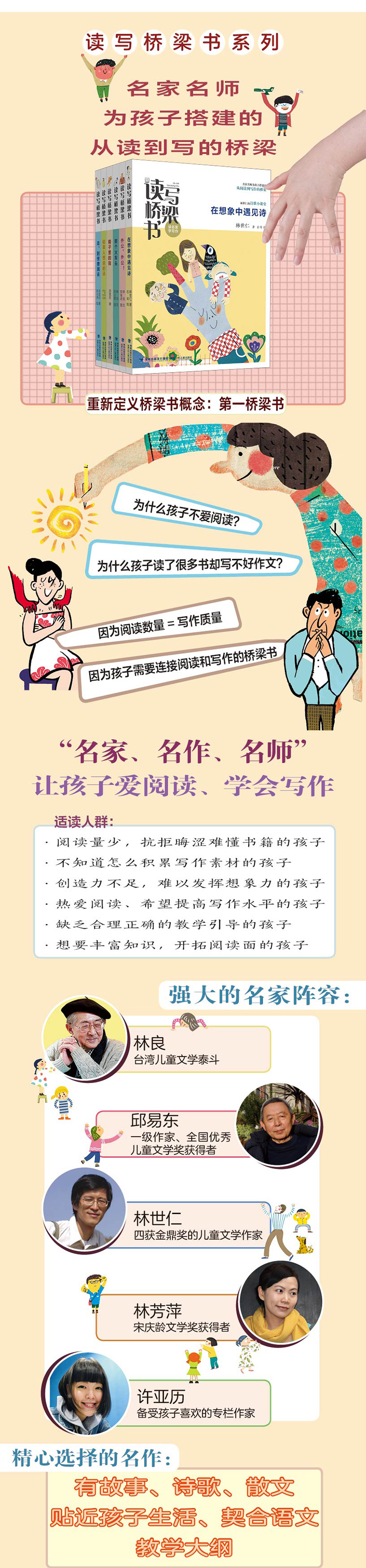 “读写桥梁书”系列集台湾儿童文学**林良,**作家、全国优秀儿童文学奖获得者邱易东,四获金鼎奖的儿童文学作家林世仁,宋庆龄文学奖获得者林芳萍和备受孩子喜欢的专栏作家许亚历五位名家的名作,**儿童阅读研究者王林倾情作序,桂文亚、王淑芬等**儿童文学作家联袂**,丁云、罗娟、陈峥、雷劲等一线名师纸上授课。每个学龄男孩女孩都应该拥有这套连接阅读和写作的桥梁书,收录散文、诗歌、写作指南,涵盖创作、思考、想象、词句积累等多种维度,手把手指导孩子从阅读到写作全面提高。《在想象中遇见诗》
