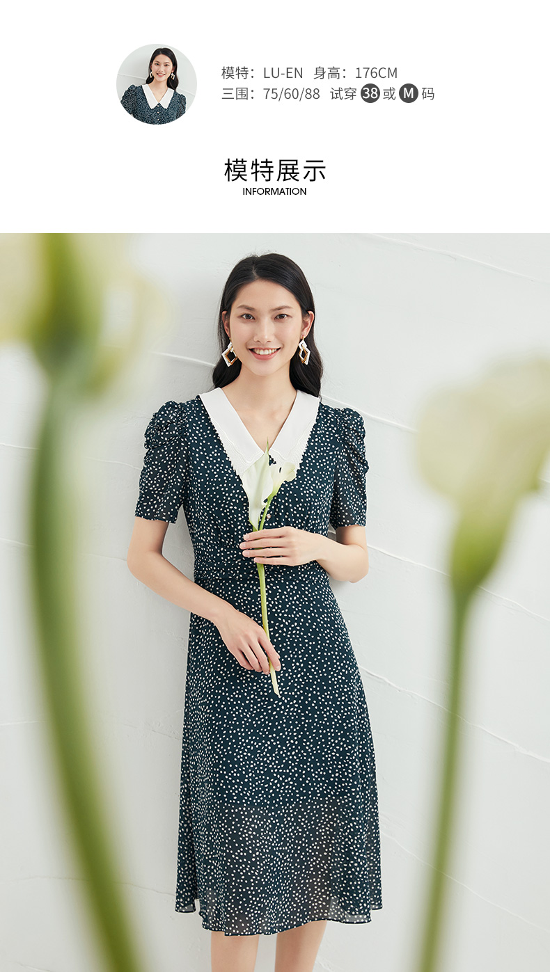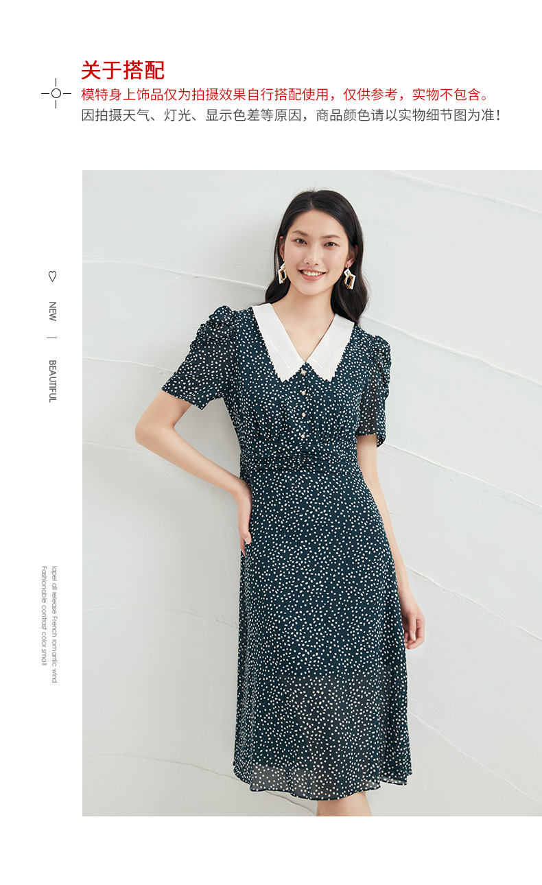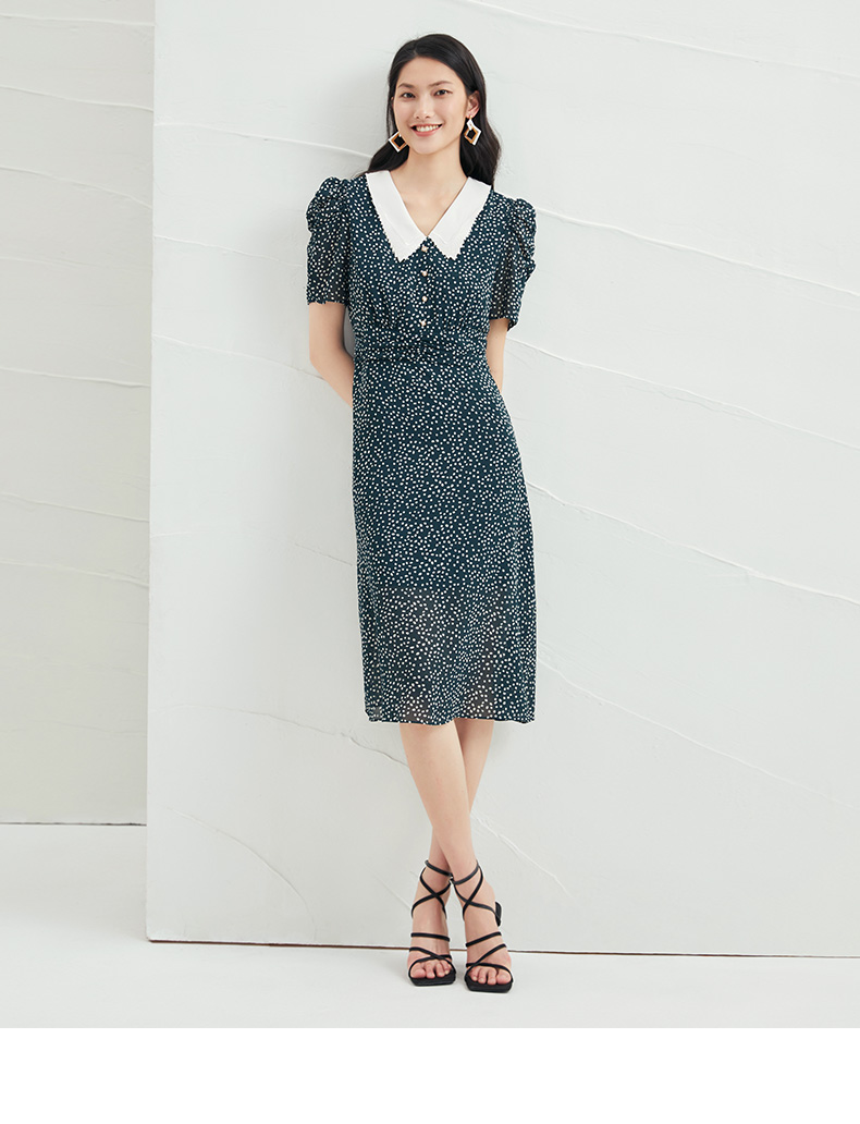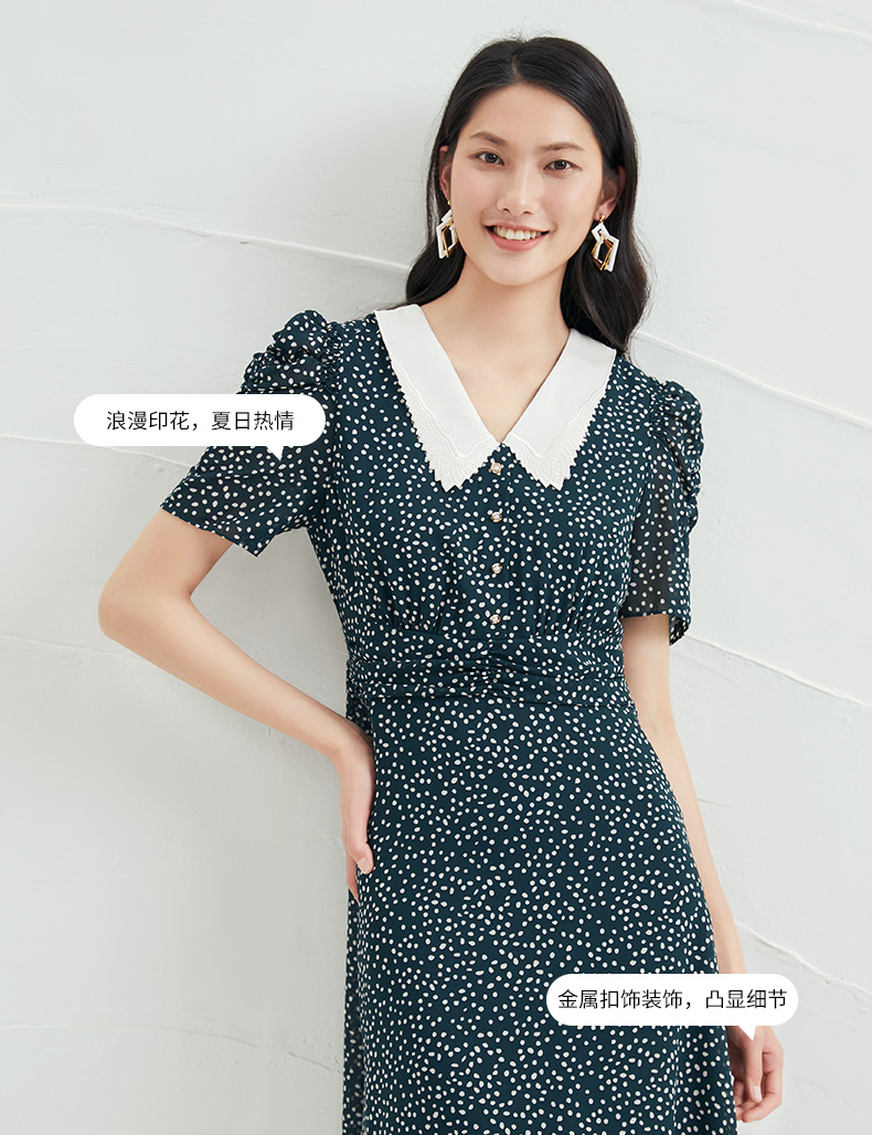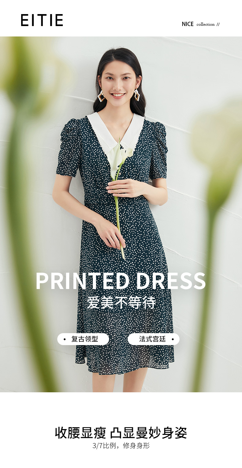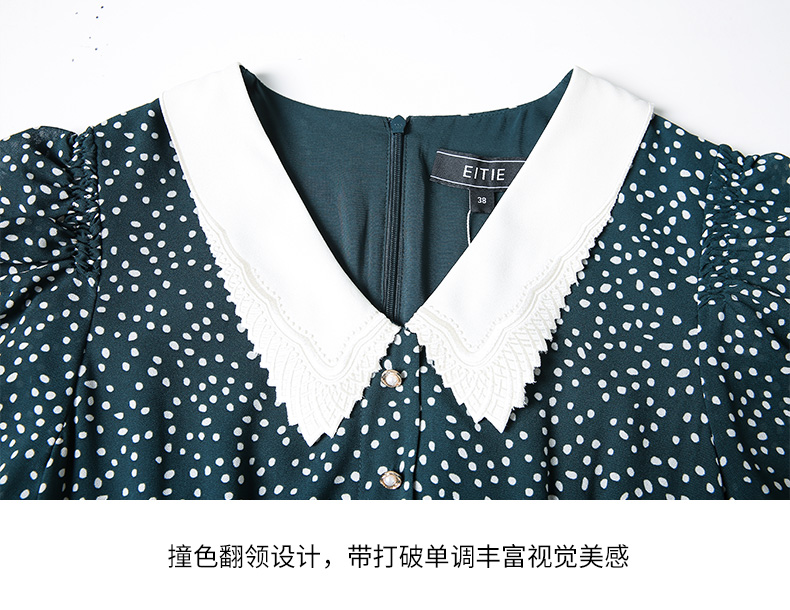 EITIE爱特爱夏季新款娃娃领波点中长款收腰泡泡袖连衣裙6607325