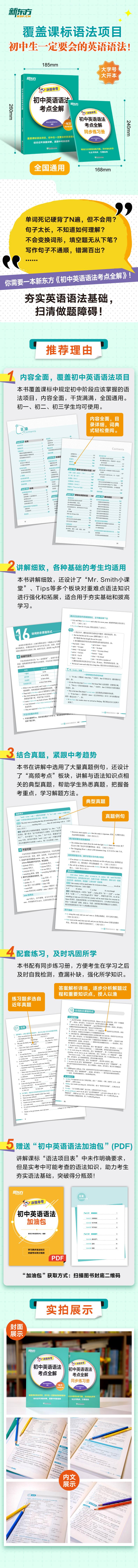 《初中英语语法考点全解》是新东方考试研究中心为广大初中生量身打造的旨在夯实英语基础的语法专项图书。全书覆盖《义务教育英语课程标准》(2022年版)(以下简称“课标”)中列出的初中阶段应掌握的所有语法项目,且顺序也与课标一致,方便初中生对照课标,逐一、全面地进行语法专项学习。具体而言,全书讲解细致,除了常规的讲解和例句之外,书中还融入了表格,对重要知识进行系统归纳;“高频考点”讲解与语法知识点相关的典型真题,强化重要考点;“Mr. Smith小课堂”进一步拓展重要的语法知识点;“Tips”对讲解中涉及的细小知识点作额外补充;“思维导图”对单元内所讲知识进行系统梳理。此外,本书还配有同步练习册,方便学生在学习后通过练习检测学习效果,及时查漏补缺。本书另外赠送《初中英语语法加油包》(PDF),对课表中未作明确要求,但是实际考试中仍可能涉及的语法项目进行补充讲解,方便学有余力的学生进行拔高学习,突......