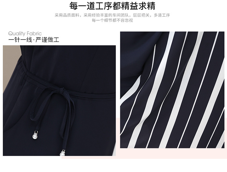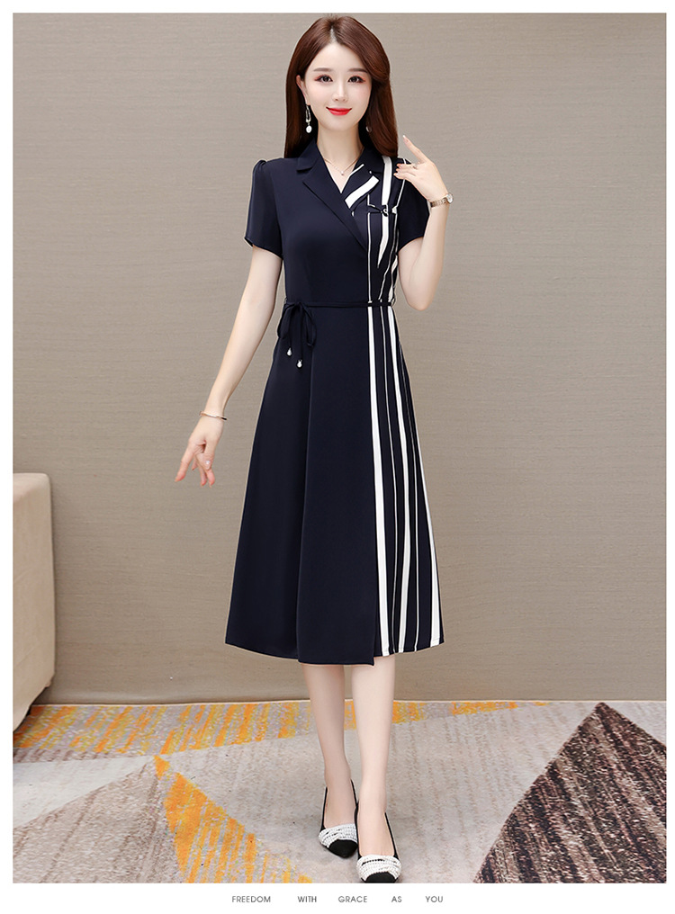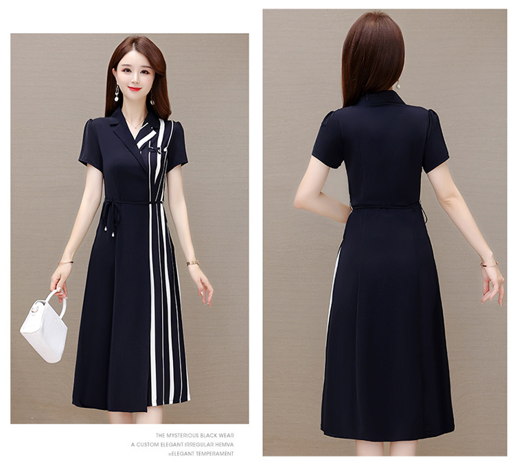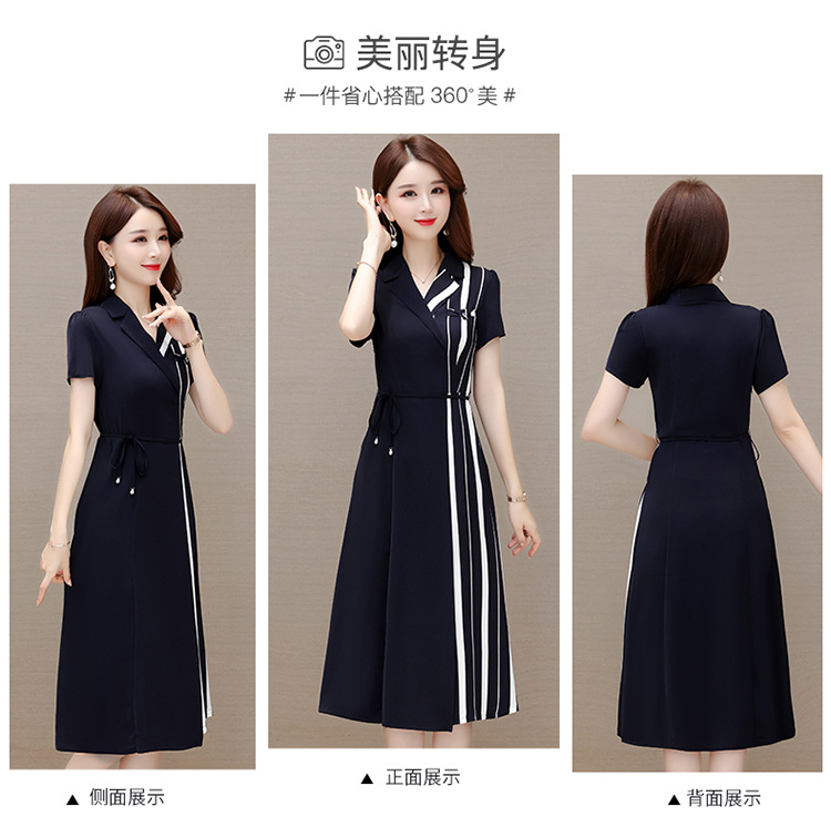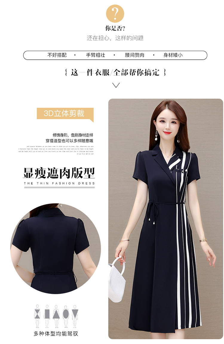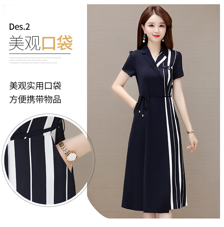 QYMXYKL-JSK2318-L 条纹简约拼接系带收腰通勤时尚雪纺裙2023年夏款短袖气质连衣裙